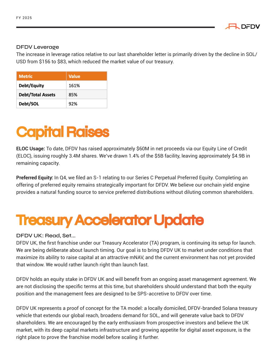 DFDV Leverage The increase in leverage ratios relative to our last shareholder letter is primarily driven by the decline in SOL/ USD from $156 to $83, which reduced the market value of our treasury. ELOC Usage: To date, DFDV has raised approximately $60M in net proceeds via our Equity Line of Credit (ELOC), issuing roughly 3.4M shares. We’ve drawn 1.4% of the $5B facility, leaving approximately $4.9B in remaining capacity. Preferred Equity: In Q4, we filed an S-1 relating to our Series C Perpetual Preferred Equity. Completing an offering of preferred equity remains strategically important for DFDV. We believe our onchain yield engine provides a natural funding source to service preferred distributions without diluting common shareholders. DFDV UK: Read, Set... DFDV UK, the first franchise under our Treasury Accelerator (TA) program, is continuing its setup for launch. We are being deliberate about launch timing. Our goal is to bring DFDV UK to market under conditions that maximize its ability to raise capital at an attractive mNAV, and the current environment has not yet provided that window. We would rather launch right than launch fast. DFDV holds an equity stake in DFDV UK and will benefit from an ongoing asset management agreement. We are not disclosing the specific terms at this time, but shareholders should understand that both the equity position and the management fees are designed to be SPS-accretive to DFDV over time. DFDV UK represents a proof of concept for the TA model: a locally domiciled, DFDV-branded Solana treasury vehicle that extends our global reach, broadens demand for SOL, and will generate value back to DFDV shareholders. We are encouraged by the early enthusiasm from prospective investors and believe the UK market, with its deep capital markets infrastructure and growing appetite for digital asset exposure, is the right place to prove the franchise model before scaling it further. FY 2025 Capital Raises Treasury Accelerator Update