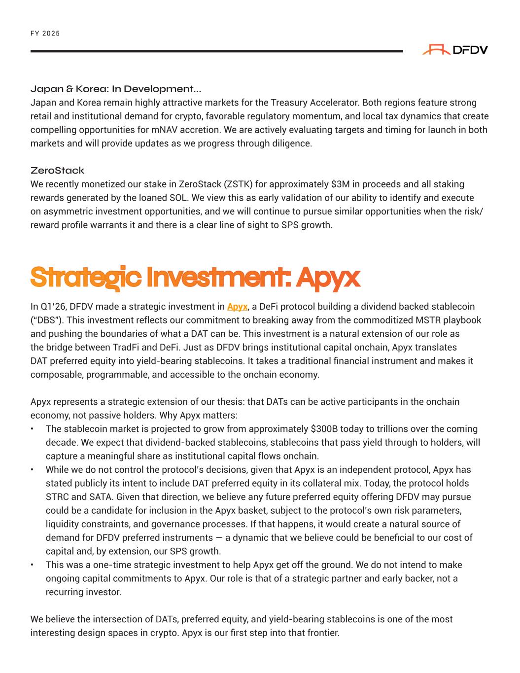 Japan & Korea: In Development... Japan and Korea remain highly attractive markets for the Treasury Accelerator. Both regions feature strong retail and institutional demand for crypto, favorable regulatory momentum, and local tax dynamics that create compelling opportunities for mNAV accretion. We are actively evaluating targets and timing for launch in both markets and will provide updates as we progress through diligence. ZeroStack We recently monetized our stake in ZeroStack (ZSTK) for approximately $3M in proceeds and all staking rewards generated by the loaned SOL. We view this as early validation of our ability to identify and execute on asymmetric investment opportunities, and we will continue to pursue similar opportunities when the risk/ reward profile warrants it and there is a clear line of sight to SPS growth. In Q1’26, DFDV made a strategic investment in Apyx, a DeFi protocol building a dividend backed stablecoin (“DBS”). This investment reflects our commitment to breaking away from the commoditized MSTR playbook and pushing the boundaries of what a DAT can be. This investment is a natural extension of our role as the bridge between TradFi and DeFi. Just as DFDV brings institutional capital onchain, Apyx translates DAT preferred equity into yield-bearing stablecoins. It takes a traditional financial instrument and makes it composable, programmable, and accessible to the onchain economy. Apyx represents a strategic extension of our thesis: that DATs can be active participants in the onchain economy, not passive holders. Why Apyx matters: • The stablecoin market is projected to grow from approximately $300B today to trillions over the coming decade. We expect that dividend-backed stablecoins, stablecoins that pass yield through to holders, will capture a meaningful share as institutional capital flows onchain. • While we do not control the protocol’s decisions, given that Apyx is an independent protocol, Apyx has stated publicly its intent to include DAT preferred equity in its collateral mix. Today, the protocol holds STRC and SATA. Given that direction, we believe any future preferred equity offering DFDV may pursue could be a candidate for inclusion in the Apyx basket, subject to the protocol’s own risk parameters, liquidity constraints, and governance processes. If that happens, it would create a natural source of demand for DFDV preferred instruments — a dynamic that we believe could be beneficial to our cost of capital and, by extension, our SPS growth. • This was a one-time strategic investment to help Apyx get off the ground. We do not intend to make ongoing capital commitments to Apyx. Our role is that of a strategic partner and early backer, not a recurring investor. We believe the intersection of DATs, preferred equity, and yield-bearing stablecoins is one of the most interesting design spaces in crypto. Apyx is our first step into that frontier. FY 2025 Strategic Investment: Apyx