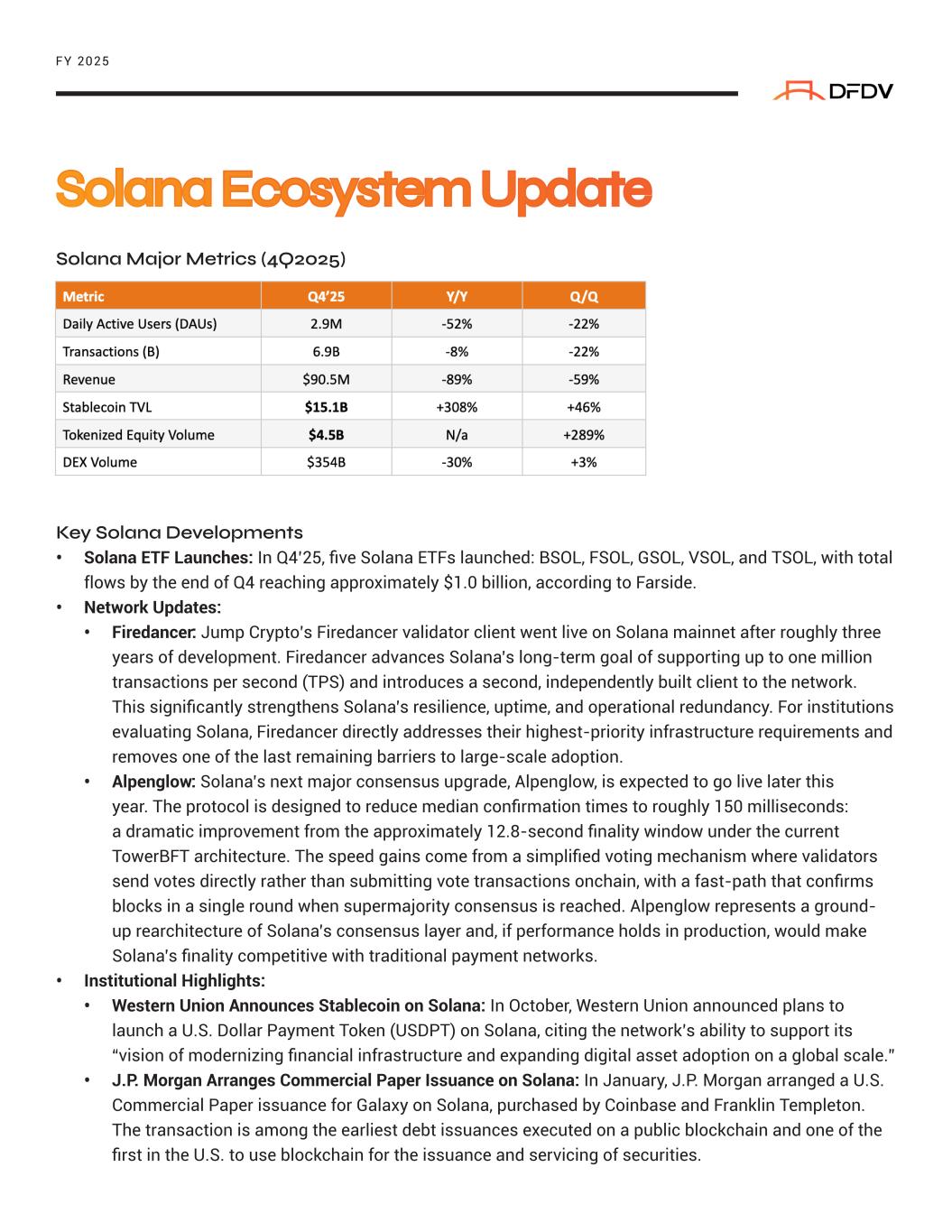 Solana Major Metrics (4Q2025) Key Solana Developments • Solana ETF Launches: In Q4’25, five Solana ETFs launched: BSOL, FSOL, GSOL, VSOL, and TSOL, with total flows by the end of Q4 reaching approximately $1.0 billion, according to Farside. • Network Updates: • Firedancer: Jump Crypto’s Firedancer validator client went live on Solana mainnet after roughly three years of development. Firedancer advances Solana’s long-term goal of supporting up to one million transactions per second (TPS) and introduces a second, independently built client to the network. This significantly strengthens Solana’s resilience, uptime, and operational redundancy. For institutions evaluating Solana, Firedancer directly addresses their highest-priority infrastructure requirements and removes one of the last remaining barriers to large-scale adoption. • Alpenglow: Solana’s next major consensus upgrade, Alpenglow, is expected to go live later this year. The protocol is designed to reduce median confirmation times to roughly 150 milliseconds: a dramatic improvement from the approximately 12.8-second finality window under the current TowerBFT architecture. The speed gains come from a simplified voting mechanism where validators send votes directly rather than submitting vote transactions onchain, with a fast-path that confirms blocks in a single round when supermajority consensus is reached. Alpenglow represents a ground- up rearchitecture of Solana’s consensus layer and, if performance holds in production, would make Solana’s finality competitive with traditional payment networks. • Institutional Highlights: • Western Union Announces Stablecoin on Solana: In October, Western Union announced plans to launch a U.S. Dollar Payment Token (USDPT) on Solana, citing the network’s ability to support its “vision of modernizing financial infrastructure and expanding digital asset adoption on a global scale.” • J.P. Morgan Arranges Commercial Paper Issuance on Solana: In January, J.P. Morgan arranged a U.S. Commercial Paper issuance for Galaxy on Solana, purchased by Coinbase and Franklin Templeton. The transaction is among the earliest debt issuances executed on a public blockchain and one of the first in the U.S. to use blockchain for the issuance and servicing of securities. FY 2025 Solana Ecosystem Update