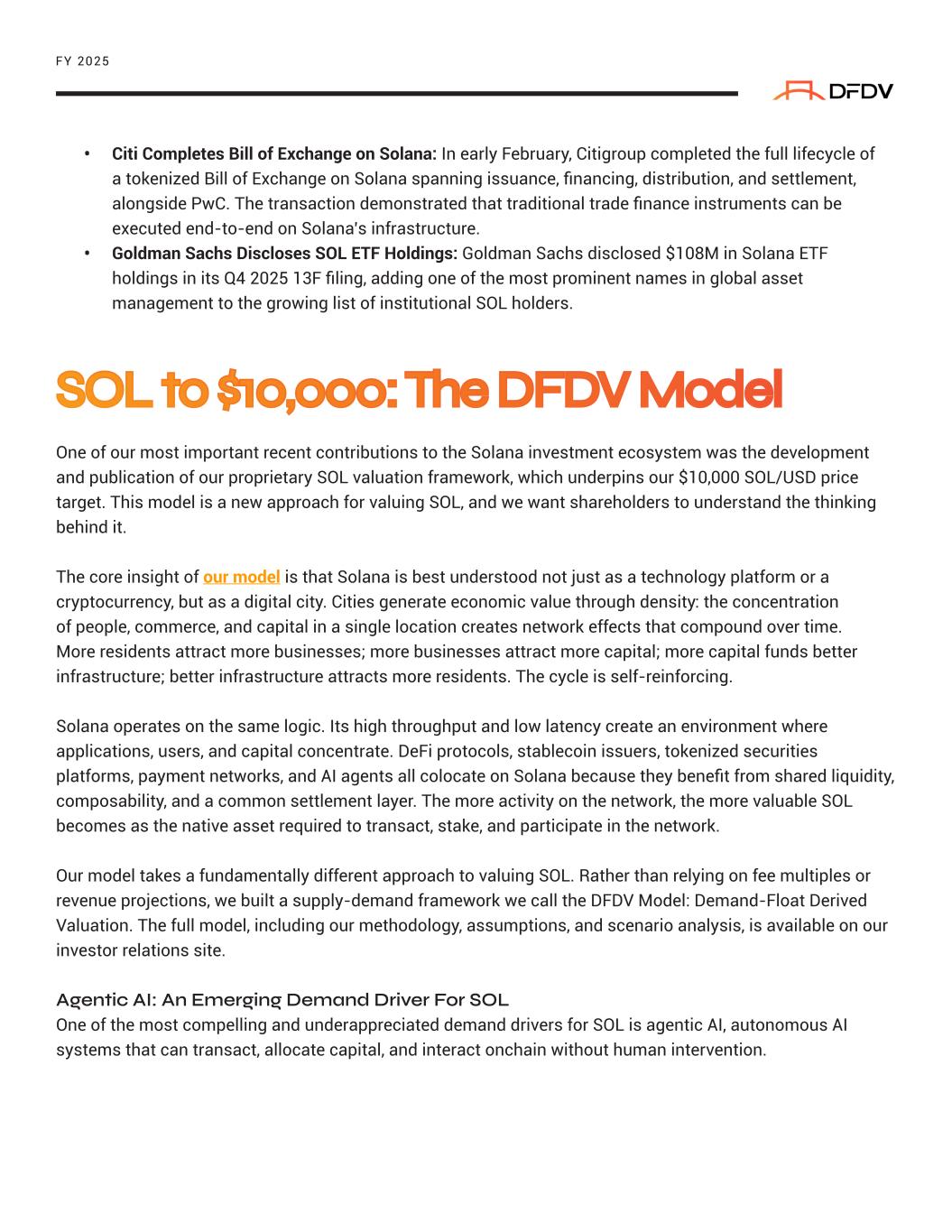 FY 2025 • Citi Completes Bill of Exchange on Solana: In early February, Citigroup completed the full lifecycle of a tokenized Bill of Exchange on Solana spanning issuance, financing, distribution, and settlement, alongside PwC. The transaction demonstrated that traditional trade finance instruments can be executed end-to-end on Solana’s infrastructure. • Goldman Sachs Discloses SOL ETF Holdings: Goldman Sachs disclosed $108M in Solana ETF holdings in its Q4 2025 13F filing, adding one of the most prominent names in global asset management to the growing list of institutional SOL holders. One of our most important recent contributions to the Solana investment ecosystem was the development and publication of our proprietary SOL valuation framework, which underpins our $10,000 SOL/USD price target. This model is a new approach for valuing SOL, and we want shareholders to understand the thinking behind it. The core insight of our model is that Solana is best understood not just as a technology platform or a cryptocurrency, but as a digital city. Cities generate economic value through density: the concentration of people, commerce, and capital in a single location creates network effects that compound over time. More residents attract more businesses; more businesses attract more capital; more capital funds better infrastructure; better infrastructure attracts more residents. The cycle is self-reinforcing. Solana operates on the same logic. Its high throughput and low latency create an environment where applications, users, and capital concentrate. DeFi protocols, stablecoin issuers, tokenized securities platforms, payment networks, and AI agents all colocate on Solana because they benefit from shared liquidity, composability, and a common settlement layer. The more activity on the network, the more valuable SOL becomes as the native asset required to transact, stake, and participate in the network. Our model takes a fundamentally different approach to valuing SOL. Rather than relying on fee multiples or revenue projections, we built a supply-demand framework we call the DFDV Model: Demand-Float Derived Valuation. The full model, including our methodology, assumptions, and scenario analysis, is available on our investor relations site. Agentic AI: An Emerging Demand Driver For SOL One of the most compelling and underappreciated demand drivers for SOL is agentic AI, autonomous AI systems that can transact, allocate capital, and interact onchain without human intervention. SOL to $10,000: The DFDV Model