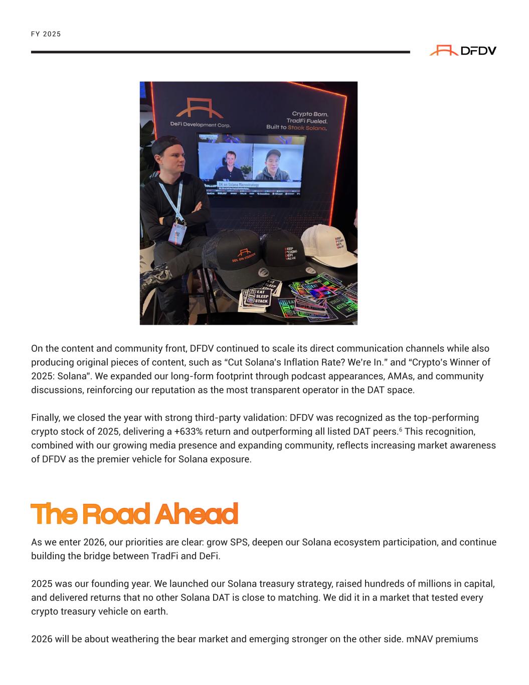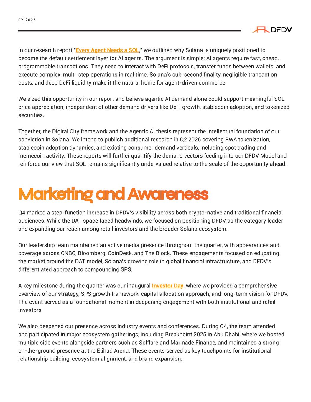 FY 2025 In our research report “Every Agent Needs a SOL,” we outlined why Solana is uniquely positioned to become the default settlement layer for AI agents. The argument is simple: AI agents require fast, cheap, programmable transactions. They need to interact with DeFi protocols, transfer funds between wallets, and execute complex, multi-step operations in real time. Solana’s sub-second finality, negligible transaction costs, and deep DeFi liquidity make it the natural home for agent-driven commerce. We sized this opportunity in our report and believe agentic AI demand alone could support meaningful SOL price appreciation, independent of other demand drivers like DeFi growth, stablecoin adoption, and tokenized securities. Together, the Digital City framework and the Agentic AI thesis represent the intellectual foundation of our conviction in Solana. We intend to publish additional research in Q2 2026 covering RWA tokenization, stablecoin adoption dynamics, and existing consumer demand verticals, including spot trading and memecoin activity. These reports will further quantify the demand vectors feeding into our DFDV Model and reinforce our view that SOL remains significantly undervalued relative to the scale of the opportunity ahead. Q4 marked a step-function increase in DFDV’s visibility across both crypto-native and traditional financial audiences. While the DAT space faced headwinds, we focused on positioning DFDV as the category leader and expanding our reach among retail investors and the broader Solana ecosystem. Our leadership team maintained an active media presence throughout the quarter, with appearances and coverage across CNBC, Bloomberg, CoinDesk, and The Block. These engagements focused on educating the market around the DAT model, Solana’s growing role in global financial infrastructure, and DFDV’s differentiated approach to compounding SPS. A key milestone during the quarter was our inaugural Investor Day, where we provided a comprehensive overview of our strategy, SPS growth framework, capital allocation approach, and long-term vision for DFDV. The event served as a foundational moment in deepening engagement with both institutional and retail investors. We also deepened our presence across industry events and conferences. During Q4, the team attended and participated in major ecosystem gatherings, including Breakpoint 2025 in Abu Dhabi, where we hosted multiple side events alongside partners such as Solflare and Marinade Finance, and maintained a strong on-the-ground presence at the Etihad Arena. These events served as key touchpoints for institutional relationship building, ecosystem alignment, and brand expansion. Marketing and Awareness