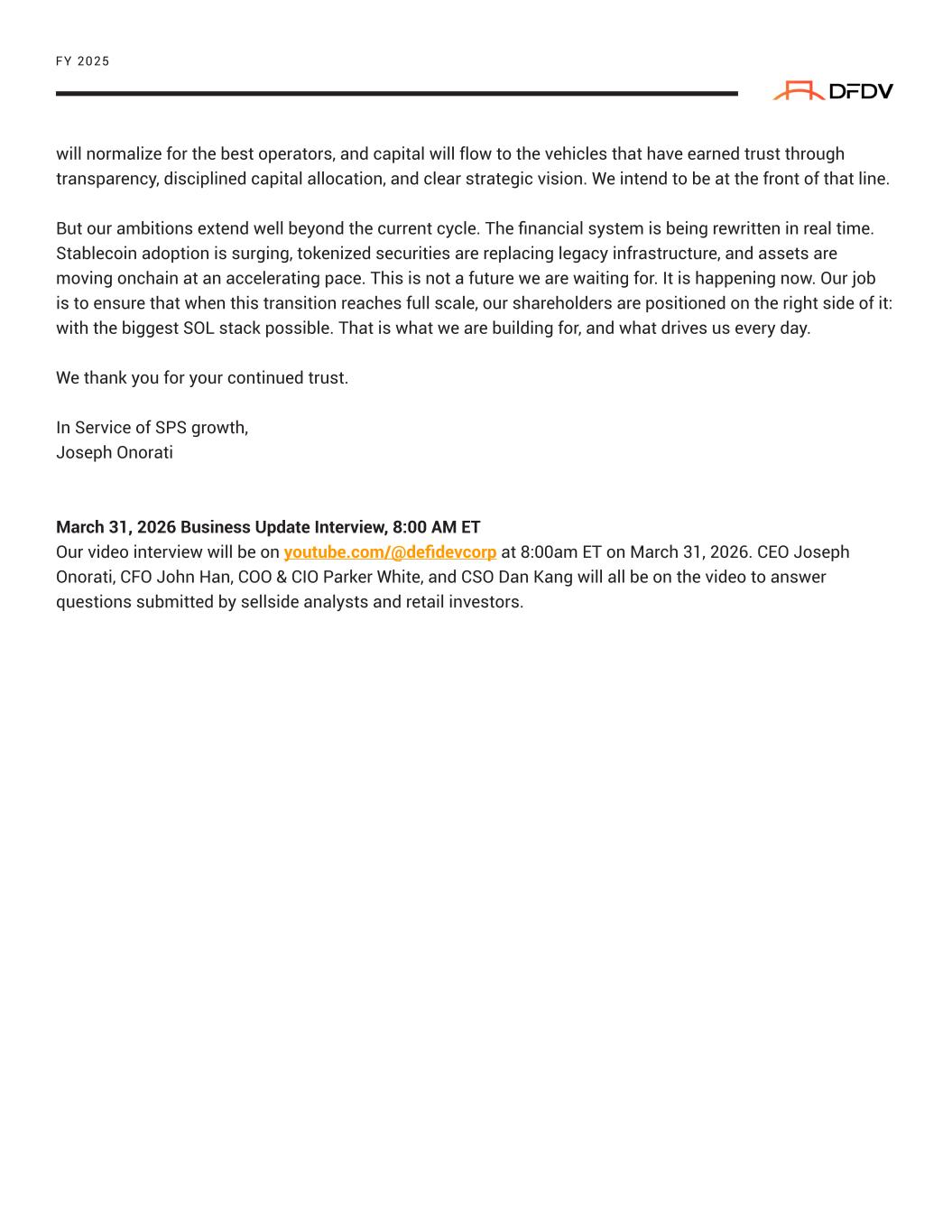 FY 2025 will normalize for the best operators, and capital will flow to the vehicles that have earned trust through transparency, disciplined capital allocation, and clear strategic vision. We intend to be at the front of that line. But our ambitions extend well beyond the current cycle. The financial system is being rewritten in real time. Stablecoin adoption is surging, tokenized securities are replacing legacy infrastructure, and assets are moving onchain at an accelerating pace. This is not a future we are waiting for. It is happening now. Our job is to ensure that when this transition reaches full scale, our shareholders are positioned on the right side of it: with the biggest SOL stack possible. That is what we are building for, and what drives us every day. We thank you for your continued trust. In Service of SPS growth, Joseph Onorati March 31, 2026 Business Update Interview, 8:00 AM ET Our video interview will be on youtube.com/@defidevcorp at 8:00am ET on March 31, 2026. CEO Joseph Onorati, CFO John Han, COO & CIO Parker White, and CSO Dan Kang will all be on the video to answer questions submitted by sellside analysts and retail investors.