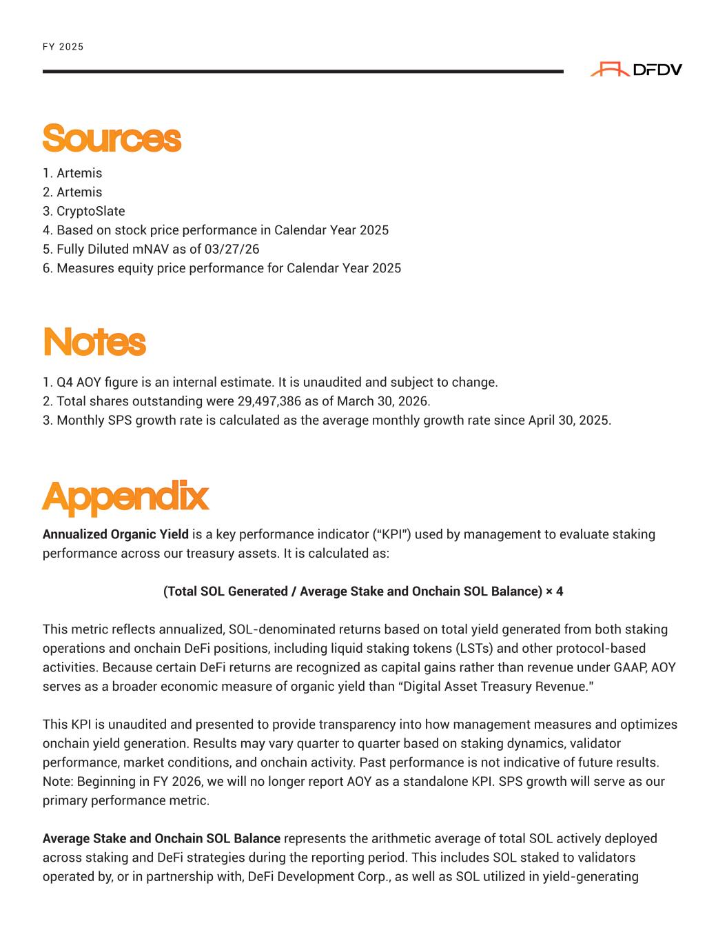 1. Artemis 2. Artemis 3. CryptoSlate 4. Based on stock price performance in Calendar Year 2025 5. Fully Diluted mNAV as of 03/27/26 6. Measures equity price performance for Calendar Year 2025 1. Q4 AOY figure is an internal estimate. It is unaudited and subject to change. 2. Total shares outstanding were 29,497,386 as of March 30, 2026. 3. Monthly SPS growth rate is calculated as the average monthly growth rate since April 30, 2025. Annualized Organic Yield is a key performance indicator (“KPI”) used by management to evaluate staking performance across our treasury assets. It is calculated as: (Total SOL Generated / Average Stake and Onchain SOL Balance) × 4 This metric reflects annualized, SOL-denominated returns based on total yield generated from both staking operations and onchain DeFi positions, including liquid staking tokens (LSTs) and other protocol-based activities. Because certain DeFi returns are recognized as capital gains rather than revenue under GAAP, AOY serves as a broader economic measure of organic yield than “Digital Asset Treasury Revenue.” This KPI is unaudited and presented to provide transparency into how management measures and optimizes onchain yield generation. Results may vary quarter to quarter based on staking dynamics, validator performance, market conditions, and onchain activity. Past performance is not indicative of future results. Note: Beginning in FY 2026, we will no longer report AOY as a standalone KPI. SPS growth will serve as our primary performance metric. Average Stake and Onchain SOL Balance represents the arithmetic average of total SOL actively deployed across staking and DeFi strategies during the reporting period. This includes SOL staked to validators operated by, or in partnership with, DeFi Development Corp., as well as SOL utilized in yield-generating Sources FY 2025 Notes Appendix