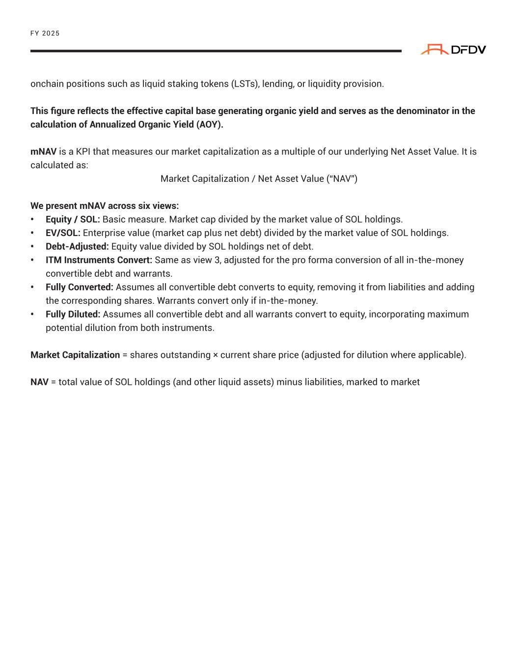 FY 2025 onchain positions such as liquid staking tokens (LSTs), lending, or liquidity provision. This figure reflects the effective capital base generating organic yield and serves as the denominator in the calculation of Annualized Organic Yield (AOY). mNAV is a KPI that measures our market capitalization as a multiple of our underlying Net Asset Value. It is calculated as: Market Capitalization / Net Asset Value (“NAV”) We present mNAV across six views: • Equity / SOL: Basic measure. Market cap divided by the market value of SOL holdings. • EV/SOL: Enterprise value (market cap plus net debt) divided by the market value of SOL holdings. • Debt-Adjusted: Equity value divided by SOL holdings net of debt. • ITM Instruments Convert: Same as view 3, adjusted for the pro forma conversion of all in-the-money convertible debt and warrants. • Fully Converted: Assumes all convertible debt converts to equity, removing it from liabilities and adding the corresponding shares. Warrants convert only if in-the-money. • Fully Diluted: Assumes all convertible debt and all warrants convert to equity, incorporating maximum potential dilution from both instruments. Market Capitalization = shares outstanding × current share price (adjusted for dilution where applicable). NAV = total value of SOL holdings (and other liquid assets) minus liabilities, marked to market