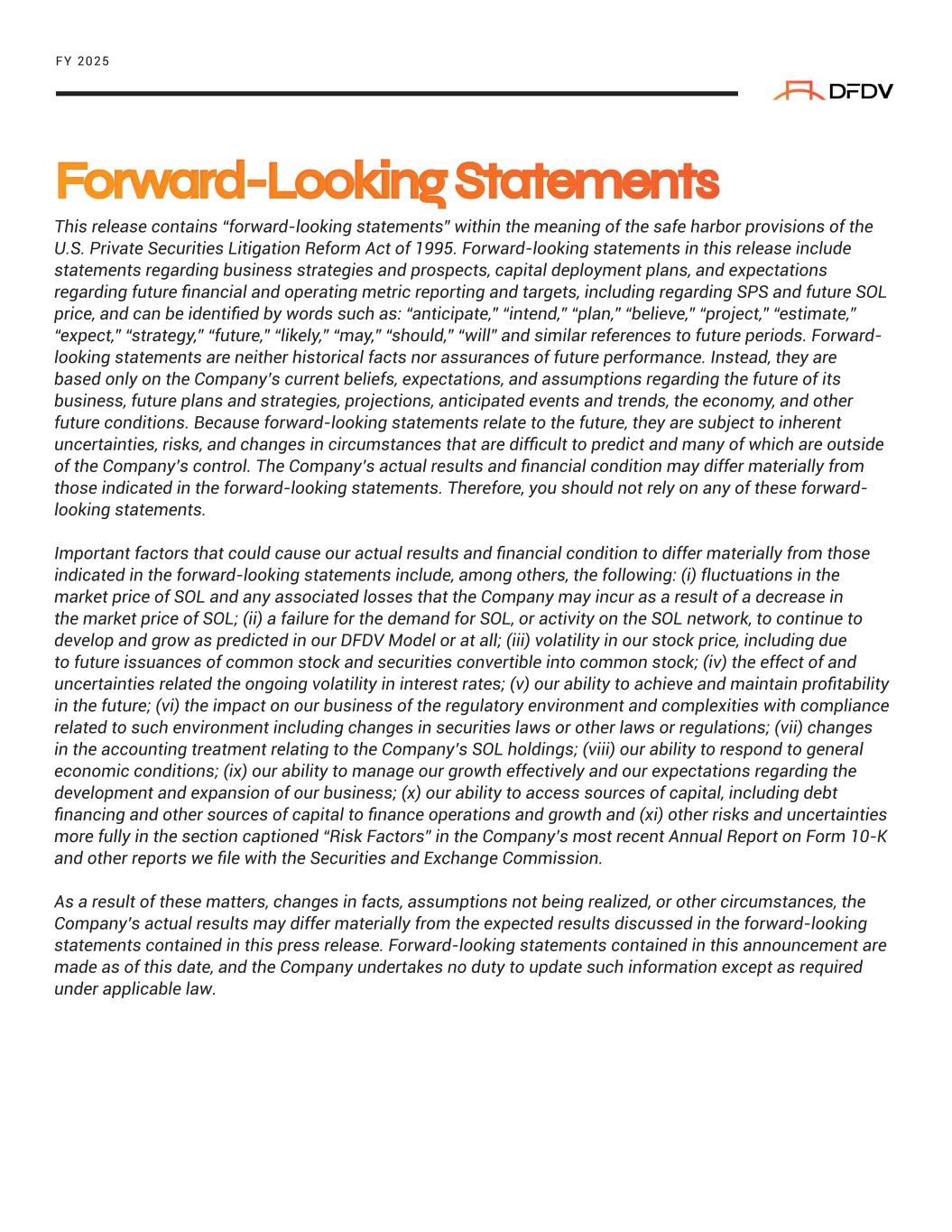 Forward-Looking Statements This release contains “forward-looking statements” within the meaning of the safe harbor provisions of the U.S. Private Securities Litigation Reform Act of 1995. Forward-looking statements in this release include statements regarding business strategies and prospects, capital deployment plans, and expectations regarding future financial and operating metric reporting and targets, including regarding SPS and future SOL price, and can be identified by words such as: “anticipate,” “intend,” “plan,” “believe,” “project,” “estimate,” “expect,” “strategy,” “future,” “likely,” “may,” “should,” “will” and similar references to future periods. Forward- looking statements are neither historical facts nor assurances of future performance. Instead, they are based only on the Company’s current beliefs, expectations, and assumptions regarding the future of its business, future plans and strategies, projections, anticipated events and trends, the economy, and other future conditions. Because forward-looking statements relate to the future, they are subject to inherent uncertainties, risks, and changes in circumstances that are difficult to predict and many of which are outside of the Company’s control. The Company’s actual results and financial condition may differ materially from those indicated in the forward-looking statements. Therefore, you should not rely on any of these forward- looking statements. Important factors that could cause our actual results and financial condition to differ materially from those indicated in the forward-looking statements include, among others, the following: (i) fluctuations in the market price of SOL and any associated losses that the Company may incur as a result of a decrease in the market price of SOL; (ii) a failure for the demand for SOL, or activity on the SOL network, to continue to develop and grow as predicted in our DFDV Model or at all; (iii) volatility in our stock price, including due to future issuances of common stock and securities convertible into common stock; (iv) the effect of and uncertainties related the ongoing volatility in interest rates; (v) our ability to achieve and maintain profitability in the future; (vi) the impact on our business of the regulatory environment and complexities with compliance related to such environment including changes in securities laws or other laws or regulations; (vii) changes in the accounting treatment relating to the Company’s SOL holdings; (viii) our ability to respond to general economic conditions; (ix) our ability to manage our growth effectively and our expectations regarding the development and expansion of our business; (x) our ability to access sources of capital, including debt financing and other sources of capital to finance operations and growth and (xi) other risks and uncertainties more fully in the section captioned “Risk Factors” in the Company’s most recent Annual Report on Form 10-K and other reports we file with the Securities and Exchange Commission. As a result of these matters, changes in facts, assumptions not being realized, or other circumstances, the Company’s actual results may differ materially from the expected results discussed in the forward-looking statements contained in this press release. Forward-looking statements contained in this announcement are made as of this date, and the Company undertakes no duty to update such information except as required under applicable law. FY 2025