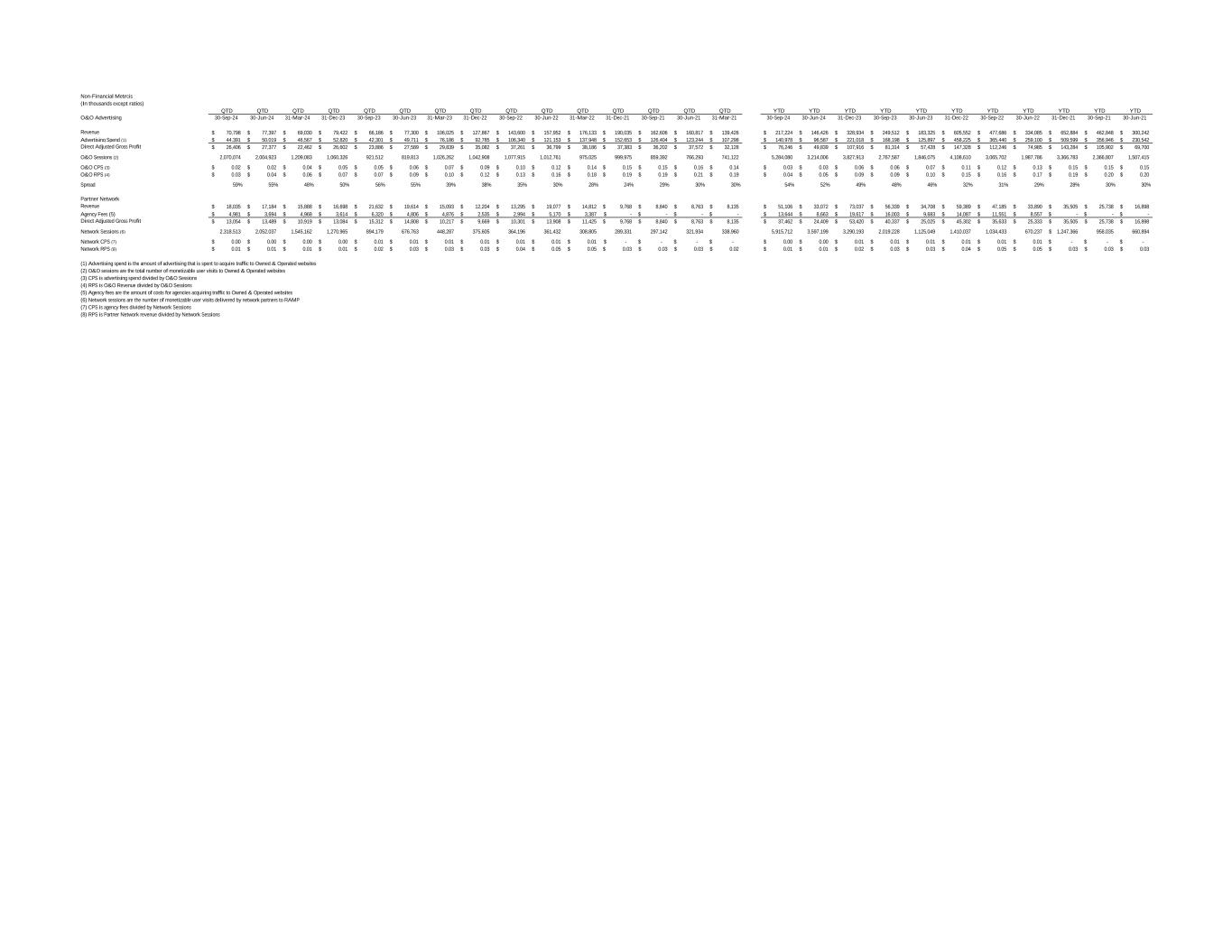 Non-Financial Metrcis (In thousands except ratios) QTD QTD QTD QTD QTD QTD QTD QTD QTD QTD QTD QTD QTD QTD QTD YTD YTD YTD YTD YTD YTD YTD YTD YTD YTD YTD O&O Advertising 30-Sep-24 30-Jun-24 31-Mar-24 31-Dec-23 30-Sep-23 30-Jun-23 31-Mar-23 31-Dec-22 30-Sep-22 30-Jun-22 31-Mar-22 31-Dec-21 30-Sep-21 30-Jun-21 31-Mar-21 30-Sep-24 30-Jun-24 31-Dec-23 30-Sep-23 30-Jun-23 31-Dec-22 30-Sep-22 30-Jun-22 31-Dec-21 30-Sep-21 30-Jun-21 Revenue 70,798$ 77,397$ 69,030$ 79,422$ 66,186$ 77,300$ 106,025$ 127,867$ 143,600$ 157,952$ 176,133$ 190,035$ 162,606$ 160,817$ 139,426$ 217,224$ 146,426$ 328,934$ 249,512$ 183,325$ 605,552$ 477,686$ 334,085$ 652,884$ 462,848$ 300,242$ Advertising Spend (1) 44,391$ 50,019$ 46,567$ 52,820$ 42,301$ 49,711$ 76,186$ 92,785$ 106,340$ 121,153$ 137,948$ 152,653$ 126,404$ 123,244$ 107,298$ 140,978$ 96,587$ 221,018$ 168,198$ 125,897$ 458,225$ 365,440$ 259,100$ 509,599$ 356,946$ 230,542$ Direct Adjusted Gross Profit 26,406$ 27,377$ 22,462$ 26,602$ 23,886$ 27,589$ 29,839$ 35,082$ 37,261$ 36,799$ 38,186$ 37,383$ 36,202$ 37,572$ 32,128$ 76,246$ 49,839$ 107,916$ 81,314$ 57,428$ 147,328$ 112,246$ 74,985$ 143,284$ 105,902$ 69,700$ O&O Sessions (2) 2,070,074 2,004,923 1,209,083 1,060,326 921,512 819,813 1,026,262 1,042,908 1,077,915 1,012,761 975,025 999,975 859,392 766,293 741,122 5,284,080 3,214,006 3,827,913 2,767,587 1,846,075 4,108,610 3,065,702 1,987,786 3,366,783 2,366,807 1,507,415 O&O CPS (3) 0.02$ 0.02$ 0.04$ 0.05$ 0.05$ 0.06$ 0.07$ 0.09$ 0.10$ 0.12$ 0.14$ 0.15$ 0.15$ 0.16$ 0.14$ 0.03$ 0.03$ 0.06$ 0.06$ 0.07$ 0.11$ 0.12$ 0.13$ 0.15$ 0.15$ 0.15$ O&O RPS (4) 0.03$ 0.04$ 0.06$ 0.07$ 0.07$ 0.09$ 0.10$ 0.12$ 0.13$ 0.16$ 0.18$ 0.19$ 0.19$ 0.21$ 0.19$ 0.04$ 0.05$ 0.09$ 0.09$ 0.10$ 0.15$ 0.16$ 0.17$ 0.19$ 0.20$ 0.20$ Spread 59% 55% 48% 50% 56% 55% 39% 38% 35% 30% 28% 24% 29% 30% 30% 54% 52% 49% 48% 46% 32% 31% 29% 28% 30% 30% Partner Network Revenue 18,035$ 17,184$ 15,888$ 16,698$ 21,632$ 19,614$ 15,093$ 12,204$ 13,295$ 19,077$ 14,812$ 9,768$ 8,840$ 8,763$ 8,135$ 51,106$ 33,072$ 73,037$ 56,339$ 34,708$ 59,389$ 47,185$ 33,890$ 35,505$ 25,738$ 16,898$ Agency Fees (5) 4,981$ 3,694$ 4,968$ 3,614$ 6,320$ 4,806$ 4,876$ 2,535$ 2,994$ 5,170$ 3,387$ -$ -$ -$ -$ 13,644$ 8,663$ 19,617$ 16,003$ 9,683$ 14,087$ 11,551$ 8,557$ -$ -$ -$ Direct Adjusted Gross Profit 13,054$ 13,489$ 10,919$ 13,084$ 15,312$ 14,808$ 10,217$ 9,669$ 10,301$ 13,908$ 11,425$ 9,768$ 8,840$ 8,763$ 8,135$ 37,462$ 24,409$ 53,420$ 40,337$ 25,025$ 45,302$ 35,633$ 25,333$ 35,505$ 25,738$ 16,898$ Network Sessions (6) 2,318,513 2,052,037 1,545,162 1,270,965 894,179 676,763 448,287 375,605 364,196 361,432 308,805 289,331 297,142 321,934 338,960 5,915,712 3,597,199 3,290,193 2,019,228 1,125,049 1,410,037 1,034,433 670,237 1,247,366$ 958,035 660,894 Network CPS (7) 0.00$ 0.00$ 0.00$ 0.00$ 0.01$ 0.01$ 0.01$ 0.01$ 0.01$ 0.01$ 0.01$ -$ -$ -$ -$ 0.00$ 0.00$ 0.01$ 0.01$ 0.01$ 0.01$ 0.01$ 0.01$ -$ -$ -$ Network RPS (8) 0.01$ 0.01$ 0.01$ 0.01$ 0.02$ 0.03$ 0.03$ 0.03$ 0.04$ 0.05$ 0.05$ 0.03$ 0.03$ 0.03$ 0.02$ 0.01$ 0.01$ 0.02$ 0.03$ 0.03$ 0.04$ 0.05$ 0.05$ 0.03$ 0.03$ 0.03$ (1) Advertising spend is the amount of advertising that is spent to acquire traffic to Owned & Operated websites (2) O&O sessions are the total number of monetizable user visits to Owned & Operated websites (3) CPS is advertising spend divided by O&O Sessions (4) RPS is O&O Revenue divided by O&O Sessions (5) Agency fees are the amount of costs for agencies acquiring traffic to Owned & Operated websites (6) Network sessions are the number of monetizable user visits delivered by network partners to RAMP (7) CPS is agency fees divided by Network Sessions (8) RPS is Partner Network revenue divided by Network Sessions