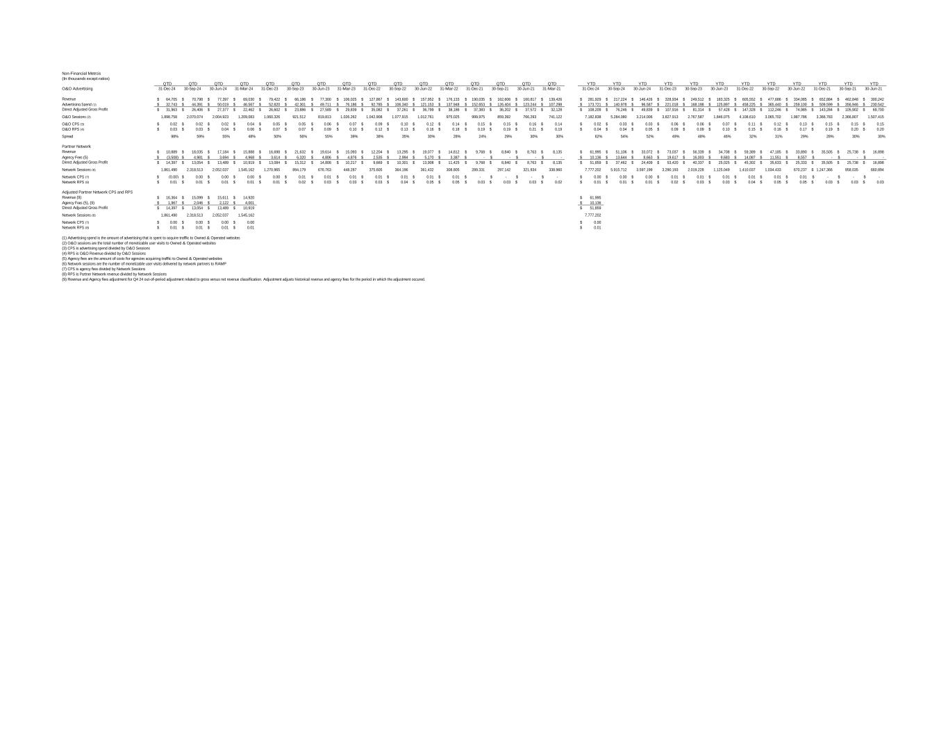 Non-Financial Metrcis (In thousands except ratios) QTD QTD QTD QTD QTD QTD QTD QTD QTD QTD QTD QTD QTD QTD QTD QTD YTD YTD YTD YTD YTD YTD YTD YTD YTD YTD YTD YTD O&O Advertising 31-Dec-24 30-Sep-24 30-Jun-24 31-Mar-24 31-Dec-23 30-Sep-23 30-Jun-23 31-Mar-23 31-Dec-22 30-Sep-22 30-Jun-22 31-Mar-22 31-Dec-21 30-Sep-21 30-Jun-21 31-Mar-21 31-Dec-24 30-Sep-24 30-Jun-24 31-Dec-23 30-Sep-23 30-Jun-23 31-Dec-22 30-Sep-22 30-Jun-22 31-Dec-21 30-Sep-21 30-Jun-21 Revenue 64,705$ 70,798$ 77,397$ 69,030$ 79,422$ 66,186$ 77,300$ 106,025$ 127,867$ 143,600$ 157,952$ 176,133$ 190,035$ 162,606$ 160,817$ 139,426$ 281,929$ 217,224$ 146,426$ 328,934$ 249,512$ 183,325$ 605,552$ 477,686$ 334,085$ 652,884$ 462,848$ 300,242$ Advertising Spend (1) 32,743$ 44,391$ 50,019$ 46,567$ 52,820$ 42,301$ 49,711$ 76,186$ 92,785$ 106,340$ 121,153$ 137,948$ 152,653$ 126,404$ 123,244$ 107,298$ 173,721$ 140,978$ 96,587$ 221,018$ 168,198$ 125,897$ 458,225$ 365,440$ 259,100$ 509,599$ 356,946$ 230,542$ Direct Adjusted Gross Profit 31,963$ 26,406$ 27,377$ 22,462$ 26,602$ 23,886$ 27,589$ 29,839$ 35,082$ 37,261$ 36,799$ 38,186$ 37,383$ 36,202$ 37,572$ 32,128$ 108,209$ 76,246$ 49,839$ 107,916$ 81,314$ 57,428$ 147,328$ 112,246$ 74,985$ 143,284$ 105,902$ 69,700$ O&O Sessions (2) 1,898,758 2,070,074 2,004,923 1,209,083 1,060,326 921,512 819,813 1,026,262 1,042,908 1,077,915 1,012,761 975,025 999,975 859,392 766,293 741,122 7,182,838 5,284,080 3,214,006 3,827,913 2,767,587 1,846,075 4,108,610 3,065,702 1,987,786 3,366,783 2,366,807 1,507,415 O&O CPS (3) 0.02$ 0.02$ 0.02$ 0.04$ 0.05$ 0.05$ 0.06$ 0.07$ 0.09$ 0.10$ 0.12$ 0.14$ 0.15$ 0.15$ 0.16$ 0.14$ 0.02$ 0.03$ 0.03$ 0.06$ 0.06$ 0.07$ 0.11$ 0.12$ 0.13$ 0.15$ 0.15$ 0.15$ O&O RPS (4) 0.03$ 0.03$ 0.04$ 0.06$ 0.07$ 0.07$ 0.09$ 0.10$ 0.12$ 0.13$ 0.16$ 0.18$ 0.19$ 0.19$ 0.21$ 0.19$ 0.04$ 0.04$ 0.05$ 0.09$ 0.09$ 0.10$ 0.15$ 0.16$ 0.17$ 0.19$ 0.20$ 0.20$ Spread 98% 59% 55% 48% 50% 56% 55% 39% 38% 35% 30% 28% 24% 29% 30% 30% 62% 54% 52% 49% 48% 46% 32% 31% 29% 28% 30% 30% Partner Network Revenue 10,889$ 18,035$ 17,184$ 15,888$ 16,698$ 21,632$ 19,614$ 15,093$ 12,204$ 13,295$ 19,077$ 14,812$ 9,768$ 8,840$ 8,763$ 8,135$ 61,995$ 51,106$ 33,072$ 73,037$ 56,339$ 34,708$ 59,389$ 47,185$ 33,890$ 35,505$ 25,738$ 16,898$ Agency Fees (5) (3,508)$ 4,981$ 3,694$ 4,968$ 3,614$ 6,320$ 4,806$ 4,876$ 2,535$ 2,994$ 5,170$ 3,387$ -$ -$ -$ -$ 10,136$ 13,644$ 8,663$ 19,617$ 16,003$ 9,683$ 14,087$ 11,551$ 8,557$ -$ -$ -$ Direct Adjusted Gross Profit 14,397$ 13,054$ 13,489$ 10,919$ 13,084$ 15,312$ 14,808$ 10,217$ 9,669$ 10,301$ 13,908$ 11,425$ 9,768$ 8,840$ 8,763$ 8,135$ 51,859$ 37,462$ 24,409$ 53,420$ 40,337$ 25,025$ 45,302$ 35,633$ 25,333$ 35,505$ 25,738$ 16,898$ Network Sessions (6) 1,861,490 2,318,513 2,052,037 1,545,162 1,270,965 894,179 676,763 448,287 375,605 364,196 361,432 308,805 289,331 297,142 321,934 338,960 7,777,202 5,915,712 3,597,199 3,290,193 2,019,228 1,125,049 1,410,037 1,034,433 670,237 1,247,366$ 958,035 660,894 Network CPS (7) (0.00)$ 0.00$ 0.00$ 0.00$ 0.00$ 0.01$ 0.01$ 0.01$ 0.01$ 0.01$ 0.01$ 0.01$ -$ -$ -$ -$ 0.00$ 0.00$ 0.00$ 0.01$ 0.01$ 0.01$ 0.01$ 0.01$ 0.01$ -$ -$ -$ Network RPS (8) 0.01$ 0.01$ 0.01$ 0.01$ 0.01$ 0.02$ 0.03$ 0.03$ 0.03$ 0.04$ 0.05$ 0.05$ 0.03$ 0.03$ 0.03$ 0.02$ 0.01$ 0.01$ 0.01$ 0.02$ 0.03$ 0.03$ 0.04$ 0.05$ 0.05$ 0.03$ 0.03$ 0.03$ Adjusted Partner Network CPS and RPS Revenue (9) 16,364$ 15,099$ 15,611$ 14,920$ 61,995$ Agency Fees (5), (9) 1,967$ 2,046$ 2,122$ 4,001$ 10,136$ Direct Adjusted Gross Profit 14,397$ 13,054$ 13,489$ 10,919$ 51,859$ Network Sessions (6) 1,861,490 2,318,513 2,052,037 1,545,162 7,777,202 Network CPS (7) 0.00$ 0.00$ 0.00$ 0.00$ 0.00$ Network RPS (8) 0.01$ 0.01$ 0.01$ 0.01$ 0.01$ (1) Advertising spend is the amount of advertising that is spent to acquire traffic to Owned & Operated websites (2) O&O sessions are the total number of monetizable user visits to Owned & Operated websites (3) CPS is advertising spend divided by O&O Sessions (4) RPS is O&O Revenue divided by O&O Sessions (5) Agency fees are the amount of costs for agencies acquiring traffic to Owned & Operated websites (6) Network sessions are the number of monetizable user visits delivered by network partners to RAMP (7) CPS is agency fees divided by Network Sessions (8) RPS is Partner Network revenue divided by Network Sessions (9) Revenue and Agency fees adjustment for Q4 24 out-of-period adjustment related to gross versus net revenue classification. Adjustment adjusts historical revenue and agency fees for the period in which the adjustment occured.