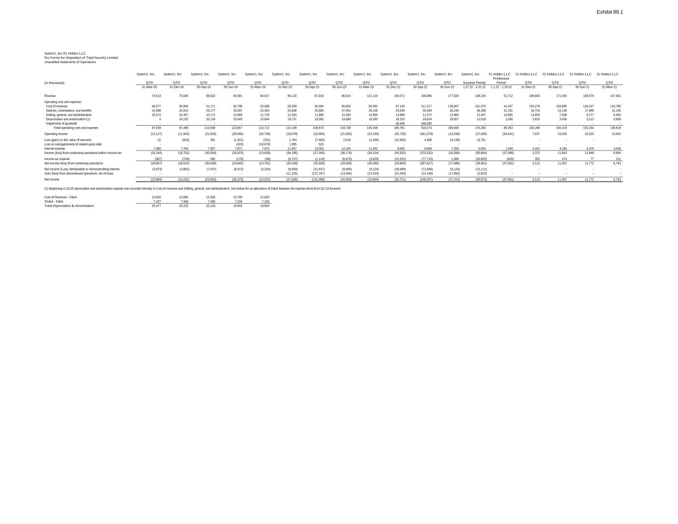 System1, Inc./S1 Holdco LLC Pro Forma for Disposition of Total Security Limited Unaudited Statements of Operations System1, Inc. System1, Inc. System1, Inc. System1, Inc. System1, Inc. System1, Inc. System1, Inc. System1, Inc. System1, Inc. System1, Inc. System1, Inc. System1, Inc. System1, Inc. S1 Holdco LLC S1 Holdco LLC S1 Holdco LLC S1 Holdco LLC S1 Holdco LLC (in thousands) QTD QTD QTD QTD QTD QTD QTD QTD QTD QTD QTD QTD Sucessor Period Predecessor Period QTD QTD QTD QTD 31-Mar-25 31-Dec-24 30-Sep-24 30-Jun-24 31-Mar-24 31-Dec-23 30-Sep-23 30-Jun-23 31-Mar-23 31-Dec-22 30-Sep-22 30-Jun-22 1.27.22 - 3.31.22 1.1.22 - 1.26.22 31-Dec-21 30-Sep-21 30-Jun-21 31-Mar-21 Revenue 74,513 75,594 88,832 94,581 84,917 96,120 87,818 96,914 121,119 140,071 156,895 177,029 138,234 52,712 199,803 171,445 169,579 147,561 Operating cost and expenses: Cost of revenues 46,077 30,894 51,171 55,798 53,698 58,550 50,584 56,656 82,953 97,145 111,217 128,507 101,970 41,507 155,276 128,885 126,167 110,785 Salaries, commissions, and benefits 24,988 25,915 29,177 33,937 24,483 24,608 26,695 27,054 28,148 29,040 30,469 30,249 48,288 31,181 18,715 15,139 17,698 15,195 Selling, general, and administrative 16,574 10,457 10,172 13,989 12,728 12,304 11,808 15,340 14,855 13,869 11,572 12,984 12,407 15,665 14,650 7,936 6,277 6,950 Depreciation and amortization (1) 0 20,232 20,128 19,943 19,804 19,737 19,585 19,689 19,393 19,102 18,924 18,827 12,618 1,000 3,625 3,459 3,112 3,689 Impairment of goodwill - - - - - - - - - 26,636 346,092 - - - - - - - Total operating costs and expenses 87,639 87,498 110,648 123,667 110,712 115,199 108,673 118,739 145,349 185,791 518,274 190,568 175,283 89,353 192,266 155,419 153,254 136,619 Operating income (13,127) (11,903) (21,816) (29,086) (25,795) (19,079) (20,855) (21,825) (24,230) (45,720) (361,379) (13,538) (37,049) (36,641) 7,537 16,026 16,325 10,942 Loss (gain) on fair value of warrants 32 (915) 281 (1,501) (251) 1,764 (7,482) 2,018 (1,409) (10,360) 4,489 (4,139) 13,761 - - - - - Loss on extinguishment of related-party debt - - - (433) (19,676) 1,385 619 - - - - - - - - - - - Interest expense 7,085 7,764 7,957 7,871 7,970 11,957 13,053 12,334 11,402 9,692 9,664 7,200 5,054 1,049 4,162 4,184 4,476 4,048 Income (loss) from continuing operations before income tax (20,244) (18,752) (30,054) (35,023) (13,839) (34,185) (27,045) (36,176) (34,224) (45,052) (375,532) (16,599) (55,864) (37,690) 3,375 11,842 11,849 6,894 Income tax expense (387) (729) 585 (178) (48) (8,757) (1,116) (6,670) (3,829) (15,252) (77,715) 1,089 (16,803) (629) 262 475 77 151 Net income (loss) from continuing operations (19,857) (18,023) (30,639) (34,845) (13,791) (25,428) (25,929) (29,506) (30,395) (29,800) (297,817) (17,688) (39,061) (37,061) 3,113 11,367 11,772 6,743 Net Income (Loss) Attributable to Noncontrolling Interest (3,973) (3,862) (7,037) (8,472) (3,254) (8,903) (31,647) (8,690) (9,124) (18,089) (71,606) (8,124) (13,111) - - - - - Gain (loss) from discontinued operations, net of taxes - - - - - (11,105) (137,207) (13,484) (12,533) (21,040) (14,146) (17,850) (3,923) - - - - - Net income (15,884) (14,161) (23,602) (26,373) (10,537) (27,630) (131,489) (34,300) (33,804) (32,751) (240,357) (27,414) (29,873) (37,061) 3,113 11,367 11,772 6,743 (1) Beginning in Q125 deprecation and amortization expense was recorded directly in Cost of revenues and Selling, general, and administrative. See below for an allocation of D&A between the expense items from Q1 24 forward: Cost of Revenues - D&A 13,050 12,884 12,828 12,709 12,620 SG&A - D&A 7,427 7,348 7,300 7,234 7,183 Total Depreciation & Amortization 20,477 20,232 20,128 19,943 19,804