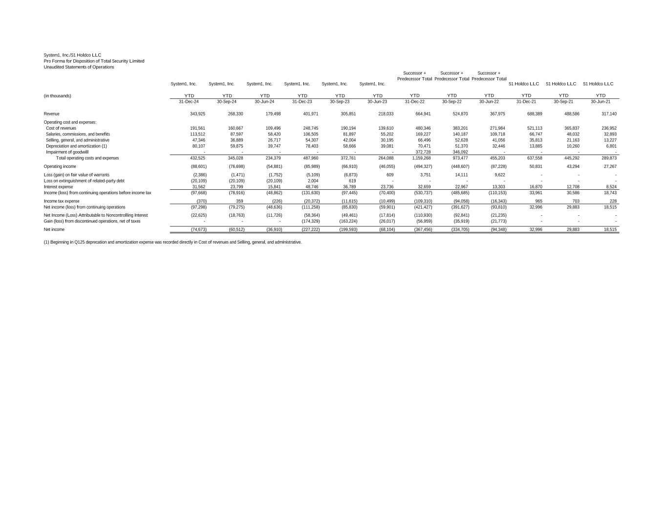 System1, Inc./S1 Holdco LLC Pro Forma for Disposition of Total Security Limited Unaudited Statements of Operations System1, Inc. System1, Inc. System1, Inc. System1, Inc. System1, Inc. System1, Inc. Successor + Predecessor Total Successor + Predecessor Total Successor + Predecessor Total S1 Holdco LLC S1 Holdco LLC S1 Holdco LLC (in thousands) YTD YTD YTD YTD YTD YTD YTD YTD YTD YTD YTD YTD 31-Dec-24 30-Sep-24 30-Jun-24 31-Dec-23 30-Sep-23 30-Jun-23 31-Dec-22 30-Sep-22 30-Jun-22 31-Dec-21 30-Sep-21 30-Jun-21 Revenue 343,925 268,330 179,498 401,971 305,851 218,033 664,941 524,870 367,975 688,389 488,586 317,140 Operating cost and expenses: Cost of revenues 191,561 160,667 109,496 248,745 190,194 139,610 480,346 383,201 271,984 521,113 365,837 236,952 Salaries, commissions, and benefits 113,512 87,597 58,420 106,505 81,897 55,202 169,227 140,187 109,718 66,747 48,032 32,893 Selling, general, and administrative 47,346 36,889 26,717 54,307 42,004 30,195 66,496 52,628 41,056 35,813 21,163 13,227 Depreciation and amortization (1) 80,107 59,875 39,747 78,403 58,666 39,081 70,471 51,370 32,446 13,885 10,260 6,801 Impairment of goodwill - - - - - - 372,728 346,092 - - - - Total operating costs and expenses 432,525 345,028 234,379 487,960 372,761 264,088 1,159,268 973,477 455,203 637,558 445,292 289,873 Operating income (88,601) (76,698) (54,881) (85,989) (66,910) (46,055) (494,327) (448,607) (87,228) 50,831 43,294 27,267 Loss (gain) on fair value of warrants (2,386) (1,471) (1,752) (5,109) (6,873) 609 3,751 14,111 9,622 - - - Loss on extinguishment of related-party debt (20,109) (20,109) (20,109) 2,004 619 - - - - - - - Interest expense 31,562 23,799 15,841 48,746 36,789 23,736 32,659 22,967 13,303 16,870 12,708 8,524 Income (loss) from continuing operations before income tax (97,668) (78,916) (48,862) (131,630) (97,445) (70,400) (530,737) (485,685) (110,153) 33,961 30,586 18,743 Income tax expense (370) 359 (226) (20,372) (11,615) (10,499) (109,310) (94,058) (16,343) 965 703 228 Net income (loss) from continuing operations (97,298) (79,275) (48,636) (111,258) (85,830) (59,901) (421,427) (391,627) (93,810) 32,996 29,883 18,515 Net Income (Loss) Attributable to Noncontrolling Interest (22,625) (18,763) (11,726) (58,364) (49,461) (17,814) (110,930) (92,841) (21,235) - - - Gain (loss) from discontinued operations, net of taxes - - - (174,329) (163,224) (26,017) (56,959) (35,919) (21,773) - - - Net income (74,673) (60,512) (36,910) (227,222) (199,593) (68,104) (367,456) (334,705) (94,348) 32,996 29,883 18,515 (1) Beginning in Q125 deprecation and amortization expense was recorded directly in Cost of revenues and Selling, general, and administrative.
