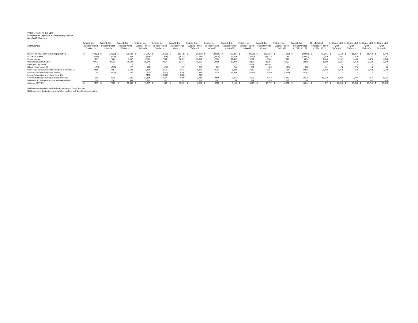 System1, Inc./S1 Holdco LLC Pro Forma for Disposition of Total Security Limited Non-GAAP Financials System1, Inc. System1, Inc. System1, Inc. System1, Inc. System1, Inc. System1, Inc. System1, Inc. System1, Inc. System1, Inc. System1, Inc. System1, Inc. System1, Inc. System1, Inc. S1 Holdco LLC S1 Holdco LLC S1 Holdco LLC S1 Holdco LLC S1 Holdco LLC (in thousands) Sucessor Period Sucessor Period Sucessor Period Sucessor Period Sucessor Period Sucessor Period Sucessor Period Sucessor Period Sucessor Period Sucessor Period Sucessor Period Sucessor Period Sucessor Period Predecessor Period QTD QTD QTD QTD 31-Mar-25 31-Dec-24 30-Sep-24 30-Jun-24 31-Mar-24 31-Dec-23 30-Sep-23 30-Jun-23 31-Mar-23 31-Dec-22 30-Sep-22 30-Jun-22 1.27.22 - 3.31.22 1.1.22 - 1.26.22 31-Dec-21 30-Sep-21 30-Jun-21 31-Mar-21 Net income (loss) from continuing operations (19,857)$ (18,023)$ (30,639)$ (34,845)$ (13,791)$ (25,428)$ (25,929)$ (29,506)$ (30,395)$ (29,800)$ (297,817)$ (17,688)$ (39,061)$ (37,061)$ 3,113$ 11,367$ 11,772$ 6,743$ Income tax expense (387) (729) 585 (178) (48) (8,757) (1,116) (6,670) (3,829) (15,252) (77,715) 1,089 (16,803) (629) 262 475 77 151 Interest expense 7,085 7,764 7,957 7,871 7,970 11,957 13,053 12,334 11,402 9,692 9,664 7,200 5,054 1,049 4,162 4,185 4,476 4,048 Depreciation & amortization 20,477 20,232 20,128 19,943 19,804 19,737 19,585 19,689 19,393 19,102 18,924 18,827 12,618 1,000 3,625 3,458 3,113 3,689 Impairment of goodwill - - - - - - - - - 26,636 346,092 - - - - - - - Other income/expense (1) (39) (111) 127 (36) (97) 187 639 271 (65) 1,280 (400) (68) 228 (61) 70 (25) 18 84 Stock-based compensation and distributions to Members (2) 2,651 4,567 3,783 3,442 3,971 5,842 5,267 4,294 5,832 6,867 7,817 7,716 33,511 23,362 3,458 673 3,342 2,118 Revaluation of non-cash warrant liability 32 (915) 281 (1,501) (251) 1,764 (7,482) 2,018 (1,409) (10,360) 4,489 (4,139) 13,761 - - - - - Loss on Extinguishment of related-party debt - - - (433) (19,676) 1,385 619 - - - - - - - - - - - Costs related to acquisitions/business combinations 1,034 3,028 7,441 11,854 2,244 3,269 1,710 2,589 3,471 4,371 4,242 5,342 10,129 13,162 8,002 2,786 655 1,547 Other costs, including restructuring and legal settlements 1,091 2,067 683 3,810 297 57 1,760 1,087 755 1,876 475 353 206 - 4 126 262 428 Adjusted EBITDA 12,085$ 17,880$ 10,346$ 9,927$ 423$ 10,012$ 8,105$ 6,105$ 5,154$ 14,413$ 15,772$ 18,631$ 19,644$ 822$ 22,696$ 23,046$ 23,715$ 18,809$ (1) Non-cash adjustments related to foreign exchange and asset disposals (2) Comprised of distributions to equity holders and non-cash stock-based compensation