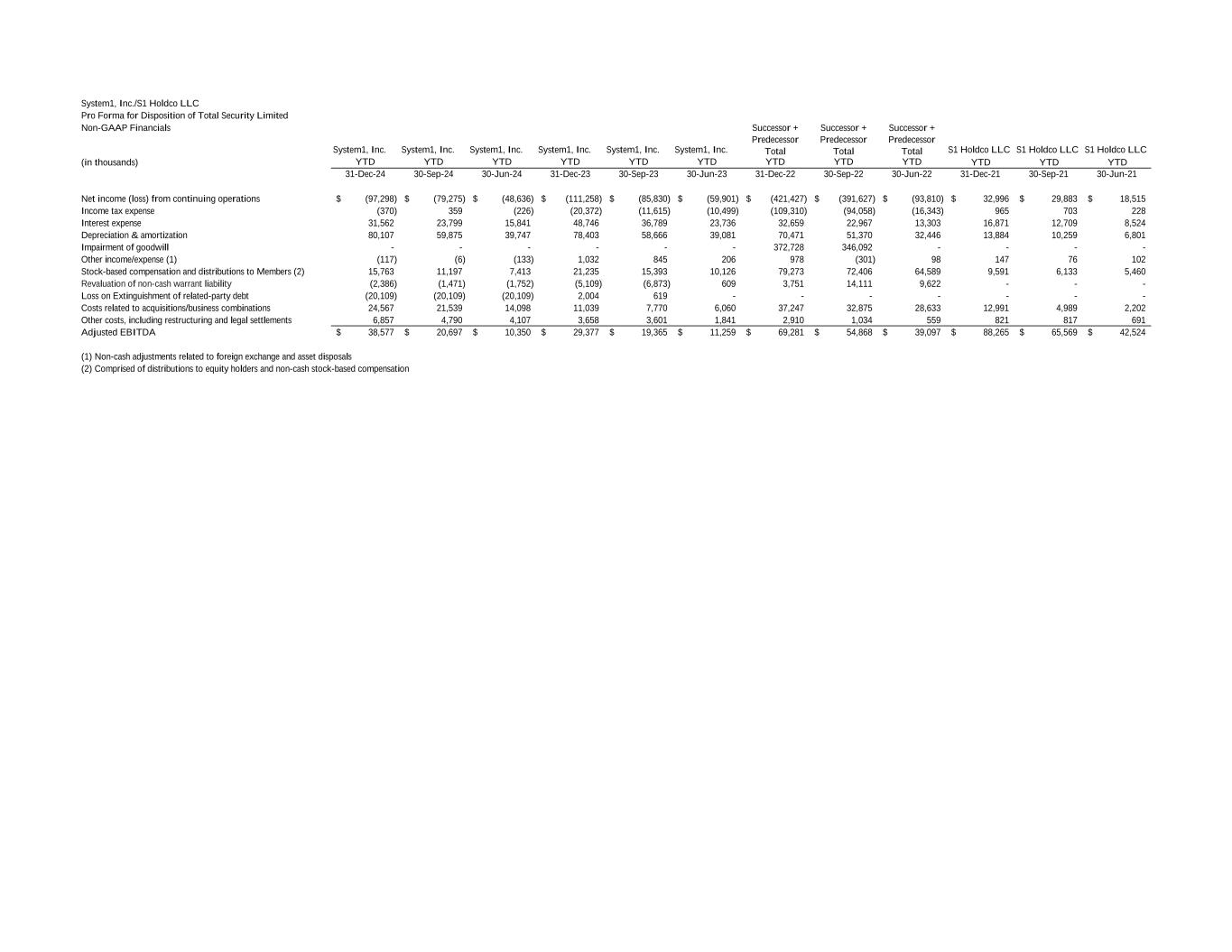 System1, Inc./S1 Holdco LLC Pro Forma for Disposition of Total Security Limited Non-GAAP Financials System1, Inc. System1, Inc. System1, Inc. System1, Inc. System1, Inc. System1, Inc. Successor + Predecessor Total Successor + Predecessor Total Successor + Predecessor Total S1 Holdco LLC S1 Holdco LLC S1 Holdco LLC (in thousands) YTD YTD YTD YTD YTD YTD YTD YTD YTD YTD YTD YTD 31-Dec-24 30-Sep-24 30-Jun-24 31-Dec-23 30-Sep-23 30-Jun-23 31-Dec-22 30-Sep-22 30-Jun-22 31-Dec-21 30-Sep-21 30-Jun-21 Net income (loss) from continuing operations (97,298)$ (79,275)$ (48,636)$ (111,258)$ (85,830)$ (59,901)$ (421,427)$ (391,627)$ (93,810)$ 32,996$ 29,883$ 18,515$ Income tax expense (370) 359 (226) (20,372) (11,615) (10,499) (109,310) (94,058) (16,343) 965 703 228 Interest expense 31,562 23,799 15,841 48,746 36,789 23,736 32,659 22,967 13,303 16,871 12,709 8,524 Depreciation & amortization 80,107 59,875 39,747 78,403 58,666 39,081 70,471 51,370 32,446 13,884 10,259 6,801 Impairment of goodwill - - - - - - 372,728 346,092 - - - - Other income/expense (1) (117) (6) (133) 1,032 845 206 978 (301) 98 147 76 102 Stock-based compensation and distributions to Members (2) 15,763 11,197 7,413 21,235 15,393 10,126 79,273 72,406 64,589 9,591 6,133 5,460 Revaluation of non-cash warrant liability (2,386) (1,471) (1,752) (5,109) (6,873) 609 3,751 14,111 9,622 - - - Loss on Extinguishment of related-party debt (20,109) (20,109) (20,109) 2,004 619 - - - - - - - Costs related to acquisitions/business combinations 24,567 21,539 14,098 11,039 7,770 6,060 37,247 32,875 28,633 12,991 4,989 2,202 Other costs, including restructuring and legal settlements 6,857 4,790 4,107 3,658 3,601 1,841 2,910 1,034 559 821 817 691 Adjusted EBITDA 38,577$ 20,697$ 10,350$ 29,377$ 19,365$ 11,259$ 69,281$ 54,868$ 39,097$ 88,265$ 65,569$ 42,524$ (1) Non-cash adjustments related to foreign exchange and asset disposals (2) Comprised of distributions to equity holders and non-cash stock-based compensation
