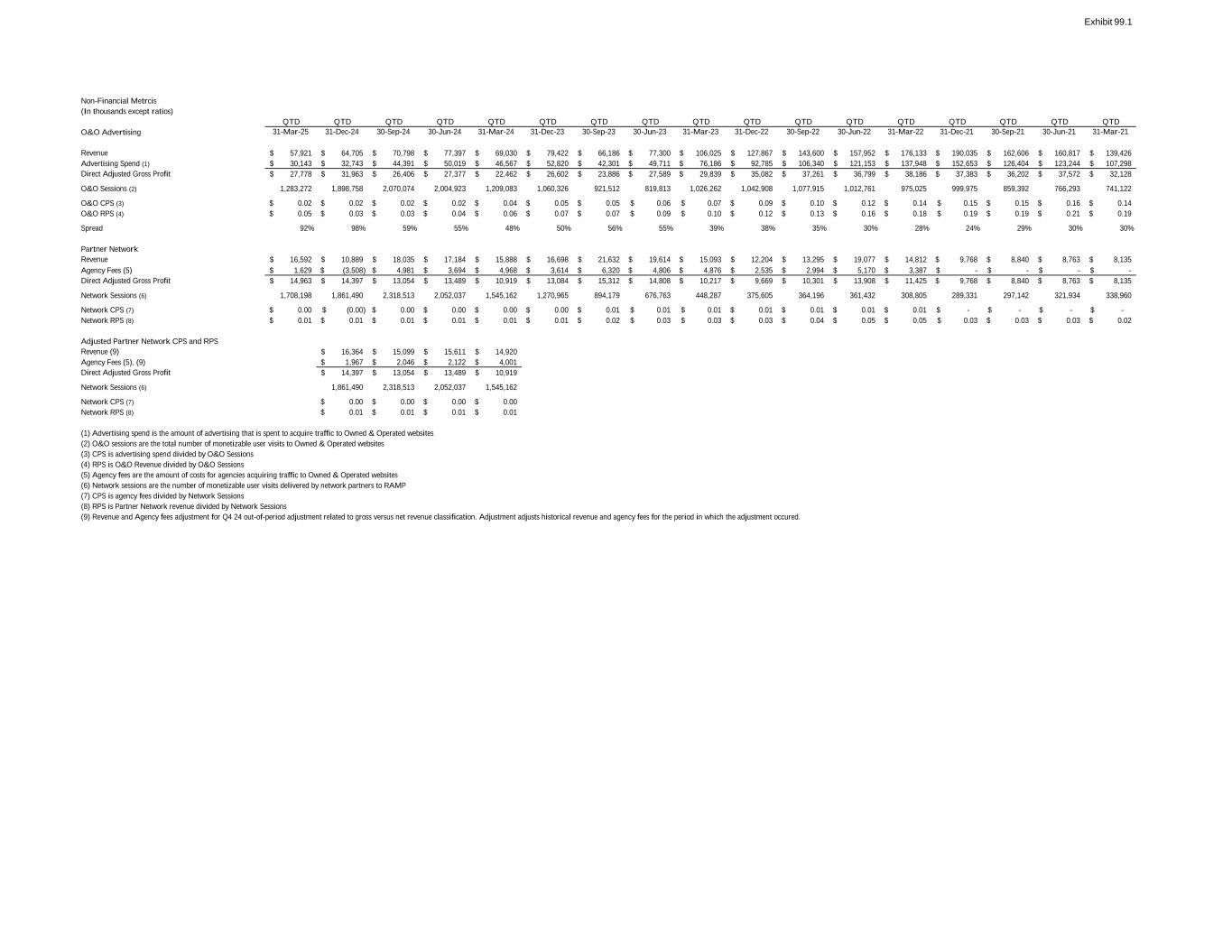 Non-Financial Metrcis (In thousands except ratios) QTD QTD QTD QTD QTD QTD QTD QTD QTD QTD QTD QTD QTD QTD QTD QTD QTD O&O Advertising 31-Mar-25 31-Dec-24 30-Sep-24 30-Jun-24 31-Mar-24 31-Dec-23 30-Sep-23 30-Jun-23 31-Mar-23 31-Dec-22 30-Sep-22 30-Jun-22 31-Mar-22 31-Dec-21 30-Sep-21 30-Jun-21 31-Mar-21 Revenue 57,921$ 64,705$ 70,798$ 77,397$ 69,030$ 79,422$ 66,186$ 77,300$ 106,025$ 127,867$ 143,600$ 157,952$ 176,133$ 190,035$ 162,606$ 160,817$ 139,426$ Advertising Spend (1) 30,143$ 32,743$ 44,391$ 50,019$ 46,567$ 52,820$ 42,301$ 49,711$ 76,186$ 92,785$ 106,340$ 121,153$ 137,948$ 152,653$ 126,404$ 123,244$ 107,298$ Direct Adjusted Gross Profit 27,778$ 31,963$ 26,406$ 27,377$ 22,462$ 26,602$ 23,886$ 27,589$ 29,839$ 35,082$ 37,261$ 36,799$ 38,186$ 37,383$ 36,202$ 37,572$ 32,128$ O&O Sessions (2) 1,283,272 1,898,758 2,070,074 2,004,923 1,209,083 1,060,326 921,512 819,813 1,026,262 1,042,908 1,077,915 1,012,761 975,025 999,975 859,392 766,293 741,122 O&O CPS (3) 0.02$ 0.02$ 0.02$ 0.02$ 0.04$ 0.05$ 0.05$ 0.06$ 0.07$ 0.09$ 0.10$ 0.12$ 0.14$ 0.15$ 0.15$ 0.16$ 0.14$ O&O RPS (4) 0.05$ 0.03$ 0.03$ 0.04$ 0.06$ 0.07$ 0.07$ 0.09$ 0.10$ 0.12$ 0.13$ 0.16$ 0.18$ 0.19$ 0.19$ 0.21$ 0.19$ Spread 92% 98% 59% 55% 48% 50% 56% 55% 39% 38% 35% 30% 28% 24% 29% 30% 30% Partner Network Revenue 16,592$ 10,889$ 18,035$ 17,184$ 15,888$ 16,698$ 21,632$ 19,614$ 15,093$ 12,204$ 13,295$ 19,077$ 14,812$ 9,768$ 8,840$ 8,763$ 8,135$ Agency Fees (5) 1,629$ (3,508)$ 4,981$ 3,694$ 4,968$ 3,614$ 6,320$ 4,806$ 4,876$ 2,535$ 2,994$ 5,170$ 3,387$ -$ -$ -$ -$ Direct Adjusted Gross Profit 14,963$ 14,397$ 13,054$ 13,489$ 10,919$ 13,084$ 15,312$ 14,808$ 10,217$ 9,669$ 10,301$ 13,908$ 11,425$ 9,768$ 8,840$ 8,763$ 8,135$ Network Sessions (6) 1,708,198 1,861,490 2,318,513 2,052,037 1,545,162 1,270,965 894,179 676,763 448,287 375,605 364,196 361,432 308,805 289,331 297,142 321,934 338,960 Network CPS (7) 0.00$ (0.00)$ 0.00$ 0.00$ 0.00$ 0.00$ 0.01$ 0.01$ 0.01$ 0.01$ 0.01$ 0.01$ 0.01$ -$ -$ -$ -$ Network RPS (8) 0.01$ 0.01$ 0.01$ 0.01$ 0.01$ 0.01$ 0.02$ 0.03$ 0.03$ 0.03$ 0.04$ 0.05$ 0.05$ 0.03$ 0.03$ 0.03$ 0.02$ Adjusted Partner Network CPS and RPS Revenue (9) 16,364$ 15,099$ 15,611$ 14,920$ Agency Fees (5), (9) 1,967$ 2,046$ 2,122$ 4,001$ Direct Adjusted Gross Profit 14,397$ 13,054$ 13,489$ 10,919$ Network Sessions (6) 1,861,490 2,318,513 2,052,037 1,545,162 Network CPS (7) 0.00$ 0.00$ 0.00$ 0.00$ Network RPS (8) 0.01$ 0.01$ 0.01$ 0.01$ (1) Advertising spend is the amount of advertising that is spent to acquire traffic to Owned & Operated websites (2) O&O sessions are the total number of monetizable user visits to Owned & Operated websites (3) CPS is advertising spend divided by O&O Sessions (4) RPS is O&O Revenue divided by O&O Sessions (5) Agency fees are the amount of costs for agencies acquiring traffic to Owned & Operated websites (6) Network sessions are the number of monetizable user visits delivered by network partners to RAMP (7) CPS is agency fees divided by Network Sessions (8) RPS is Partner Network revenue divided by Network Sessions (9) Revenue and Agency fees adjustment for Q4 24 out-of-period adjustment related to gross versus net revenue classification. Adjustment adjusts historical revenue and agency fees for the period in which the adjustment occured.