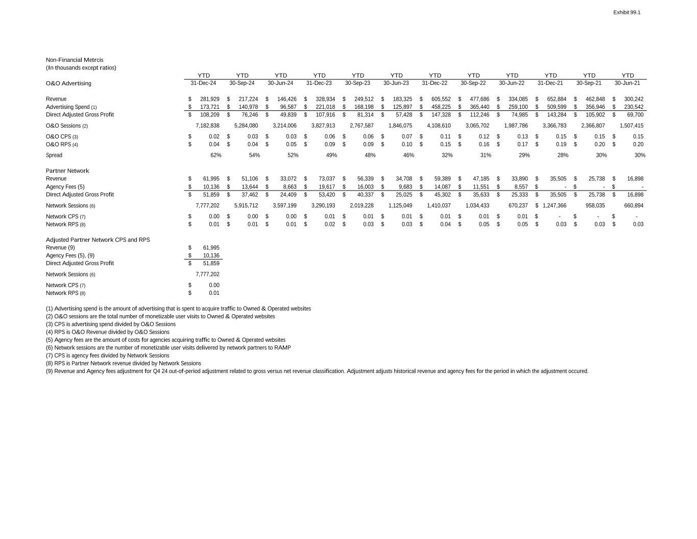 Non-Financial Metrcis (In thousands except ratios) YTD YTD YTD YTD YTD YTD YTD YTD YTD YTD YTD YTD O&O Advertising 31-Dec-24 30-Sep-24 30-Jun-24 31-Dec-23 30-Sep-23 30-Jun-23 31-Dec-22 30-Sep-22 30-Jun-22 31-Dec-21 30-Sep-21 30-Jun-21 Revenue 281,929$ 217,224$ 146,426$ 328,934$ 249,512$ 183,325$ 605,552$ 477,686$ 334,085$ 652,884$ 462,848$ 300,242$ Advertising Spend (1) 173,721$ 140,978$ 96,587$ 221,018$ 168,198$ 125,897$ 458,225$ 365,440$ 259,100$ 509,599$ 356,946$ 230,542$ Direct Adjusted Gross Profit 108,209$ 76,246$ 49,839$ 107,916$ 81,314$ 57,428$ 147,328$ 112,246$ 74,985$ 143,284$ 105,902$ 69,700$ O&O Sessions (2) 7,182,838 5,284,080 3,214,006 3,827,913 2,767,587 1,846,075 4,108,610 3,065,702 1,987,786 3,366,783 2,366,807 1,507,415 O&O CPS (3) 0.02$ 0.03$ 0.03$ 0.06$ 0.06$ 0.07$ 0.11$ 0.12$ 0.13$ 0.15$ 0.15$ 0.15$ O&O RPS (4) 0.04$ 0.04$ 0.05$ 0.09$ 0.09$ 0.10$ 0.15$ 0.16$ 0.17$ 0.19$ 0.20$ 0.20$ Spread 62% 54% 52% 49% 48% 46% 32% 31% 29% 28% 30% 30% Partner Network Revenue 61,995$ 51,106$ 33,072$ 73,037$ 56,339$ 34,708$ 59,389$ 47,185$ 33,890$ 35,505$ 25,738$ 16,898$ Agency Fees (5) 10,136$ 13,644$ 8,663$ 19,617$ 16,003$ 9,683$ 14,087$ 11,551$ 8,557$ -$ -$ -$ Direct Adjusted Gross Profit 51,859$ 37,462$ 24,409$ 53,420$ 40,337$ 25,025$ 45,302$ 35,633$ 25,333$ 35,505$ 25,738$ 16,898$ Network Sessions (6) 7,777,202 5,915,712 3,597,199 3,290,193 2,019,228 1,125,049 1,410,037 1,034,433 670,237 1,247,366$ 958,035 660,894 Network CPS (7) 0.00$ 0.00$ 0.00$ 0.01$ 0.01$ 0.01$ 0.01$ 0.01$ 0.01$ -$ -$ -$ Network RPS (8) 0.01$ 0.01$ 0.01$ 0.02$ 0.03$ 0.03$ 0.04$ 0.05$ 0.05$ 0.03$ 0.03$ 0.03$ Adjusted Partner Network CPS and RPS Revenue (9) 61,995$ Agency Fees (5), (9) 10,136$ Direct Adjusted Gross Profit 51,859$ Network Sessions (6) 7,777,202 Network CPS (7) 0.00$ Network RPS (8) 0.01$ (1) Advertising spend is the amount of advertising that is spent to acquire traffic to Owned & Operated websites (2) O&O sessions are the total number of monetizable user visits to Owned & Operated websites (3) CPS is advertising spend divided by O&O Sessions (4) RPS is O&O Revenue divided by O&O Sessions (5) Agency fees are the amount of costs for agencies acquiring traffic to Owned & Operated websites (6) Network sessions are the number of monetizable user visits delivered by network partners to RAMP (7) CPS is agency fees divided by Network Sessions (8) RPS is Partner Network revenue divided by Network Sessions (9) Revenue and Agency fees adjustment for Q4 24 out-of-period adjustment related to gross versus net revenue classification. Adjustment adjusts historical revenue and agency fees for the period in which the adjustment occured.