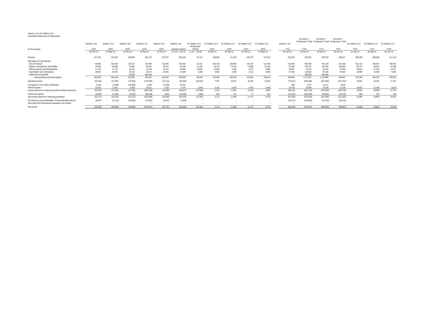 System1, Inc./S1 Holdco LLC Unaudited Statements of Operations System1, Inc. System1, Inc. System1, Inc. System1, Inc. System1, Inc. System1, Inc. S1 Holdco LLC S1 Holdco LLC S1 Holdco LLC S1 Holdco LLC S1 Holdco LLC System1, Inc. Successor + Predecessor Total Successor + Predecessor Total Successor + Predecessor Total S1 Holdco LLC S1 Holdco LLC S1 Holdco LLC (in thousands) QTD QTD QTD QTD QTD Sucessor Period Predecessor Period QTD QTD QTD QTD YTD YTD YTD YTD YTD YTD YTD 30-Jun-23 31-Mar-23 31-Dec-22 30-Sep-22 30-Jun-22 1.27.22 - 3.31.22 1.1.22 - 1.26.22 31-Dec-21 30-Sep-21 30-Jun-21 31-Mar-21 30-Jun-23 31-Dec-22 30-Sep-22 30-Jun-22 31-Dec-21 30-Sep-21 30-Jun-21 Revenue 147,238 167,854 186,859 201,176 219,797 166,108 52,712 199,803 171,446 169,579 147,561 315,092 826,652 639,793 438,617 688,389 488,586 317,140 Operating cost and expenses: Cost of revenues 93,882 120,402 128,157 137,680 152,558 120,384 41,507 155,276 128,885 126,167 110,785 214,284 580,286 452,129 314,449 521,113 365,837 236,952 Salaries, commissions, and benefits 43,991 38,398 41,665 55,602 49,511 48,198 31,181 18,715 15,139 17,698 15,195 82,389 226,157 184,492 128,890 66,747 48,032 32,893 Selling, general, and administrative 17,735 17,172 16,224 15,419 16,747 15,088 15,665 14,650 7,936 6,277 6,950 34,907 79,143 62,919 47,500 35,813 21,163 13,227 Depreciation and amortization 28,052 29,374 32,416 32,214 32,094 21,928 1,000 3,625 3,459 3,112 3,689 57,426 119,652 87,236 55,022 13,885 10,260 6,801 Impairment of goodwill - - 26,200 340,109 - - - - - - - - 366,309 340,109 - - - - Total operating costs and expenses 183,660 205,346 244,662 581,024 250,910 205,598 89,353 192,266 155,419 153,254 136,619 389,006 1,371,547 1,126,885 545,861 637,558 445,292 289,873 Operating income (36,422) (37,492) (57,803) (379,848) (31,113) (39,490) (36,641) 7,537 16,027 16,325 10,942 (73,914) (544,895) (487,092) (107,244) 50,831 43,294 27,267 Loss (gain) on Fair Value of Warrants 2,018 (1,409) (10,360) 4,489 (4,139) 13,761 - - - - - 609 3,751 14,111 9,622 - - - Interest expense 12,342 11,451 9,938 10,011 7,324 4,776 1,049 4,162 4,184 4,476 4,048 23,793 33,098 23,160 13,149 16,870 12,708 8,524 Income (loss) from continuing operations before income tax (50,782) (47,534) (57,381) (394,348) (34,298) (58,027) (37,690) 3,375 11,843 11,849 6,894 (98,316) (581,744) (524,363) (130,015) 33,961 30,586 18,743 Income tax expense (6,605) (4,408) (6,224) (80,649) (454) (14,649) (629) 262 475 77 151 (11,013) (102,605) (96,381) (15,732) 965 703 228 Net income (loss) from continuing operations (44,177) (43,126) (51,157) (313,699) (33,844) (43,378) (37,061) 3,113 11,368 11,772 6,743 (87,303) (479,139) (427,982) (114,283) 32,996 29,883 18,515 Net Income (Loss) Attributable To Noncontrolling Interest (8,947) (9,174) (18,264) (72,002) (8,107) (7,309) - - - - - (18,121) (105,682) (87,418) (15,416) - - - Gain (loss) from discontinued operations, net of taxes - - - - - - - - - - - - - - - - - - Net income (35,230) (33,952) (32,893) (241,697) (25,737) (36,069) (37,061) 3,113 11,368 11,772 6,743 (69,182) (373,457) (340,564) (98,867) 32,996 29,883 18,515