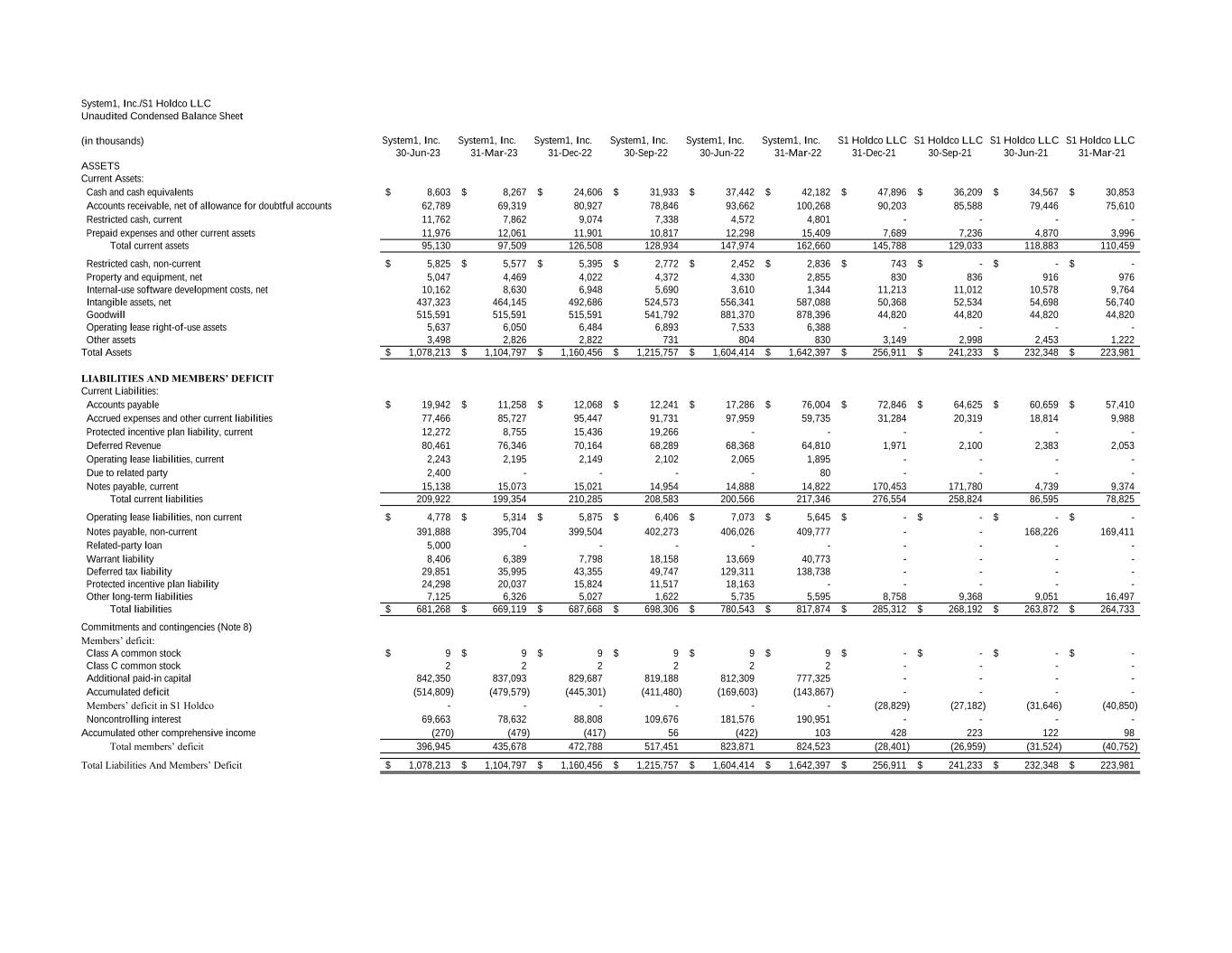 System1, Inc./S1 Holdco LLC Unaudited Condensed Balance Sheet (in thousands) System1, Inc. System1, Inc. System1, Inc. System1, Inc. System1, Inc. System1, Inc. S1 Holdco LLC S1 Holdco LLC S1 Holdco LLC S1 Holdco LLC 30-Jun-23 31-Mar-23 31-Dec-22 30-Sep-22 30-Jun-22 31-Mar-22 31-Dec-21 30-Sep-21 30-Jun-21 31-Mar-21 ASSETS Current Assets: Cash and cash equivalents 8,603$ 8,267$ 24,606$ 31,933$ 37,442$ 42,182$ 47,896$ 36,209$ 34,567$ 30,853$ Accounts receivable, net of allowance for doubtful accounts 62,789 69,319 80,927 78,846 93,662 100,268 90,203 85,588 79,446 75,610 Restricted cash, current 11,762 7,862 9,074 7,338 4,572 4,801 - - - - Prepaid expenses and other current assets 11,976 12,061 11,901 10,817 12,298 15,409 7,689 7,236 4,870 3,996 Total current assets 95,130 97,509 126,508 128,934 147,974 162,660 145,788 129,033 118,883 110,459 Restricted cash, non-current 5,825$ 5,577$ 5,395$ 2,772$ 2,452$ 2,836$ 743$ -$ -$ -$ Property and equipment, net 5,047 4,469 4,022 4,372 4,330 2,855 830 836 916 976 Internal-use software development costs, net 10,162 8,630 6,948 5,690 3,610 1,344 11,213 11,012 10,578 9,764 Intangible assets, net 437,323 464,145 492,686 524,573 556,341 587,088 50,368 52,534 54,698 56,740 Goodwill 515,591 515,591 515,591 541,792 881,370 878,396 44,820 44,820 44,820 44,820 Operating lease right-of-use assets 5,637 6,050 6,484 6,893 7,533 6,388 - - - - Other assets 3,498 2,826 2,822 731 804 830 3,149 2,998 2,453 1,222 Total Assets 1,078,213$ 1,104,797$ 1,160,456$ 1,215,757$ 1,604,414$ 1,642,397$ 256,911$ 241,233$ 232,348$ 223,981$ LIABILITIES AND MEMBERS’ DEFICIT Current Liabilities: Accounts payable 19,942$ 11,258$ 12,068$ 12,241$ 17,286$ 76,004$ 72,846$ 64,625$ 60,659$ 57,410$ Accrued expenses and other current liabilities 77,466 85,727 95,447 91,731 97,959 59,735 31,284 20,319 18,814 9,988 Protected incentive plan liability, current 12,272 8,755 15,436 19,266 - - - - - - Deferred Revenue 80,461 76,346 70,164 68,289 68,368 64,810 1,971 2,100 2,383 2,053 Operating lease liabilities, current 2,243 2,195 2,149 2,102 2,065 1,895 - - - - Due to related party 2,400 - - - - 80 - - - - Notes payable, current 15,138 15,073 15,021 14,954 14,888 14,822 170,453 171,780 4,739 9,374 Total current liabilities 209,922 199,354 210,285 208,583 200,566 217,346 276,554 258,824 86,595 78,825 Operating lease liabilities, non current 4,778$ 5,314$ 5,875$ 6,406$ 7,073$ 5,645$ -$ -$ -$ -$ Notes payable, non-current 391,888 395,704 399,504 402,273 406,026 409,777 - - 168,226 169,411 Related-party loan 5,000 - - - - - - - - - Warrant liability 8,406 6,389 7,798 18,158 13,669 40,773 - - - - Deferred tax liability 29,851 35,995 43,355 49,747 129,311 138,738 - - - - Protected incentive plan liability 24,298 20,037 15,824 11,517 18,163 - - - - - Other long-term liabilities 7,125 6,326 5,027 1,622 5,735 5,595 8,758 9,368 9,051 16,497 Total liabilities 681,268$ 669,119$ 687,668$ 698,306$ 780,543$ 817,874$ 285,312$ 268,192$ 263,872$ 264,733$ Commitments and contingencies (Note 8) Members’ deficit: Class A common stock 9$ 9$ 9$ 9$ 9$ 9$ -$ -$ -$ -$ Class C common stock 2 2 2 2 2 2 - - - - Additional paid-in capital 842,350 837,093 829,687 819,188 812,309 777,325 - - - - Accumulated deficit (514,809) (479,579) (445,301) (411,480) (169,603) (143,867) - - - - Members’ deficit in S1 Holdco - - - - - - (28,829) (27,182) (31,646) (40,850) Noncontrolling interest 69,663 78,632 88,808 109,676 181,576 190,951 - - - - Accumulated other comprehensive income (270) (479) (417) 56 (422) 103 428 223 122 98 Total members’ deficit 396,945 435,678 472,788 517,451 823,871 824,523 (28,401) (26,959) (31,524) (40,752) Total Liabilities And Members’ Deficit 1,078,213$ 1,104,797$ 1,160,456$ 1,215,757$ 1,604,414$ 1,642,397$ 256,911$ 241,233$ 232,348$ 223,981$