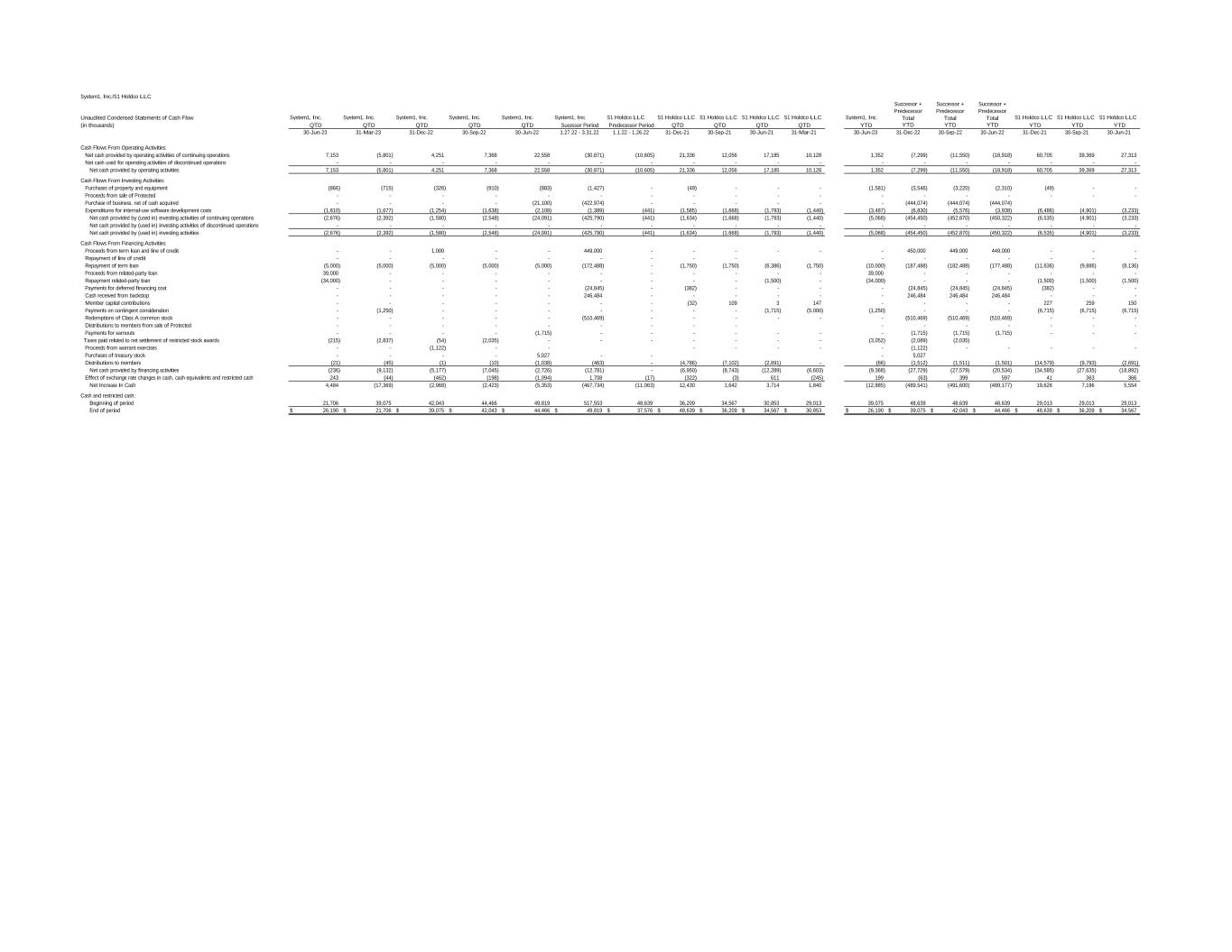 System1, Inc./S1 Holdco LLC Unaudited Condensed Statements of Cash Flow System1, Inc. System1, Inc. System1, Inc. System1, Inc. System1, Inc. System1, Inc. S1 Holdco LLC S1 Holdco LLC S1 Holdco LLC S1 Holdco LLC S1 Holdco LLC System1, Inc. Successor + Predecessor Total Successor + Predecessor Total Successor + Predecessor Total S1 Holdco LLC S1 Holdco LLC S1 Holdco LLC (in thousands) QTD QTD QTD QTD QTD Sucessor Period Predecessor Period QTD QTD QTD QTD YTD YTD YTD YTD YTD YTD YTD 30-Jun-23 31-Mar-23 31-Dec-22 30-Sep-22 30-Jun-22 1.27.22 - 3.31.22 1.1.22 - 1.26.22 31-Dec-21 30-Sep-21 30-Jun-21 31-Mar-21 30-Jun-23 31-Dec-22 30-Sep-22 30-Jun-22 31-Dec-21 30-Sep-21 30-Jun-21 Cash Flows From Operating Activities: Net cash provided by operating activities of continuing operations 7,153 (5,801) 4,251 7,368 22,558 (30,871) (10,605) 21,336 12,056 17,185 10,128 1,352 (7,299) (11,550) (18,918) 60,705 39,369 27,313 Net cash used for operating activities of discontinued operations - - - - - - - - - - - - - - - - - - Net cash provided by operating activities 7,153 (5,801) 4,251 7,368 22,558 (30,871) (10,605) 21,336 12,056 17,185 10,128 1,352 (7,299) (11,550) (18,918) 60,705 39,369 27,313 Cash Flows From Investing Activities: Purchases of property and equipment (866) (715) (326) (910) (883) (1,427) - (49) - - - (1,581) (3,546) (3,220) (2,310) (49) - - Proceeds from sale of Protected - - - - - - - - - - - - - - - - - - Purchase of business, net of cash acquired - - - - (21,100) (422,974) - - - - - - (444,074) (444,074) (444,074) Expenditures for internal-use software development costs (1,810) (1,677) (1,254) (1,638) (2,108) (1,389) (441) (1,585) (1,668) (1,793) (1,440) (3,487) (6,830) (5,576) (3,938) (6,486) (4,901) (3,233) Net cash provided by (used in) investing activities of continuing operations (2,676) (2,392) (1,580) (2,548) (24,091) (425,790) (441) (1,634) (1,668) (1,793) (1,440) (5,068) (454,450) (452,870) (450,322) (6,535) (4,901) (3,233) Net cash provided by (used in) investing activities of discontinued operations - - - - - - - - - - - - - - - - - - Net cash provided by (used in) investing activities (2,676) (2,392) (1,580) (2,548) (24,091) (425,790) (441) (1,634) (1,668) (1,793) (1,440) (5,068) (454,450) (452,870) (450,322) (6,535) (4,901) (3,233) Cash Flows From Financing Activities: Proceeds from term loan and line of credit - - 1,000 - - 449,000 - - - - - - 450,000 449,000 449,000 - - - Repayment of line of credit - - - - - - - - - - - - - - - - Repayment of term loan (5,000) (5,000) (5,000) (5,000) (5,000) (172,488) - (1,750) (1,750) (6,386) (1,750) (10,000) (187,488) (182,488) (177,488) (11,636) (9,886) (8,136) Proceeds from related-party loan 39,000 - - - - - - - - - - 39,000 - - - - - - Repayment related-party loan (34,000) - - - - - - - - (1,500) - (34,000) - - - (1,500) (1,500) (1,500) Payments for deferred financing cost - - - - - (24,845) - (382) - - - - (24,845) (24,845) (24,845) (382) - - Cash received from backstop - - - - - 246,484 - - - - - - 246,484 246,484 246,484 - - - Member capital contributions - - - - - - - (32) 109 3 147 - - - - 227 259 150 Payments on contingent consideration - (1,250) - - - - - - - (1,715) (5,000) (1,250) - - - (6,715) (6,715) (6,715) Redemptions of Class A common stock - - - - - (510,469) - - - - - - (510,469) (510,469) (510,469) - - - Distributions to members from sale of Protected - - - - - - - - - - - - - - - - Payments for earnouts - - - - (1,715) - - - - - - - (1,715) (1,715) (1,715) - - - Taxes paid related to net settlement of restricted stock awards (215) (2,837) (54) (2,035) - - - - - - - (3,052) (2,089) (2,035) Proceeds from warrant exercises - - (1,122) - - - - - - - (1,122) - - - - - Purchases of treasury stock - - - - 5,027 - - - 5,027 Distributions to members (21) (45) (1) (10) (1,038) (463) - (4,786) (7,102) (2,691) - (66) (1,512) (1,511) (1,501) (14,579) (9,793) (2,691) Net cash provided by financing activities (236) (9,132) (5,177) (7,045) (2,726) (12,781) - (6,950) (8,743) (12,289) (6,603) (9,368) (27,729) (27,579) (20,534) (34,585) (27,635) (18,892) Effect of exchange rate changes in cash, cash equivalents and restricted cash 243 (44) (462) (198) (1,094) 1,708 (17) (322) (3) 611 (245) 199 (63) 399 597 41 363 366 Net Increase In Cash 4,484 (17,369) (2,968) (2,423) (5,353) (467,734) (11,063) 12,430 1,642 3,714 1,840 (12,885) (489,541) (491,600) (489,177) 19,626 7,196 5,554 Cash and restricted cash: Beginning of period 21,706 39,075 42,043 44,466 49,819 517,553 48,639 36,209 34,567 30,853 29,013 39,075 48,639 48,639 48,639 29,013 29,013 29,013 End of period 26,190$ 21,706$ 39,075$ 42,043$ 44,466$ 49,819$ 37,576$ 48,639$ 36,209$ 34,567$ 30,853$ 26,190$ 39,075$ 42,043$ 44,466$ 48,639$ 36,209$ 34,567$