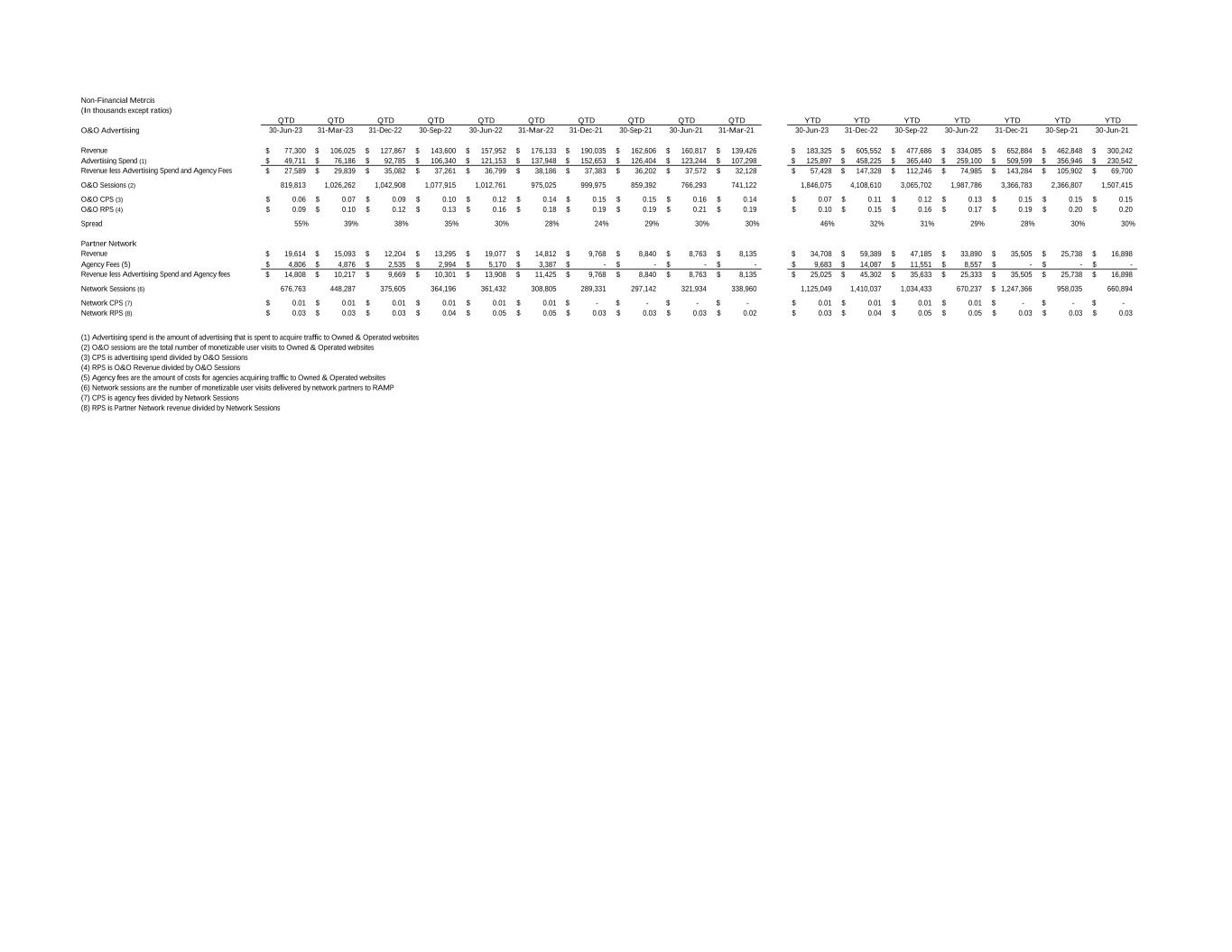 Non-Financial Metrcis (In thousands except ratios) QTD QTD QTD QTD QTD QTD QTD QTD QTD QTD YTD YTD YTD YTD YTD YTD YTD O&O Advertising 30-Jun-23 31-Mar-23 31-Dec-22 30-Sep-22 30-Jun-22 31-Mar-22 31-Dec-21 30-Sep-21 30-Jun-21 31-Mar-21 30-Jun-23 31-Dec-22 30-Sep-22 30-Jun-22 31-Dec-21 30-Sep-21 30-Jun-21 Revenue 77,300$ 106,025$ 127,867$ 143,600$ 157,952$ 176,133$ 190,035$ 162,606$ 160,817$ 139,426$ 183,325$ 605,552$ 477,686$ 334,085$ 652,884$ 462,848$ 300,242$ Advertising Spend (1) 49,711$ 76,186$ 92,785$ 106,340$ 121,153$ 137,948$ 152,653$ 126,404$ 123,244$ 107,298$ 125,897$ 458,225$ 365,440$ 259,100$ 509,599$ 356,946$ 230,542$ Revenue less Advertising Spend and Agency Fees 27,589$ 29,839$ 35,082$ 37,261$ 36,799$ 38,186$ 37,383$ 36,202$ 37,572$ 32,128$ 57,428$ 147,328$ 112,246$ 74,985$ 143,284$ 105,902$ 69,700$ O&O Sessions (2) 819,813 1,026,262 1,042,908 1,077,915 1,012,761 975,025 999,975 859,392 766,293 741,122 1,846,075 4,108,610 3,065,702 1,987,786 3,366,783 2,366,807 1,507,415 O&O CPS (3) 0.06$ 0.07$ 0.09$ 0.10$ 0.12$ 0.14$ 0.15$ 0.15$ 0.16$ 0.14$ 0.07$ 0.11$ 0.12$ 0.13$ 0.15$ 0.15$ 0.15$ O&O RPS (4) 0.09$ 0.10$ 0.12$ 0.13$ 0.16$ 0.18$ 0.19$ 0.19$ 0.21$ 0.19$ 0.10$ 0.15$ 0.16$ 0.17$ 0.19$ 0.20$ 0.20$ Spread 55% 39% 38% 35% 30% 28% 24% 29% 30% 30% 46% 32% 31% 29% 28% 30% 30% Partner Network Revenue 19,614$ 15,093$ 12,204$ 13,295$ 19,077$ 14,812$ 9,768$ 8,840$ 8,763$ 8,135$ 34,708$ 59,389$ 47,185$ 33,890$ 35,505$ 25,738$ 16,898$ Agency Fees (5) 4,806$ 4,876$ 2,535$ 2,994$ 5,170$ 3,387$ -$ -$ -$ -$ 9,683$ 14,087$ 11,551$ 8,557$ -$ -$ -$ Revenue less Advertising Spend and Agency fees 14,808$ 10,217$ 9,669$ 10,301$ 13,908$ 11,425$ 9,768$ 8,840$ 8,763$ 8,135$ 25,025$ 45,302$ 35,633$ 25,333$ 35,505$ 25,738$ 16,898$ Network Sessions (6) 676,763 448,287 375,605 364,196 361,432 308,805 289,331 297,142 321,934 338,960 1,125,049 1,410,037 1,034,433 670,237 1,247,366$ 958,035 660,894 Network CPS (7) 0.01$ 0.01$ 0.01$ 0.01$ 0.01$ 0.01$ -$ -$ -$ -$ 0.01$ 0.01$ 0.01$ 0.01$ -$ -$ -$ Network RPS (8) 0.03$ 0.03$ 0.03$ 0.04$ 0.05$ 0.05$ 0.03$ 0.03$ 0.03$ 0.02$ 0.03$ 0.04$ 0.05$ 0.05$ 0.03$ 0.03$ 0.03$ (1) Advertising spend is the amount of advertising that is spent to acquire traffic to Owned & Operated websites (2) O&O sessions are the total number of monetizable user visits to Owned & Operated websites (3) CPS is advertising spend divided by O&O Sessions (4) RPS is O&O Revenue divided by O&O Sessions (5) Agency fees are the amount of costs for agencies acquiring traffic to Owned & Operated websites (6) Network sessions are the number of monetizable user visits delivered by network partners to RAMP (7) CPS is agency fees divided by Network Sessions (8) RPS is Partner Network revenue divided by Network Sessions