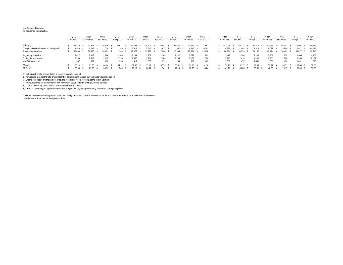 Non-Financial Metrcis (In thousands except ratios) QTD QTD QTD QTD QTD QTD QTD QTD QTD QTD YTD YTD YTD YTD YTD YTD YTD 30-Jun-23 31-Mar-23 31-Dec-22 30-Sep-22 30-Jun-22 31-Mar-22 31-Dec-21 30-Sep-21 30-Jun-21 31-Mar-21 30-Jun-23 31-Dec-22 30-Sep-22 30-Jun-22 31-Dec-21 30-Sep-21 30-Jun-21 Billings (1) 54,170$ 52,879$ 48,818$ 44,627$ 46,283$ 45,405$ 38,443$ 37,632$ 40,473$ 37,992$ 107,049$ 185,133$ 136,315$ 91,688$ 154,541$ 116,097$ 78,465$ Change in Deferred Revenue During Period 3,846$ 6,143$ 2,030$ 346$ 3,515$ 5,512$ (671)$ (567)$ 4,445$ 6,792$ 9,989$ 11,403$ 9,373$ 9,027$ 9,999$ 10,671$ 11,238$ Advertising Spend (2) 32,404$ 32,580$ 26,423$ 21,963$ 19,878$ 22,296$ 17,986$ 16,966$ 17,884$ 23,626$ 64,984$ 90,559$ 64,136$ 42,174$ 76,462$ 58,477$ 41,510$ Beginning Subscribers 2,617 2,419 2,296 2,305 2,284 2,208 2,208 2,187 2,128 1,905 2,419 2,208 2,208 2,208 1,905 1,905 1,905 Ending Subscribers (3) 2,790 2,617 2,419 2,296 2,305 2,284 2,208 2,208 2,187 2,128 2,790 2,419 2,296 2,305 2,208 2,208 2,187 New Subscribers (4) 557 531 412 338 319 388 312 298 331 462 1,088 1,457 1,045 706 1,403 1,091 793 CTA (5) 58.14$ 61.35$ 64.14$ 64.91$ 62.40$ 57.49$ 57.73$ 56.91$ 54.10$ 51.10$ 59.70$ 62.17$ 61.39$ 59.71$ 54.51$ 53.60$ 52.35$ ARPU (6) 20.04$ 21.00$ 20.71$ 19.40$ 20.17$ 20.22$ 17.41$ 17.13$ 18.76$ 18.84$ 41.11$ 80.03$ 60.53$ 40.63$ 75.15$ 56.45$ 38.35$ (1) Billings is the total amount billed to customers during a period (2) Advertising spend is the total amount spent on advertising to acquire new subscribers during a period (3) Ending subscribers are the number of paying subscribers for its products, at the end of a period (4) New subscribers are the number of new subscribers acquired for its products, during a period (5) CTA is advertising spend divided by new subscribers in a period (6) ARPU is the billings in a period divided by average of the beginning and ending subscribers during that period *Deferred revenue from billings is amortized on a straight line basis over the subscription period and recognized as revenue in the financial statements **Excludes metrics for terminated product lines