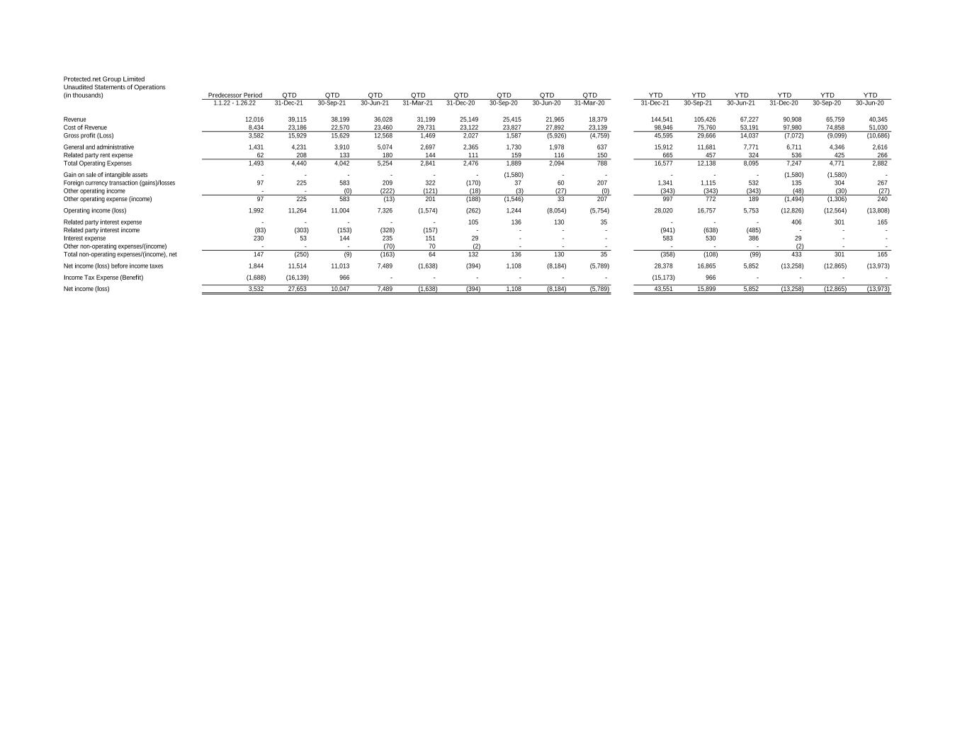 Protected.net Group Limited Unaudited Statements of Operations (in thousands) Predecessor Period QTD QTD QTD QTD QTD QTD QTD QTD YTD YTD YTD YTD YTD YTD 1.1.22 - 1.26.22 31-Dec-21 30-Sep-21 30-Jun-21 31-Mar-21 31-Dec-20 30-Sep-20 30-Jun-20 31-Mar-20 31-Dec-21 30-Sep-21 30-Jun-21 31-Dec-20 30-Sep-20 30-Jun-20 Revenue 12,016 39,115 38,199 36,028 31,199 25,149 25,415 21,965 18,379 144,541 105,426 67,227 90,908 65,759 40,345 Cost of Revenue 8,434 23,186 22,570 23,460 29,731 23,122 23,827 27,892 23,139 98,946 75,760 53,191 97,980 74,858 51,030 Gross profit (Loss) 3,582 15,929 15,629 12,568 1,469 2,027 1,587 (5,926) (4,759) 45,595 29,666 14,037 (7,072) (9,099) (10,686) - - General and administrative 1,431 4,231 3,910 5,074 2,697 2,365 1,730 1,978 637 15,912 11,681 7,771 6,711 4,346 2,616 Related party rent expense 62 208 133 180 144 111 159 116 150 665 457 324 536 425 266 Total Operating Expenses 1,493 4,440 4,042 5,254 2,841 2,476 1,889 2,094 788 16,577 12,138 8,095 7,247 4,771 2,882 - - Gain on sale of intangible assets - - - - - - (1,580) - - - - - (1,580) (1,580) - Foreign currency transaction (gains)/losses 97 225 583 209 322 (170) 37 60 207 1,341 1,115 532 135 304 267 Other operating income - - (0) (222) (121) (18) (3) (27) (0) (343) (343) (343) (48) (30) (27) Other operating expense (income) 97 225 583 (13) 201 (188) (1,546) 33 207 997 772 189 (1,494) (1,306) 240 - - Operating income (loss) 1,992 11,264 11,004 7,326 (1,574) (262) 1,244 (8,054) (5,754) 28,020 16,757 5,753 (12,826) (12,564) (13,808) - - Related party interest expense - - - - - 105 136 130 35 - - - 406 301 165 Related party interest income (83) (303) (153) (328) (157) - - - - (941) (638) (485) - - - Interest expense 230 53 144 235 151 29 - - - 583 530 386 29 - - Other non-operating expenses/(income) - - - (70) 70 (2) - - - - - - (2) - - Total non-operating expenses/(income), net 147 (250) (9) (163) 64 132 136 130 35 (358) (108) (99) 433 301 165 - - Net income (loss) before income taxes 1,844 11,514 11,013 7,489 (1,638) (394) 1,108 (8,184) (5,789) 28,378 16,865 5,852 (13,258) (12,865) (13,973) - - Income Tax Expense (Benefit) (1,688) (16,139) 966 - - - - - - (15,173) 966 - - - - - - Net income (loss) 3,532 27,653 10,047 7,489 (1,638) (394) 1,108 (8,184) (5,789) 43,551 15,899 5,852 (13,258) (12,865) (13,973)