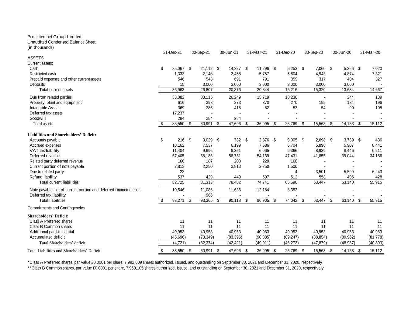 Protected.net Group Limited Unaudited Condensed Balance Sheet (in thousands) 31-Dec-21 30-Sep-21 30-Jun-21 31-Mar-21 31-Dec-20 30-Sep-20 30-Jun-20 31-Mar-20 ASSETS Current assets: Cash 35,067$ 21,112$ 14,227$ 11,296$ 6,253$ 7,060$ 5,356$ 7,020$ Restricted cash 1,333 2,148 2,458 5,757 5,604 4,943 4,874 7,321 Prepaid expenses and other current assets 546 548 691 791 359 317 404 327 Deposits 15 3,000 3,000 3,000 3,000 3,000 3,000 - Total current assets 36,963 26,807 20,376 20,844 15,216 15,320 13,634 14,667 Due from related parties 33,082 33,115 26,249 15,719 10,230 - 244 139 Property, plant and equipment 616 398 373 370 270 195 184 196 Intangible Assets 369 386 415 62 53 54 90 108 Deferred tax assets 17,237 - - - - - - - Goodwill 284 284 284 - - - - - Total assets 88,550$ 60,991$ 47,696$ 36,995$ 25,769$ 15,568$ 14,153$ 15,112$ Liabilities and Shareholders’ Deficit: Accounts payable 216$ 3,029$ 732$ 2,876$ 3,005$ 2,698$ 3,739$ 436$ Accrued expenses 10,162 7,537 6,199 7,686 6,704 5,896 5,907 8,441 VAT tax liability 11,404 9,696 9,351 6,965 6,366 8,939 8,446 6,211 Deferred revenue 57,405 58,186 58,731 54,139 47,431 41,855 39,044 34,156 Related party deferred revenue 166 187 208 229 168 - - - Current portion of note payable 2,813 2,250 2,813 2,250 1,500 - - - Due to related party 23 - - - 4 3,501 5,599 6,243 Refund liability 537 429 449 597 512 558 405 428 Total current liabilities 82,725 81,313 78,482 74,741 65,690 63,447 63,140 55,915 Note payable, net of current portion and deferred financing costs 10,546 11,086 11,636 12,164 8,352 - - - Deferred tax liability - 966 - - - - - - Total liabilities 93,271$ 93,365$ 90,118$ 86,905$ 74,042$ 63,447$ 63,140$ 55,915$ Commitments and Contingencies Shareholders’ Deficit: Class A Preferred shares 11 11 11 11 11 11 11 11 Class B Common shares 11 11 11 11 11 11 11 11 Additional paid-in capital 40,953 40,953 40,953 40,953 40,953 40,953 40,953 40,953 Accumulated deficit (45,696) (73,349) (83,396) (90,885) (89,247) (88,854) (89,962) (81,778) Total Shareholders’ deficit (4,721) (32,374) (42,421) (49,911) (48,273) (47,879) (48,987) (40,803) Total Liabilities and Shareholders’ Deficit 88,550$ 60,991$ 47,696$ 36,995$ 25,769$ 15,568$ 14,153$ 15,112$ *Class A Preferred shares, par value £0.0001 per share, 7,992,009 shares authorized, issued, and outstanding on September 30, 2021 and December 31, 2020, respectively **Class B Common shares, par value £0.0001 per share, 7,960,105 shares authorized, issued, and outstanding on September 30, 2021 and December 31, 2020, respectively