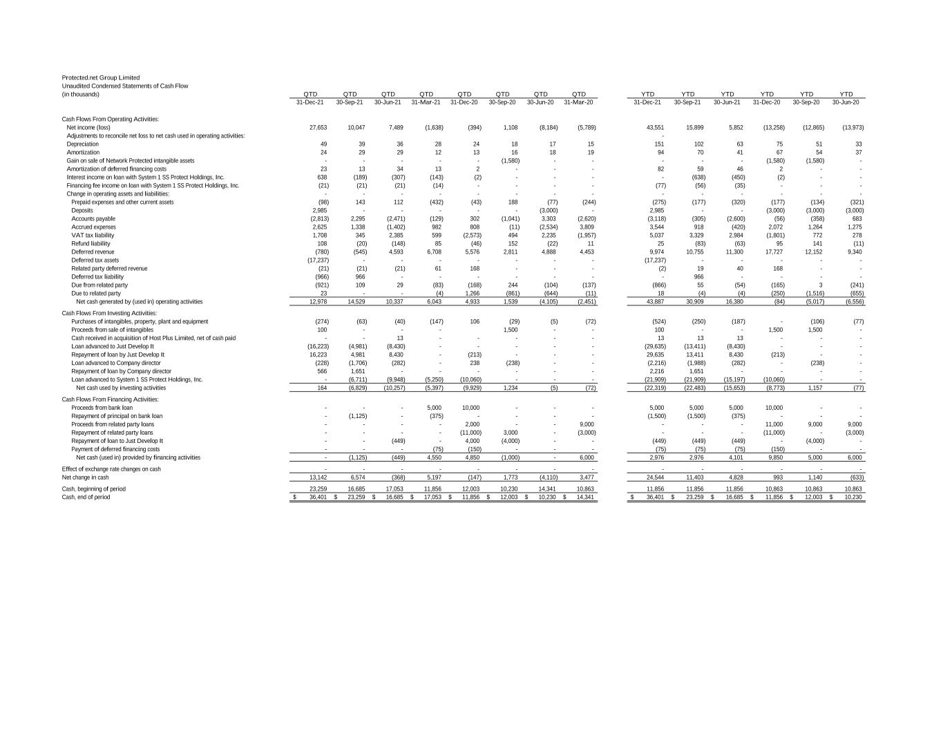 Protected.net Group Limited Unaudited Condensed Statements of Cash Flow (in thousands) QTD QTD QTD QTD QTD QTD QTD QTD YTD YTD YTD YTD YTD YTD 31-Dec-21 30-Sep-21 30-Jun-21 31-Mar-21 31-Dec-20 30-Sep-20 30-Jun-20 31-Mar-20 31-Dec-21 30-Sep-21 30-Jun-21 31-Dec-20 30-Sep-20 30-Jun-20 Cash Flows From Operating Activities: Net income (loss) 27,653 10,047 7,489 (1,638) (394) 1,108 (8,184) (5,789) 43,551 15,899 5,852 (13,258) (12,865) (13,973) Adjustments to reconcile net loss to net cash used in operating activities: - Depreciation 49 39 36 28 24 18 17 15 151 102 63 75 51 33 Amortization 24 29 29 12 13 16 18 19 94 70 41 67 54 37 Gain on sale of Network Protected intangible assets - - - - - (1,580) - - - - - (1,580) (1,580) - Amortization of deferred financing costs 23 13 34 13 2 - - - 82 59 46 2 - - Interest income on loan with System 1 SS Protect Holdings, Inc. 638 (189) (307) (143) (2) - - - - (638) (450) (2) - - Financing fee income on loan with System 1 SS Protect Holdings, Inc. (21) (21) (21) (14) - - - - (77) (56) (35) - - - Change in operating assets and liabilities: - - - - - - - - - - - - - - Prepaid expenses and other current assets (98) 143 112 (432) (43) 188 (77) (244) (275) (177) (320) (177) (134) (321) Deposits 2,985 - - - - - (3,000) - 2,985 - - (3,000) (3,000) (3,000) Accounts payable (2,813) 2,295 (2,471) (129) 302 (1,041) 3,303 (2,620) (3,118) (305) (2,600) (56) (358) 683 Accrued expenses 2,625 1,338 (1,402) 982 808 (11) (2,534) 3,809 3,544 918 (420) 2,072 1,264 1,275 VAT tax liability 1,708 345 2,385 599 (2,573) 494 2,235 (1,957) 5,037 3,329 2,984 (1,801) 772 278 Refund liability 108 (20) (148) 85 (46) 152 (22) 11 25 (83) (63) 95 141 (11) Deferred revenue (780) (545) 4,593 6,708 5,576 2,811 4,888 4,453 9,974 10,755 11,300 17,727 12,152 9,340 Deferred tax assets (17,237) - - - - - - - (17,237) - - - - - Related party deferred revenue (21) (21) (21) 61 168 - - - (2) 19 40 168 - - Deferred tax liability (966) 966 - - - - - - - 966 - - - - Due from related party (921) 109 29 (83) (168) 244 (104) (137) (866) 55 (54) (165) 3 (241) Due to related party 23 - - (4) 1,266 (861) (644) (11) 18 (4) (4) (250) (1,516) (655) Net cash generated by (used in) operating activities 12,978 14,529 10,337 6,043 4,933 1,539 (4,105) (2,451) 43,887 30,909 16,380 (84) (5,017) (6,556) Cash Flows From Investing Activities: Purchases of intangibles, property, plant and equipment (274) (63) (40) (147) 106 (29) (5) (72) (524) (250) (187) - (106) (77) Proceeds from sale of intangibles 100 - - - 1,500 - - 100 - - 1,500 1,500 - Cash received in acquisition of Host Plus Limited, net of cash paid - - 13 - - - - - 13 13 13 - - - Loan advanced to Just Develop It (16,223) (4,981) (8,430) - - - - - (29,635) (13,411) (8,430) - - - Repayment of loan by Just Develop It 16,223 4,981 8,430 - (213) - - - 29,635 13,411 8,430 (213) - - Loan advanced to Company director (228) (1,706) (282) - 238 (238) - - (2,216) (1,988) (282) - (238) - Repayment of loan by Company director 566 1,651 - - - - - - 2,216 1,651 - - - - Loan advanced to System 1 SS Protect Holdings, Inc. - (6,711) (9,948) (5,250) (10,060) - - - (21,909) (21,909) (15,197) (10,060) - - Net cash used by investing activities 164 (6,829) (10,257) (5,397) (9,929) 1,234 (5) (72) (22,319) (22,483) (15,653) (8,773) 1,157 (77) Cash Flows From Financing Activities: Proceeds from bank loan - - - 5,000 10,000 - - - 5,000 5,000 5,000 10,000 - - Repayment of principal on bank loan - (1,125) - (375) - - - - (1,500) (1,500) (375) - - - Proceeds from related party loans - - - - 2,000 - - 9,000 - - - 11,000 9,000 9,000 Repayment of related party loans - - - - (11,000) 3,000 - (3,000) - - - (11,000) - (3,000) Repayment of loan to Just Develop It - - (449) - 4,000 (4,000) - - (449) (449) (449) - (4,000) - Payment of deferred financing costs - - - (75) (150) - - - (75) (75) (75) (150) - - Net cash (used in) provided by financing activities - (1,125) (449) 4,550 4,850 (1,000) - 6,000 2,976 2,976 4,101 9,850 5,000 6,000 Effect of exchange rate changes on cash - - - - - - - - - - - - - - Net change in cash 13,142 6,574 (368) 5,197 (147) 1,773 (4,110) 3,477 24,544 11,403 4,828 993 1,140 (633) Cash, beginning of period 23,259 16,685 17,053 11,856 12,003 10,230 14,341 10,863 11,856 11,856 11,856 10,863 10,863 10,863 Cash, end of period 36,401$ 23,259$ 16,685$ 17,053$ 11,856$ 12,003$ 10,230$ 14,341$ 36,401$ 23,259$ 16,685$ 11,856$ 12,003$ 10,230$