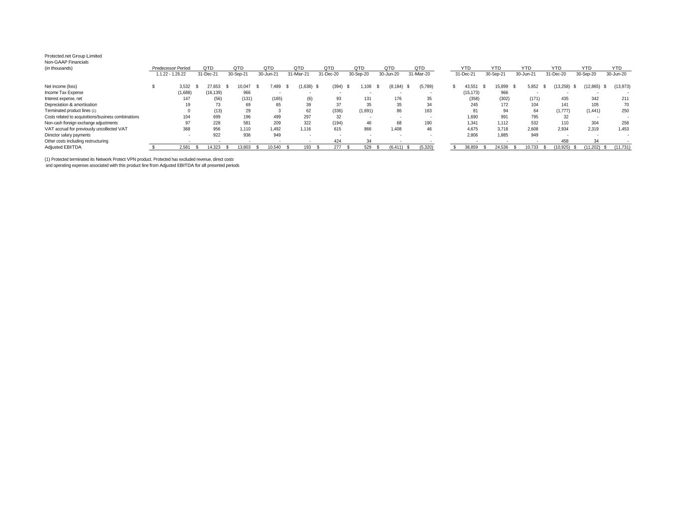 Protected.net Group Limited Non-GAAP Financials (in thousands) Predecessor Period QTD QTD QTD QTD QTD QTD QTD QTD YTD YTD YTD YTD YTD YTD 1.1.22 - 1.26.22 31-Dec-21 30-Sep-21 30-Jun-21 31-Mar-21 31-Dec-20 30-Sep-20 30-Jun-20 31-Mar-20 31-Dec-21 30-Sep-21 30-Jun-21 31-Dec-20 30-Sep-20 30-Jun-20 Net income (loss) 3,532$ 27,653$ 10,047$ 7,489$ (1,638)$ (394)$ 1,108$ (8,184)$ (5,789)$ 43,551$ 15,899$ 5,852$ (13,258)$ (12,865)$ (13,973)$ Income Tax Expense (1,688) (16,139) 966 - - - - - - (15,173) 966 - - - - Interest expense, net 147 (56) (131) (165) (6) 93 131 176 35 (358) (302) (171) 435 342 211 Depreciation & amortisation 19 73 69 65 39 37 35 35 34 245 172 104 141 105 70 Terminated product lines (1) 0 (13) 29 3 62 (336) (1,691) 86 163 81 94 64 (1,777) (1,441) 250 Costs related to acquisitions/business combinations 104 699 196 499 297 32 - - - 1,690 991 795 32 - - Non-cash foreign exchange adjustments 97 228 581 209 322 (194) 46 68 190 1,341 1,112 532 110 304 258 VAT accrual for previously uncollected VAT 368 956 1,110 1,492 1,116 615 866 1,408 46 4,675 3,718 2,608 2,934 2,319 1,453 Director salary payments - 922 936 949 - - - - - 2,806 1,885 949 - - - Other costs including restructuring - - - - - 424 34 - - - - - 458 34 - Adjusted EBITDA 2,581$ 14,323$ 13,803$ 10,540$ 193$ 277$ 529$ (6,411)$ (5,320)$ 38,859$ 24,536$ 10,733$ (10,925)$ (11,202)$ (11,731)$ (1) Protected terminated its Network Protect VPN product. Protected has excluded revenue, direct costs and operating expenses associated with this product line from Adjusted EBITDA for all presented periods