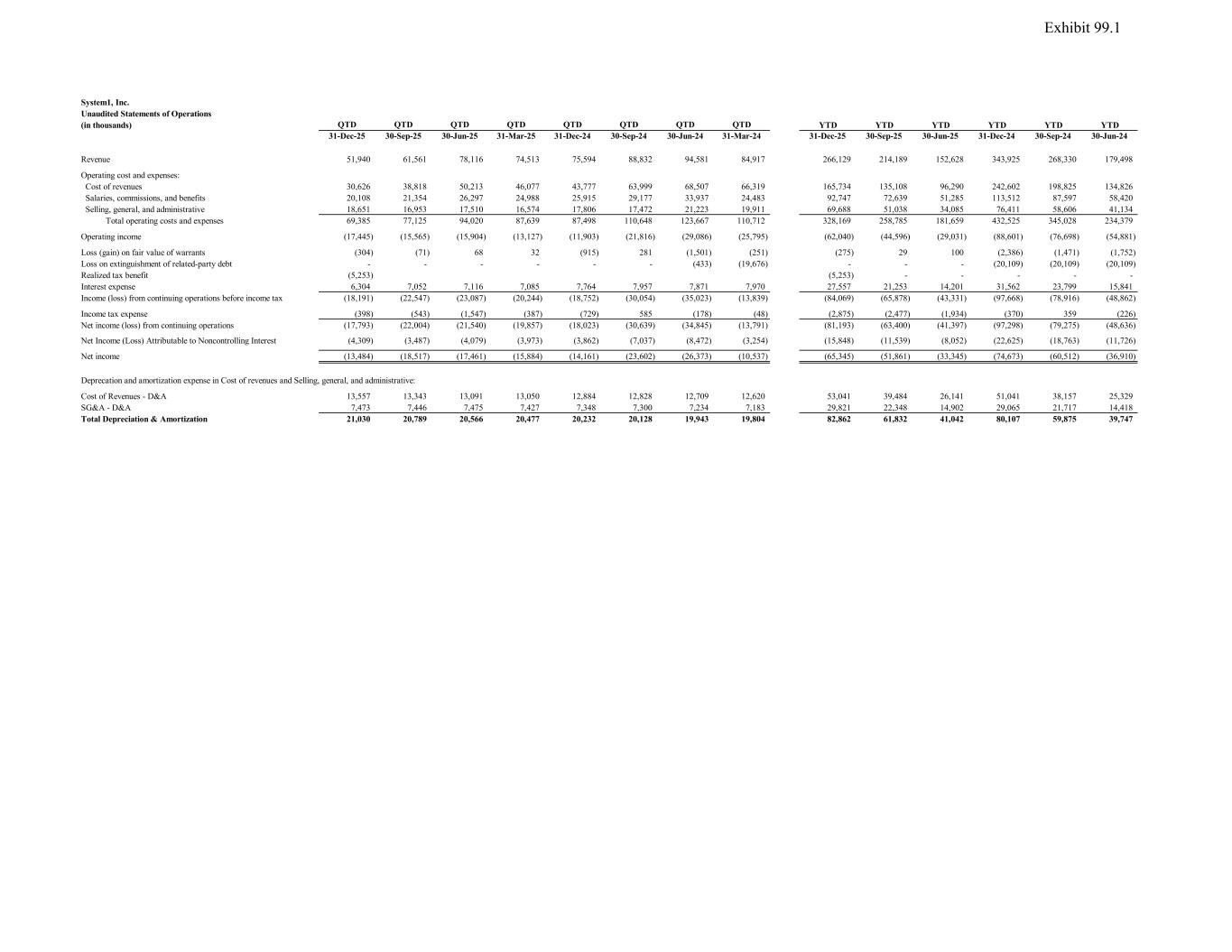 System1, Inc. Unaudited Statements of Operations (in thousands) QTD QTD QTD QTD QTD QTD QTD QTD YTD YTD YTD YTD YTD YTD 31-Dec-25 30-Sep-25 30-Jun-25 31-Mar-25 31-Dec-24 30-Sep-24 30-Jun-24 31-Mar-24 31-Dec-25 30-Sep-25 30-Jun-25 31-Dec-24 30-Sep-24 30-Jun-24 Revenue 51,940 61,561 78,116 74,513 75,594 88,832 94,581 84,917 266,129 214,189 152,628 343,925 268,330 179,498 Operating cost and expenses: Cost of revenues 30,626 38,818 50,213 46,077 43,777 63,999 68,507 66,319 165,734 135,108 96,290 242,602 198,825 134,826 Salaries, commissions, and benefits 20,108 21,354 26,297 24,988 25,915 29,177 33,937 24,483 92,747 72,639 51,285 113,512 87,597 58,420 Selling, general, and administrative 18,651 16,953 17,510 16,574 17,806 17,472 21,223 19,911 69,688 51,038 34,085 76,411 58,606 41,134 Total operating costs and expenses 69,385 77,125 94,020 87,639 87,498 110,648 123,667 110,712 328,169 258,785 181,659 432,525 345,028 234,379 Operating income (17,445) (15,565) (15,904) (13,127) (11,903) (21,816) (29,086) (25,795) (62,040) (44,596) (29,031) (88,601) (76,698) (54,881) Loss (gain) on fair value of warrants (304) (71) 68 32 (915) 281 (1,501) (251) (275) 29 100 (2,386) (1,471) (1,752) Loss on extinguishment of related-party debt - - - - - - (433) (19,676) - - - (20,109) (20,109) (20,109) Realized tax benefit (5,253) (5,253) - - - - - Interest expense 6,304 7,052 7,116 7,085 7,764 7,957 7,871 7,970 27,557 21,253 14,201 31,562 23,799 15,841 Income (loss) from continuing operations before income tax (18,191) (22,547) (23,087) (20,244) (18,752) (30,054) (35,023) (13,839) (84,069) (65,878) (43,331) (97,668) (78,916) (48,862) Income tax expense (398) (543) (1,547) (387) (729) 585 (178) (48) (2,875) (2,477) (1,934) (370) 359 (226) Net income (loss) from continuing operations (17,793) (22,004) (21,540) (19,857) (18,023) (30,639) (34,845) (13,791) (81,193) (63,400) (41,397) (97,298) (79,275) (48,636) Net Income (Loss) Attributable to Noncontrolling Interest (4,309) (3,487) (4,079) (3,973) (3,862) (7,037) (8,472) (3,254) (15,848) (11,539) (8,052) (22,625) (18,763) (11,726) Net income (13,484) (18,517) (17,461) (15,884) (14,161) (23,602) (26,373) (10,537) (65,345) (51,861) (33,345) (74,673) (60,512) (36,910) Deprecation and amortization expense in Cost of revenues and Selling, general, and administrative: Cost of Revenues - D&A 13,557 13,343 13,091 13,050 12,884 12,828 12,709 12,620 53,041 39,484 26,141 51,041 38,157 25,329 SG&A - D&A 7,473 7,446 7,475 7,427 7,348 7,300 7,234 7,183 29,821 22,348 14,902 29,065 21,717 14,418 Total Depreciation & Amortization 21,030 20,789 20,566 20,477 20,232 20,128 19,943 19,804 82,862 61,832 41,042 80,107 59,875 39,747