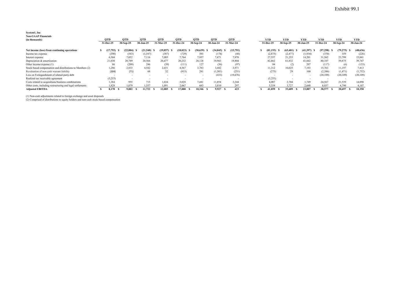 System1, Inc Non-GAAP Financials (in thousands) QTD QTD QTD QTD QTD QTD QTD QTD YTD YTD YTD YTD YTD YTD 31-Dec-25 30-Sep-25 30-Jun-25 31-Mar-25 31-Dec-24 30-Sep-24 30-Jun-24 31-Mar-24 31-Dec-25 30-Sep-25 30-Jun-25 31-Dec-24 30-Sep-24 30-Jun-24 Net income (loss) from continuing operations (17,793)$ (22,004)$ (21,540)$ (19,857)$ (18,023)$ (30,639)$ (34,845)$ (13,791)$ (81,193)$ (63,401)$ (41,397)$ (97,298)$ (79,275)$ (48,636)$ Income tax expense (398) (543) (1,547) (387) (729) 585 (178) (48) (2,875) (2,477) (1,934) (370) 359 (226) Interest expense 6,304 7,052 7,116 7,085 7,764 7,957 7,871 7,970 27,557 21,253 14,201 31,562 23,799 15,841 Depreciation & amortization 21,030 20,789 20,566 20,477 20,232 20,128 19,943 19,804 82,862 61,832 41,042 80,107 59,875 39,747 Other income/expense (1) 86 (209) 246 (39) (111) 127 (36) (97) 84 (2) 207 (117) (6) (133) Stock-based compensation and distributions to Members (2) 1,286 2,833 4,542 2,651 4,567 3,783 3,442 3,971 11,312 10,025 7,193 15,763 11,197 7,413 Revaluation of non-cash warrant liability (304) (71) 68 32 (915) 281 (1,501) (251) (275) 29 100 (2,386) (1,471) (1,752) Loss on Extinguishment of related-party debt - - - - - - (433) (19,676) - - - (20,109) (20,109) (20,109) Realized tax receivable agreement (5,253) - - - - - - - (5,253) - - - - - Costs related to acquisitions/business combinations 1,384 955 715 1,034 3,028 7,441 11,854 2,244 4,087 2,704 1,749 24,567 21,539 14,098 Other costs, including restructuring and legal settlements 1,828 1,079 1,557 1,091 2,067 683 3,810 297 5,554 3,727 2,648 6,857 4,790 4,107 Adjusted EBITDA 8,170$ 9,882$ 11,722$ 12,085$ 17,880$ 10,346$ 9,927$ 423$ 41,859$ 33,689$ 23,807$ 38,577$ 20,697$ 10,350$ (1) Non-cash adjustments related to foreign exchange and asset disposals (2) Comprised of distributions to equity holders and non-cash stock-based compensation