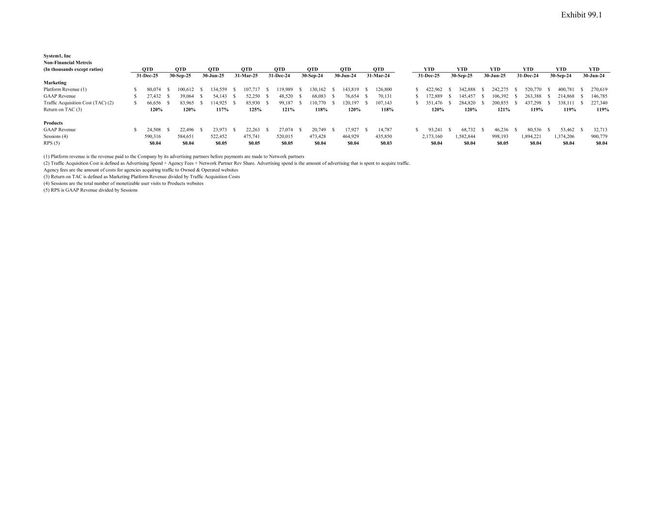 System1, Inc Non-Financial Metrcis (In thousands except ratios) QTD QTD QTD QTD QTD QTD QTD QTD YTD YTD YTD YTD YTD YTD 31-Dec-25 30-Sep-25 30-Jun-25 31-Mar-25 31-Dec-24 30-Sep-24 30-Jun-24 31-Mar-24 31-Dec-25 30-Sep-25 30-Jun-25 31-Dec-24 30-Sep-24 30-Jun-24 Marketing Platform Revenue (1) 80,074$ 100,612$ 134,559$ 107,717$ 119,989$ 130,162$ 143,819$ 126,800$ 422,962$ 342,888$ 242,275$ 520,770$ 400,781$ 270,619$ GAAP Revenue 27,432$ 39,064$ 54,143$ 52,250$ 48,520$ 68,083$ 76,654$ 70,131$ 172,889$ 145,457$ 106,392$ 263,388$ 214,868$ 146,785$ Traffic Acquisition Cost (TAC) (2) 66,656$ 83,965$ 114,925$ 85,930$ 99,187$ 110,770$ 120,197$ 107,143$ 351,476$ 284,820$ 200,855$ 437,298$ 338,111$ 227,340$ Return on TAC (3) 120% 120% 117% 125% 121% 118% 120% 118% 120% 120% 121% 119% 119% 119% Products GAAP Revenue 24,508$ 22,496$ 23,973$ 22,263$ 27,074$ 20,749$ 17,927$ 14,787$ 93,241$ 68,732$ 46,236$ 80,536$ 53,462$ 32,713$ Sessions (4) 590,316 584,651 522,452 475,741 520,015 473,428 464,929 435,850 2,173,160 1,582,844 998,193 1,894,221 1,374,206 900,779 RPS (5) $0.04 $0.04 $0.05 $0.05 $0.05 $0.04 $0.04 $0.03 $0.04 $0.04 $0.05 $0.04 $0.04 $0.04 (1) Platform revenue is the revenue paid to the Company by its advertising partners before payments are made to Network partners (2) Traffic Acquisition Cost is defined as Advertising Spend + Agency Fees + Network Partner Rev Share. Advertising spend is the amount of advertising that is spent to acquire traffic. Agency fees are the amount of costs for agencies acquiring traffic to Owned & Operated websites (3) Return on TAC is defined as Marketing Platform Revenue divided by Traffic Acquisition Costs (4) Sessions are the total number of monetizable user visits to Products websites (5) RPS is GAAP Revenue divided by Sessions