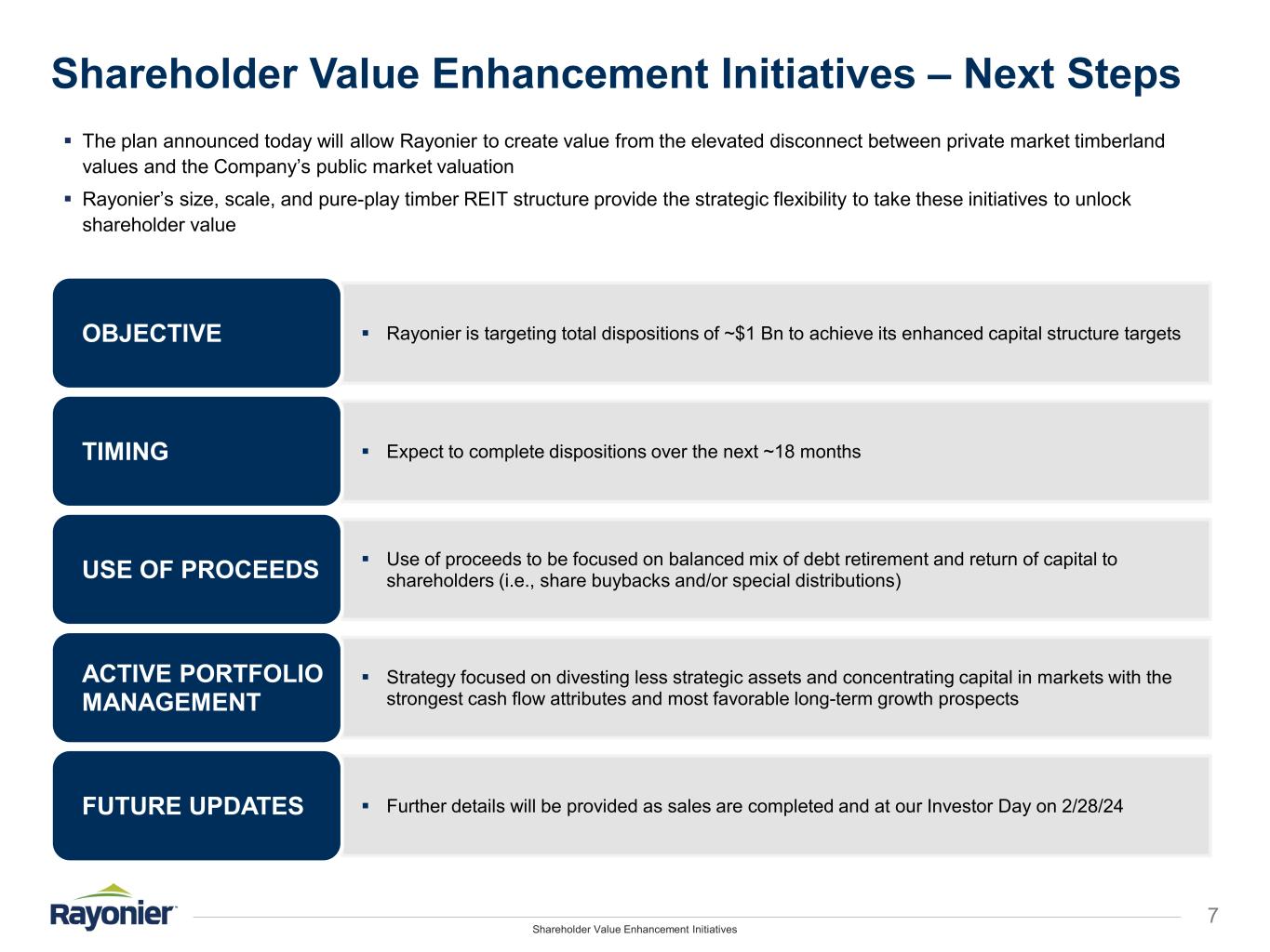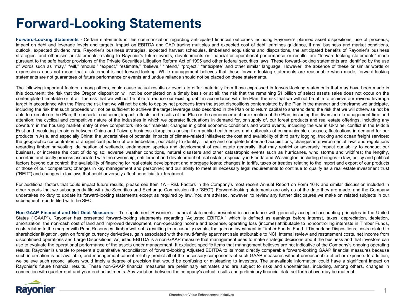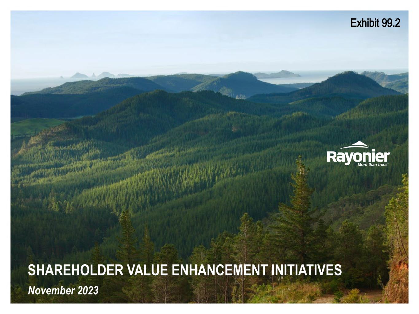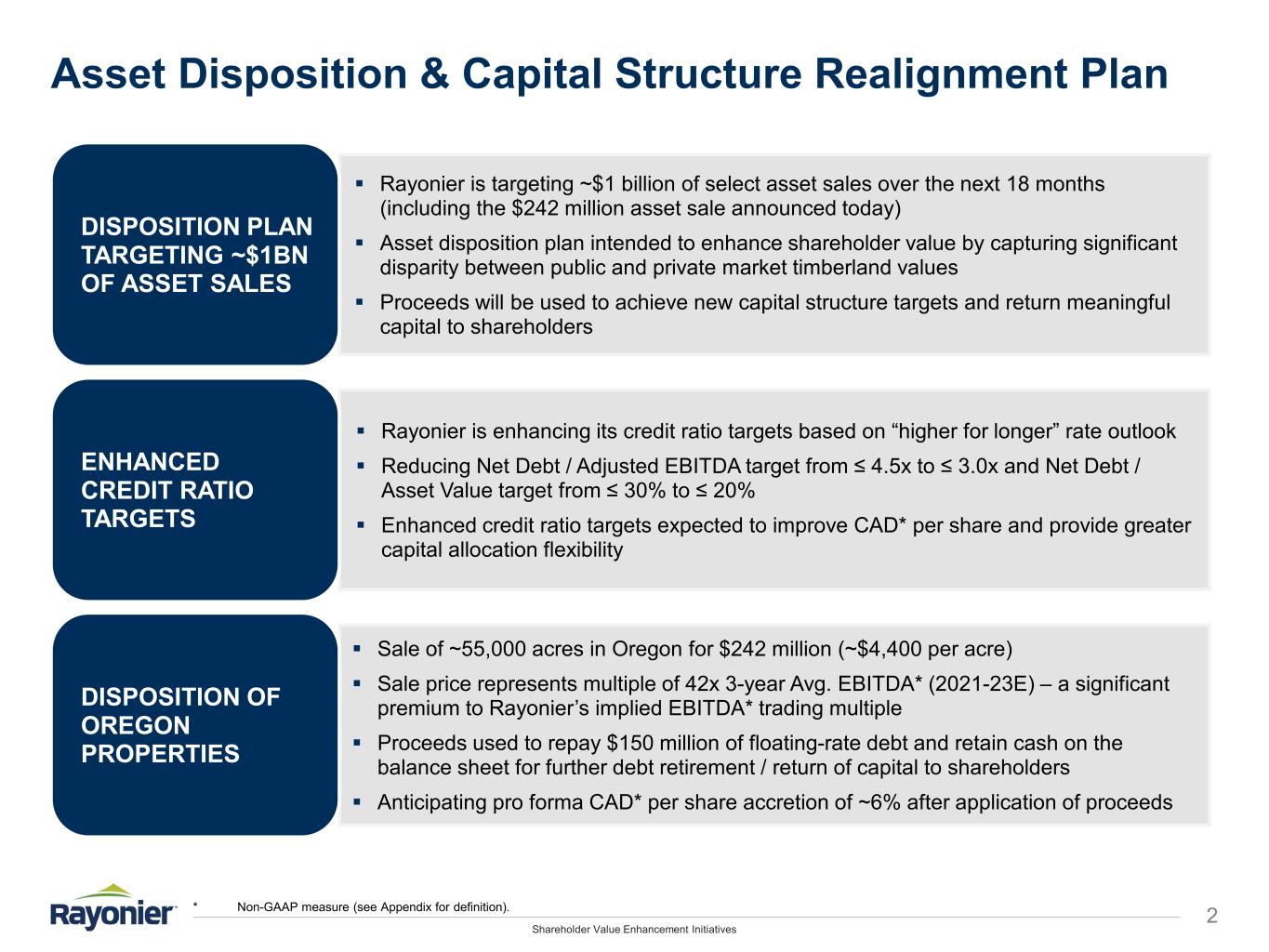 Shareholder Value Enhancement Initiatives Forward-Looking Statements 1 Forward-Looking Statements - Certain statements in this communication regarding anticipated financial outcomes including Rayonier’s planned asset dispositions, use of proceeds, impact on debt and leverage levels and targets, impact on EBITDA and CAD trading multiples and expected cost of debt, earnings guidance, if any, business and market conditions, outlook, expected dividend rate, Rayonier’s business strategies, expected harvest schedules, timberland acquisitions and dispositions, the anticipated benefits of Rayonier’s business strategies, and other similar statements relating to Rayonier’s future events, developments or financial or operational performance or results, are “forward-looking statements” made pursuant to the safe harbor provisions of the Private Securities Litigation Reform Act of 1995 and other federal securities laws. These forward-looking statements are identified by the use of words such as “may,” “will,” “should,” “expect,” “estimate,” “believe,” “intend,” “project,” “anticipate” and other similar language. However, the absence of these or similar words or expressions does not mean that a statement is not forward-looking. While management believes that these forward-looking statements are reasonable when made, forward-looking statements are not guarantees of future performance or events and undue reliance should not be placed on these statements. The following important factors, among others, could cause actual results or events to differ materially from those expressed in forward-looking statements that may have been made in this document: the risk that the Oregon disposition will not be completed on a timely basis or at all; the risk that the remaining $1 billion of select assets sales does not occur on the contemplated timetable or at all; the risk that we will not be able to reduce our existing debt in accordance with the Plan; the risk that we will not be able to achieve our revised leverage target in accordance with the Plan; the risk that we will not be able to deploy net proceeds from the asset dispositions contemplated by the Plan in the manner and timeframe we anticipate, including the risk that such proceeds will not be sufficient to achieve the target leverage ratio described in the Plan or to return capital to shareholders; the risk that we will otherwise not be able to execute on the Plan; the uncertain outcome, impact, effects and results of the Plan or the announcement or execution of the Plan, including the diversion of management time and attention; the cyclical and competitive nature of the industries in which we operate; fluctuations in demand for, or supply of, our forest products and real estate offerings, including any downturn in the housing market; entry of new competitors into our markets; changes in global economic conditions and world events, including the war in Ukraine, conflict in the Middle East and escalating tensions between China and Taiwan; business disruptions arising from public health crises and outbreaks of communicable diseases; fluctuations in demand for our products in Asia, and especially China; the uncertainties of potential impacts of climate-related initiatives; the cost and availability of third party logging, trucking and ocean freight services; the geographic concentration of a significant portion of our timberland; our ability to identify, finance and complete timberland acquisitions; changes in environmental laws and regulations regarding timber harvesting, delineation of wetlands, endangered species and development of real estate generally, that may restrict or adversely impact our ability to conduct our business, or increase the cost of doing so; adverse weather conditions, natural disasters and other catastrophic events such as hurricanes, wind storms and wildfires; the lengthy, uncertain and costly process associated with the ownership, entitlement and development of real estate, especially in Florida and Washington, including changes in law, policy and political factors beyond our control; the availability of financing for real estate development and mortgage loans; changes in tariffs, taxes or treaties relating to the import and export of our products or those of our competitors; changes in key management and personnel; and our ability to meet all necessary legal requirements to continue to qualify as a real estate investment trust (“REIT”) and changes in tax laws that could adversely affect beneficial tax treatment. For additional factors that could impact future results, please see Item 1A - Risk Factors in the Company’s most recent Annual Report on Form 10-K and similar discussion included in other reports that we subsequently file with the Securities and Exchange Commission (the “SEC”). Forward-looking statements are only as of the date they are made, and the Company undertakes no duty to update its forward-looking statements except as required by law. You are advised, however, to review any further disclosures we make on related subjects in our subsequent reports filed with the SEC. Non-GAAP Financial and Net Debt Measures – To supplement Rayonier’s financial statements presented in accordance with generally accepted accounting principles in the United States (“GAAP”), Rayonier has presented forward-looking statements regarding “Adjusted EBITDA,” which is defined as earnings before interest, taxes, depreciation, depletion, amortization, the non-cash cost of land and improved development, non-operating income and expense, operating loss (income) attributable to noncontrolling interests in Timber Funds, costs related to the merger with Pope Resources, timber write-offs resulting from casualty events, the gain on investment in Timber Funds, Fund II Timberland Dispositions, costs related to shareholder litigation, gain on foreign currency derivatives, gain associated wi