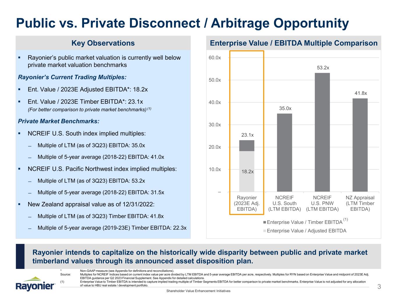 Shareholder Value Enhancement Initiatives Asset Disposition & Capital Structure Realignment Plan 2* Non-GAAP measure (see Appendix for definition).  Rayonier is targeting ~$1 billion of select asset sales over the next 18 months (including the $242 million asset sale announced today)  Asset disposition plan intended to enhance shareholder value by capturing significant disparity between public and private market timberland values  Proceeds will be used to achieve new capital structure targets and return meaningful capital to shareholders DISPOSITION PLAN TARGETING ~$1BN OF ASSET SALES  Rayonier is enhancing its credit ratio targets based on “higher for longer” rate outlook  Reducing Net Debt / Adjusted EBITDA target from ≤ 4.5x to ≤ 3.0x and Net Debt / Asset Value target from ≤ 30% to ≤ 20%  Enhanced credit ratio targets expected to improve CAD* per share and provide greater capital allocation flexibility ENHANCED CREDIT RATIO TARGETS  Sale of ~55,000 acres in Oregon for $242 million (~$4,400 per acre)  Sale price represents multiple of 42x 3-year Avg. EBITDA* (2021-23E) – a significant premium to Rayonier’s implied EBITDA* trading multiple  Proceeds used to repay $150 million of floating-rate debt and retain cash on the balance sheet for further debt retirement / return of capital to shareholders  Anticipating pro forma CAD* per share accretion of ~6% after application of proceeds DISPOSITION OF OREGON PROPERTIES