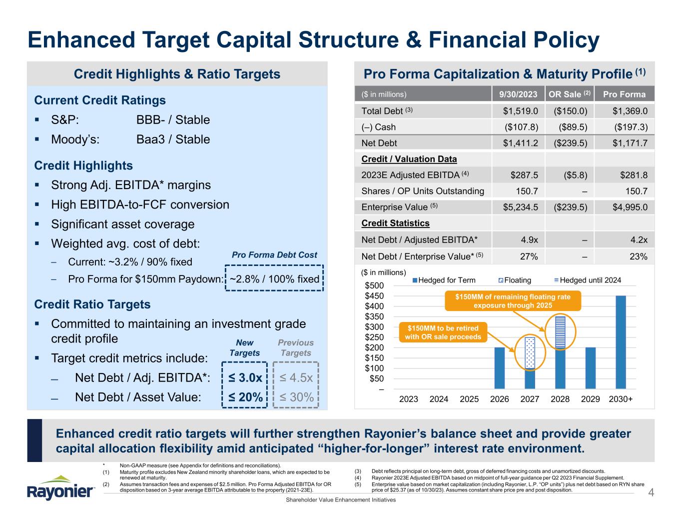 Shareholder Value Enhancement Initiatives 18.2x 23.1x 35.0x 53.2x 41.8x – 10.0x 20.0x 30.0x 40.0x 50.0x 60.0x Rayonier (2023E Adj. EBITDA) NCREIF U.S. South (LTM EBITDA) NCREIF U.S. PNW (LTM EBITDA) NZ Appraisal (LTM Timber EBITDA) Enterprise Value / Timber EBITDA Enterprise Value / Adjusted EBITDA Public vs. Private Disconnect / Arbitrage Opportunity  Rayonier’s public market valuation is currently well below private market valuation benchmarks Rayonier’s Current Trading Multiples:  Ent. Value / 2023E Adjusted EBITDA*: 18.2x  Ent. Value / 2023E Timber EBITDA*: 23.1x (For better comparison to private market benchmarks) (1) Private Market Benchmarks:  NCREIF U.S. South index implied multiples: ̶ Multiple of LTM (as of 3Q23) EBITDA: 35.0x ̶ Multiple of 5-year average (2018-22) EBITDA: 41.0x  NCREIF U.S. Pacific Northwest index implied multiples: ̶ Multiple of LTM (as of 3Q23) EBITDA: 53.2x ̶ Multiple of 5-year average (2018-22) EBITDA: 31.5x  New Zealand appraisal value as of 12/31/2022: ̶ Multiple of LTM (as of 3Q23) Timber EBITDA: 41.8x ̶ Multiple of 5-year average (2019-23E) Timber EBITDA: 22.3x 3 Key Observations Rayonier intends to capitalize on the historically wide disparity between public and private market timberland values through its announced asset disposition plan. Enterprise Value / EBITDA Multiple Comparison * Non-GAAP measure (see Appendix for definitions and reconciliations). Source: Multiples for NCREIF Indices based on current index value per acre divided by LTM EBITDA and 5-year average EBITDA per acre, respectively. Multiples for RYN based on Enterprise Value and midpoint of 2023E Adj. EBITDA guidance per Q2 2023 Financial Supplement. See Appendix for detailed calculations. (1) Enterprise Value to Timber EBITDA is intended to capture implied trading multiple of Timber Segments EBITDA for better comparison to private market benchmarks. Enterprise Value is not adjusted for any allocation of value to HBU real estate / development portfolio. (1)