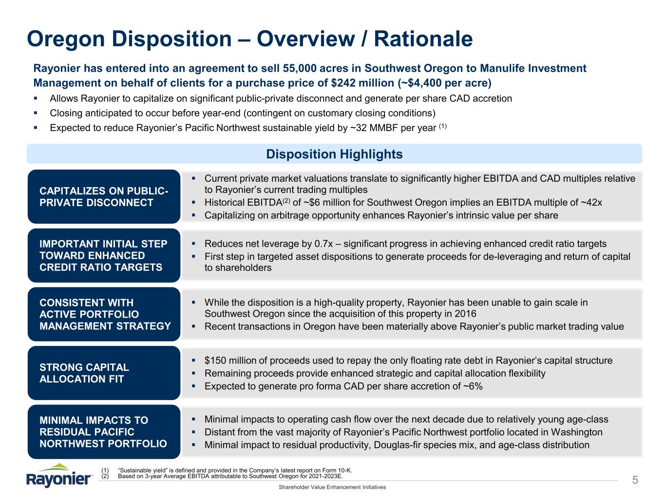 Shareholder Value Enhancement Initiatives – $50 $100 $150 $200 $250 $300 $350 $400 $450 $500 2023 2024 2025 2026 2027 2028 2029 2030+ Hedged for Term Floating Hedged until 2024 Enhanced Target Capital Structure & Financial Policy 4 Credit Highlights & Ratio Targets Enhanced credit ratio targets will further strengthen Rayonier’s balance sheet and provide greater capital allocation flexibility amid anticipated “higher-for-longer” interest rate environment. Current Credit Ratings  S&P: BBB- / Stable  Moody’s: Baa3 / Stable Credit Highlights  Strong Adj. EBITDA* margins  High EBITDA-to-FCF conversion  Significant asset coverage  Weighted avg. cost of debt: – Current: ~3.2% / 90% fixed – Pro Forma for $150mm Paydown: ~2.8% / 100% fixed Credit Ratio Targets  Committed to maintaining an investment grade credit profile  Target credit metrics include: ̶ Net Debt / Adj. EBITDA*: ≤ 3.0x ≤ 4.5x ̶ Net Debt / Asset Value: ≤ 20% ≤ 30% * Non-GAAP measure (see Appendix for definitions and reconciliations). (1) Maturity profile excludes New Zealand minority shareholder loans, which are expected to be renewed at maturity. (2) Assumes transaction fees and expenses of $2.5 million. Pro Forma Adjusted EBITDA for OR disposition based on 3-year average EBITDA attributable to the property (2021-23E). Pro Forma Capitalization & Maturity Profile (1) ($ in millions) 9/30/2023 OR Sale (2) Pro Forma Total Debt (3) $1,519.0 ($150.0) $1,369.0 (–) Cash ($107.8) ($89.5) ($197.3) Net Debt $1,411.2 ($239.5) $1,171.7 Credit / Valuation Data 2023E Adjusted EBITDA (4) $287.5 ($5.8) $281.8 Shares / OP Units Outstanding 150.7 – 150.7 Enterprise Value (5) $5,234.5 ($239.5) $4,995.0 Credit Statistics Net Debt / Adjusted EBITDA* 4.9x – 4.2x Net Debt / Enterprise Value* (5) 27% – 23% ($ in millions) $150MM to be retired with OR sale proceeds New Targets Previous Targets Pro Forma Debt Cost $150MM of remaining floating rate exposure through 2025 (3) Debt reflects principal on long-term debt, gross of deferred financing costs and unamortized discounts. (4) Rayonier 2023E Adjusted EBITDA based on midpoint of full-year guidance per Q2 2023 Financial Supplement. (5) Enterprise value based on market capitalization (including Rayonier, L.P. “OP units”) plus net debt based on RYN share price of $25.37 (as of 10/30/23). Assumes constant share price pre and post disposition.