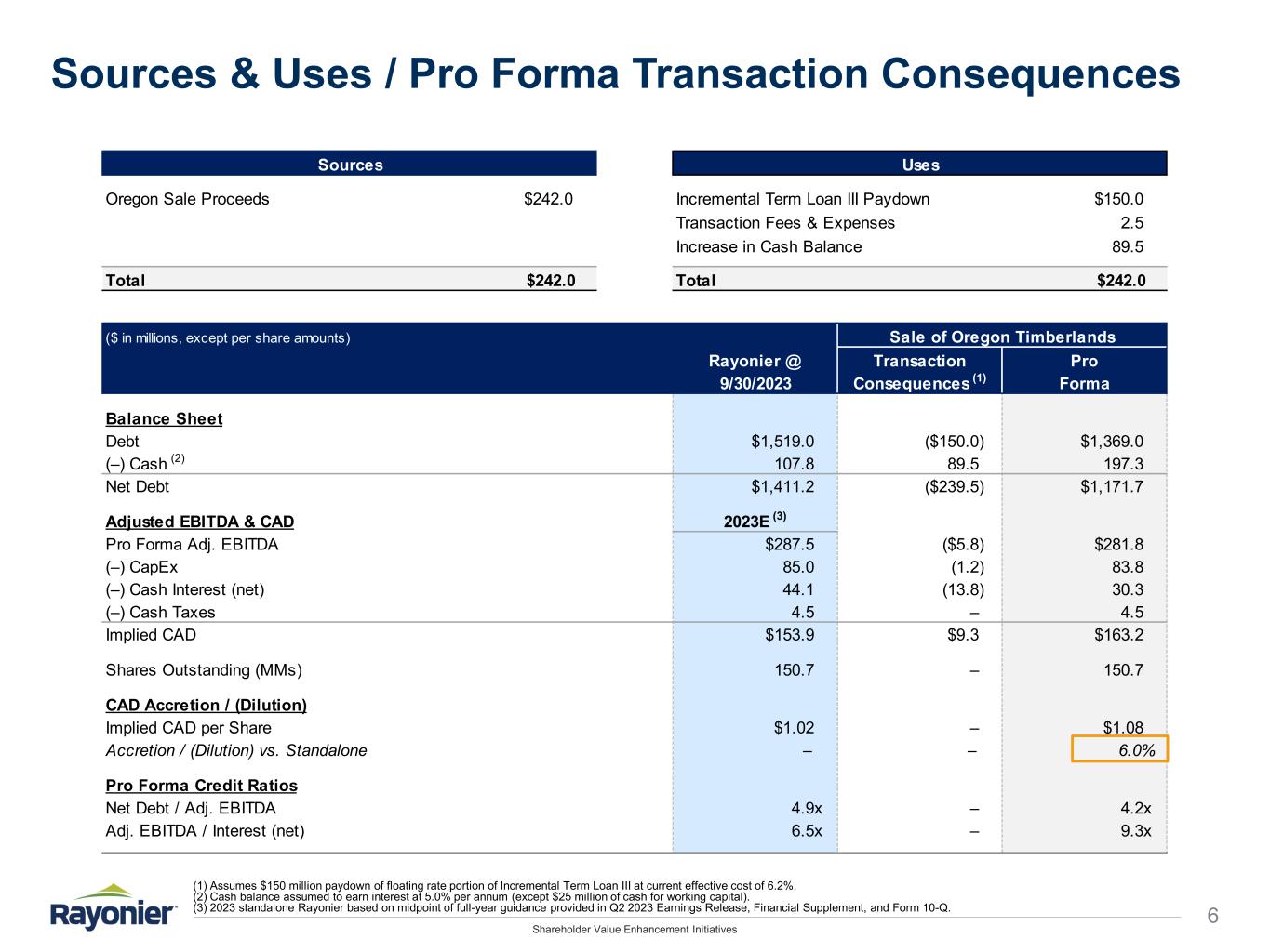Shareholder Value Enhancement Initiatives Oregon Disposition – Overview / Rationale 5  Current private market valuations translate to significantly higher EBITDA and CAD multiples relative to Rayonier’s current trading multiples  Historical EBITDA(2) of ~$6 million for Southwest Oregon implies an EBITDA multiple of ~42x  Capitalizing on arbitrage opportunity enhances Rayonier’s intrinsic value per share CAPITALIZES ON PUBLIC- PRIVATE DISCONNECT  Reduces net leverage by 0.7x – significant progress in achieving enhanced credit ratio targets  First step in targeted asset dispositions to generate proceeds for de-leveraging and return of capital to shareholders IMPORTANT INITIAL STEP TOWARD ENHANCED CREDIT RATIO TARGETS  While the disposition is a high-quality property, Rayonier has been unable to gain scale in Southwest Oregon since the acquisition of this property in 2016  Recent transactions in Oregon have been materially above Rayonier’s public market trading value CONSISTENT WITH ACTIVE PORTFOLIO MANAGEMENT STRATEGY  $150 million of proceeds used to repay the only floating rate debt in Rayonier’s capital structure  Remaining proceeds provide enhanced strategic and capital allocation flexibility  Expected to generate pro forma CAD per share accretion of ~6% STRONG CAPITAL ALLOCATION FIT  Minimal impacts to operating cash flow over the next decade due to relatively young age-class  Distant from the vast majority of Rayonier’s Pacific Northwest portfolio located in Washington  Minimal impact to residual productivity, Douglas-fir species mix, and age-class distribution MINIMAL IMPACTS TO RESIDUAL PACIFIC NORTHWEST PORTFOLIO Rayonier has entered into an agreement to sell 55,000 acres in Southwest Oregon to Manulife Investment Management on behalf of clients for a purchase price of $242 million (~$4,400 per acre)  Allows Rayonier to capitalize on significant public-private disconnect and generate per share CAD accretion  Closing anticipated to occur before year-end (contingent on customary closing conditions)  Expected to reduce Rayonier’s Pacific Northwest sustainable yield by ~32 MMBF per year (1) Disposition Highlights (1) “Sustainable yield” is defined and provided in the Company’s latest report on Form 10-K. (2) Based on 3-year Average EBITDA attributable to Southwest Oregon for 2021-2023E.
