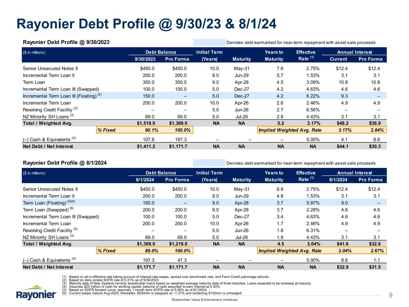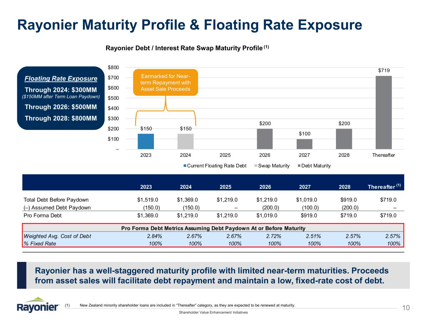 Shareholder Value Enhancement Initiatives Rayonier Debt Profile @ 9/30/23 & 8/1/24 9 (1) Based on all-in effective rate taking account of interest rate swaps, spread over benchmark rate, and Farm Credit patronage refunds. (2) Based on daily simple SOFR rate of 5.31% as of 9/30/2023. (3) Maturity date of New Zealand minority shareholder loans based on weighted average maturity date of three tranches. Loans expected to be renewed at maturity. (4) Assumes $25 million of cash for working capital; balance of cash assumed to earn interest at 5.00%. (5) Based on SOFR forward curve; assumes 1-month term SOFR rate of 5.06% as of 8/1/2024. (6) Current swaps mature Aug-2024; thereafter, $200mm is swapped at ~1.37% and remaining $150mm is unhedged. Rayonier Debt Profile @ 9/30/2023 Denotes debt earmarked for near-term repayment with asset sale proceeds ($ in millions) Debt Balance Initial Term Years to Effective Annual Interest 9/30/2023 Pro Forma (Years) Maturity Maturity Rate (1) Current Pro Forma Senior Unsecured Notes II $450.0 $450.0 10.0 May-31 7.6 2.75% $12.4 $12.4 Incremental Term Loan II 200.0 200.0 8.0 Jun-29 5.7 1.53% 3.1 3.1 Term Loan 350.0 350.0 9.0 Apr-28 4.5 3.09% 10.8 10.8 Incremental Term Loan III (Swapped) 100.0 100.0 5.0 Dec-27 4.2 4.63% 4.6 4.6 Incremental Term Loan III (Floating) (2) 150.0 – 5.0 Dec-27 4.2 6.22% 9.3 – Incremental Term Loan 200.0 200.0 10.0 Apr-26 2.6 2.46% 4.9 4.9 Revolving Credit Facility (2) – – 5.0 Jun-26 2.7 6.56% – – NZ Minority SH Loans (3) 69.0 69.0 5.0 Jul-26 2.8 4.43% 3.1 3.1 Total / Weighted Avg. $1,519.0 $1,369.0 NA NA 5.2 3.17% $48.2 $38.9 % Fixed 90.1% 100.0% Implied Weighted Avg. Rate 3.17% 2.84% (–) Cash & Equivalents (4) 107.8 197.3 – – – 5.00% 4.1 8.6 Net Debt / Net Interest $1,411.2 $1,171.7 NA NA NA NA $44.1 $30.3 Rayonier Debt Profile @ 8/1/2024 Denotes debt earmarked for near-term repayment with asset sale proceeds ($ in millions) Debt Balance Initial Term Years to Effective Annual Interest 8/1/2024 Pro Forma (Years) Maturity Maturity Rate (1) 8/1/2024 Pro Forma Senior Unsecured Notes II $450.0 $450.0 10.0 May-31 6.8 2.75% $12.4 $12.4 Incremental Term Loan II 200.0 200.0 8.0 Jun-29 4.8 1.53% 3.1 3.1 Term Loan (Floating) (5)(6) 150.0 – 9.0 Apr-28 3.7 5.97% 9.0 – Term Loan (Swapped) (6) 200.0 200.0 9.0 Apr-28 3.7 2.28% 4.6 4.6 Incremental Term Loan III (Swapped) 100.0 100.0 5.0 Dec-27 3.4 4.63% 4.6 4.6 Incremental Term Loan 200.0 200.0 10.0 Apr-26 1.7 2.46% 4.9 4.9 Revolving Credit Facility (5) – – 5.0 Jun-26 1.8 6.31% – – NZ Minority SH Loans (3) 69.0 69.0 5.0 Jul-26 1.9 4.43% 3.1 3.1 Total / Weighted Avg. $1,369.0 $1,219.0 NA NA 4.5 3.04% $41.6 $32.6 % Fixed 89.0% 100.0% Implied Weighted Avg. Rate 3.04% 2.67% (–) Cash & Equivalents (4) 197.3 47.3 – – – 5.00% 8.6 1.1 Net Debt / Net Interest $1,171.7 $1,171.7 NA NA NA NA $32.9 $31.5