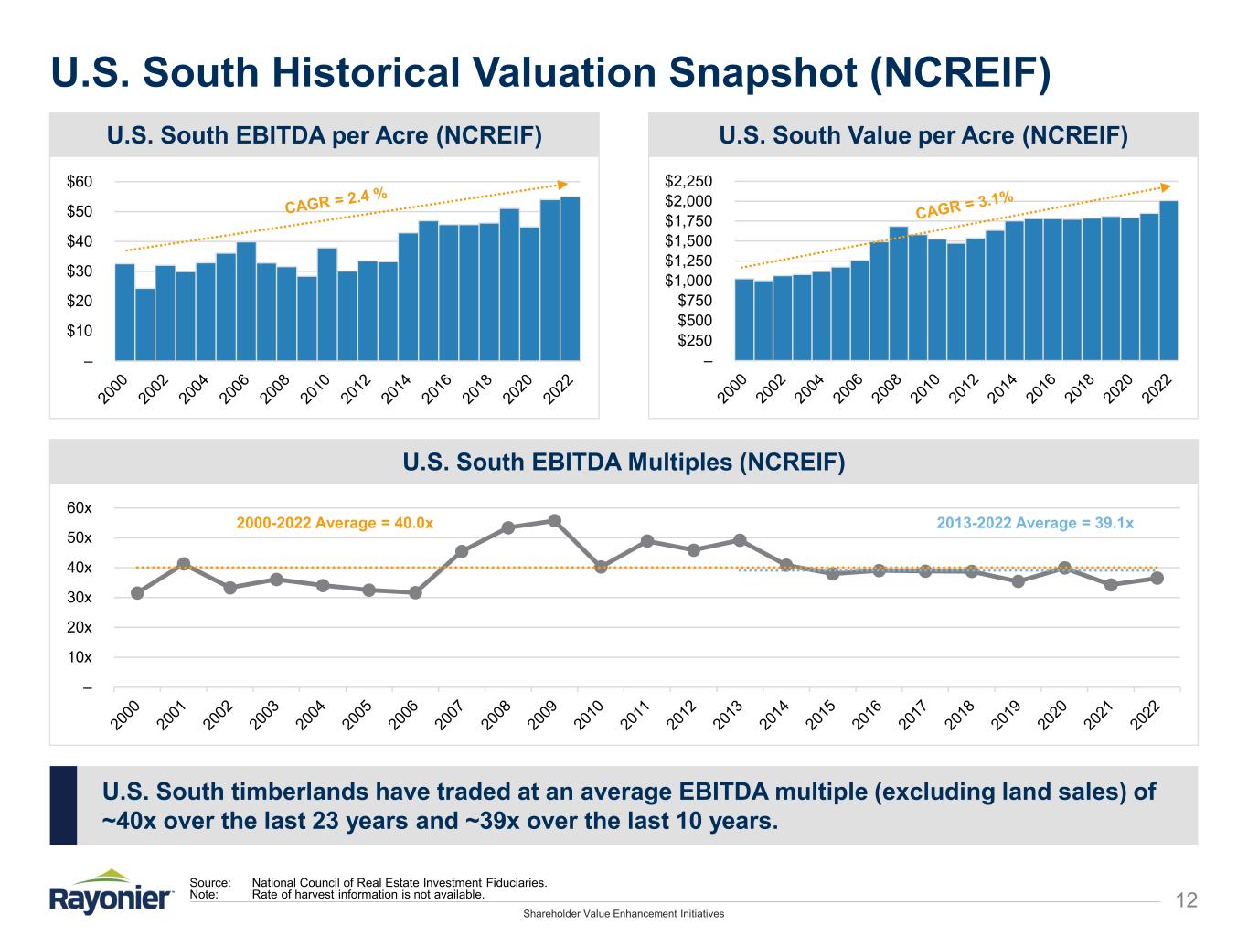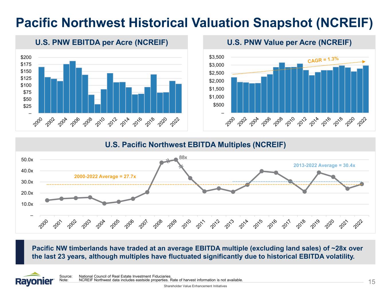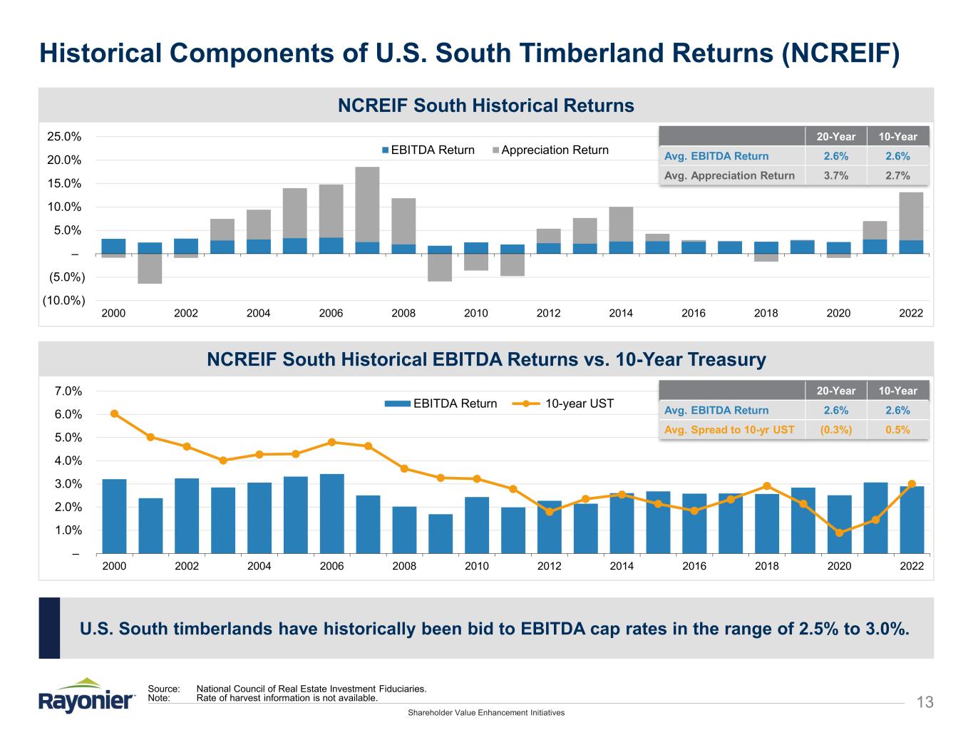 Shareholder Value Enhancement Initiatives – 10x 20x 30x 40x 50x 60x – $250 $500 $750 $1,000 $1,250 $1,500 $1,750 $2,000 $2,250 – $10 $20 $30 $40 $50 $60 U.S. South Historical Valuation Snapshot (NCREIF) 12 U.S. South EBITDA per Acre (NCREIF) U.S. South timberlands have traded at an average EBITDA multiple (excluding land sales) of ~40x over the last 23 years and ~39x over the last 10 years. Source: National Council of Real Estate Investment Fiduciaries. Note: Rate of harvest information is not available. U.S. South Value per Acre (NCREIF) U.S. South EBITDA Multiples (NCREIF) 2000-2022 Average = 40.0x 2013-2022 Average = 39.1x