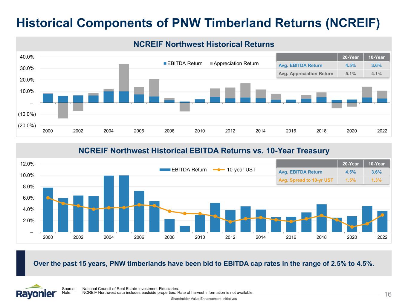 Shareholder Value Enhancement Initiatives – $500 $1,000 $1,500 $2,000 $2,500 $3,000 $3,500 – $25 $50 $75 $100 $125 $150 $175 $200 – 10.0x 20.0x 30.0x 40.0x 50.0x Pacific Northwest Historical Valuation Snapshot (NCREIF) 15 U.S. PNW EBITDA per Acre (NCREIF) Pacific NW timberlands have traded at an average EBITDA multiple (excluding land sales) of ~28x over the last 23 years, although multiples have fluctuated significantly due to historical EBITDA volatility. Source: National Council of Real Estate Investment Fiduciaries. Note: NCREIF Northwest data includes eastside properties. Rate of harvest information is not available. U.S. PNW Value per Acre (NCREIF) U.S. Pacific Northwest EBITDA Multiples (NCREIF) 2000-2022 Average = 27.7x 2013-2022 Average = 30.4x 88x