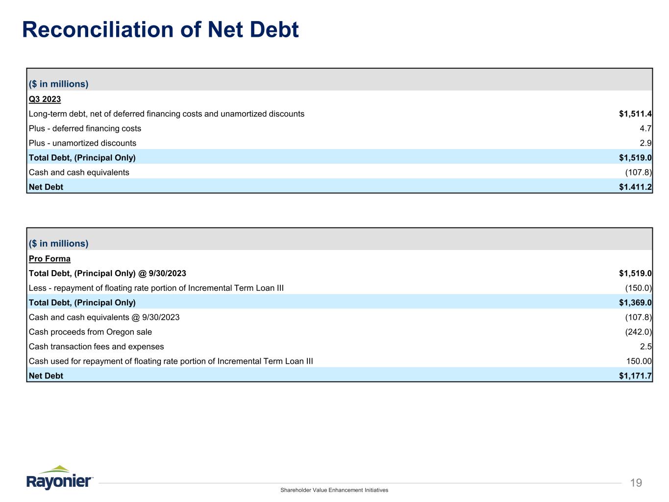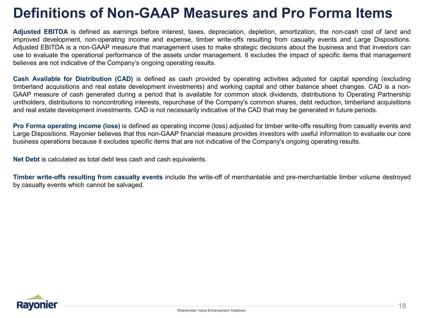 Shareholder Value Enhancement Initiatives 18 Definitions of Non-GAAP Measures and Pro Forma Items Adjusted EBITDA is defined as earnings before interest, taxes, depreciation, depletion, amortization, the non-cash cost of land and improved development, non-operating income and expense, timber write-offs resulting from casualty events and Large Dispositions. Adjusted EBITDA is a non-GAAP measure that management uses to make strategic decisions about the business and that investors can use to evaluate the operational performance of the assets under management. It excludes the impact of specific items that management believes are not indicative of the Company’s ongoing operating results. Cash Available for Distribution (CAD) is defined as cash provided by operating activities adjusted for capital spending (excluding timberland acquisitions and real estate development investments) and working capital and other balance sheet changes. CAD is a non- GAAP measure of cash generated during a period that is available for common stock dividends, distributions to Operating Partnership unitholders, distributions to noncontrolling interests, repurchase of the Company's common shares, debt reduction, timberland acquisitions and real estate development investments. CAD is not necessarily indicative of the CAD that may be generated in future periods. Pro Forma operating income (loss) is defined as operating income (loss) adjusted for timber write-offs resulting from casualty events and Large Dispositions. Rayonier believes that this non-GAAP financial measure provides investors with useful information to evaluate our core business operations because it excludes specific items that are not indicative of the Company's ongoing operating results. Net Debt is calculated as total debt less cash and cash equivalents. Timber write-offs resulting from casualty events include the write-off of merchantable and pre-merchantable timber volume destroyed by casualty events which cannot be salvaged.