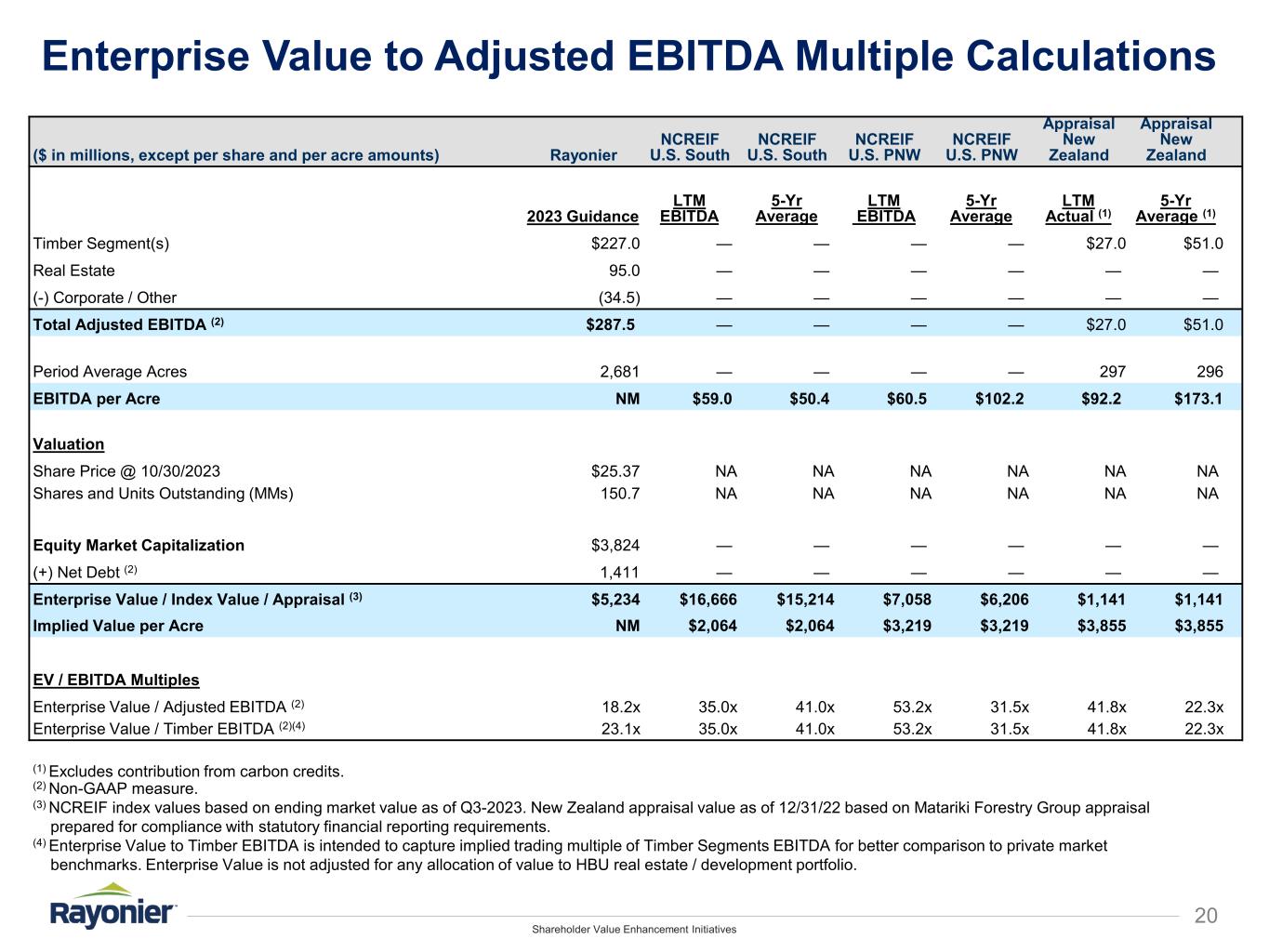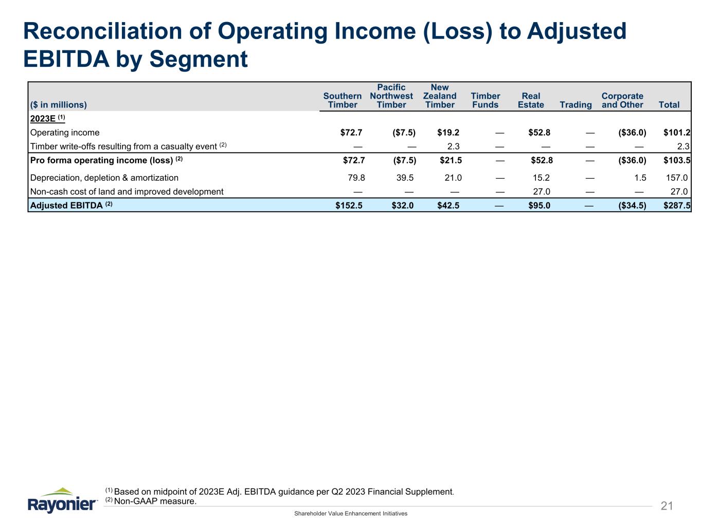 Shareholder Value Enhancement Initiatives 20 Enterprise Value to Adjusted EBITDA Multiple Calculations ($ in millions, except per share and per acre amounts) Rayonier NCREIF U.S. South NCREIF U.S. South NCREIF U.S. PNW NCREIF U.S. PNW Appraisal New Zealand Appraisal New Zealand 2023 Guidance LTM EBITDA 5-Yr Average LTM EBITDA 5-Yr Average LTM Actual (1) 5-Yr Average (1) Timber Segment(s) $227.0 — — — — $27.0 $51.0 Real Estate 95.0 — — — — — — (-) Corporate / Other (34.5) — — — — — — Total Adjusted EBITDA (2) $287.5 — — — — $27.0 $51.0 Period Average Acres 2,681 — — — — 297 296 EBITDA per Acre NM $59.0 $50.4 $60.5 $102.2 $92.2 $173.1 Valuation Share Price @ 10/30/2023 $25.37 NA NA NA NA NA NA Shares and Units Outstanding (MMs) 150.7 NA NA NA NA NA NA Equity Market Capitalization $3,824 — — — — — — (+) Net Debt (2) 1,411 — — — — — — Enterprise Value / Index Value / Appraisal (3) $5,234 $16,666 $15,214 $7,058 $6,206 $1,141 $1,141 Implied Value per Acre NM $2,064 $2,064 $3,219 $3,219 $3,855 $3,855 EV / EBITDA Multiples Enterprise Value / Adjusted EBITDA (2) 18.2x 35.0x 41.0x 53.2x 31.5x 41.8x 22.3x Enterprise Value / Timber EBITDA (2)(4) 23.1x 35.0x 41.0x 53.2x 31.5x 41.8x 22.3x (1) Excludes contribution from carbon credits. (2) Non-GAAP measure. (3) NCREIF index values based on ending market value as of Q3-2023. New Zealand appraisal value as of 12/31/22 based on Matariki Forestry Group appraisal prepared for compliance with statutory financial reporting requirements. (4) Enterprise Value to Timber EBITDA is intended to capture implied trading multiple of Timber Segments EBITDA for better comparison to private market benchmarks. Enterprise Value is not adjusted for any allocation of value to HBU real estate / development portfolio.