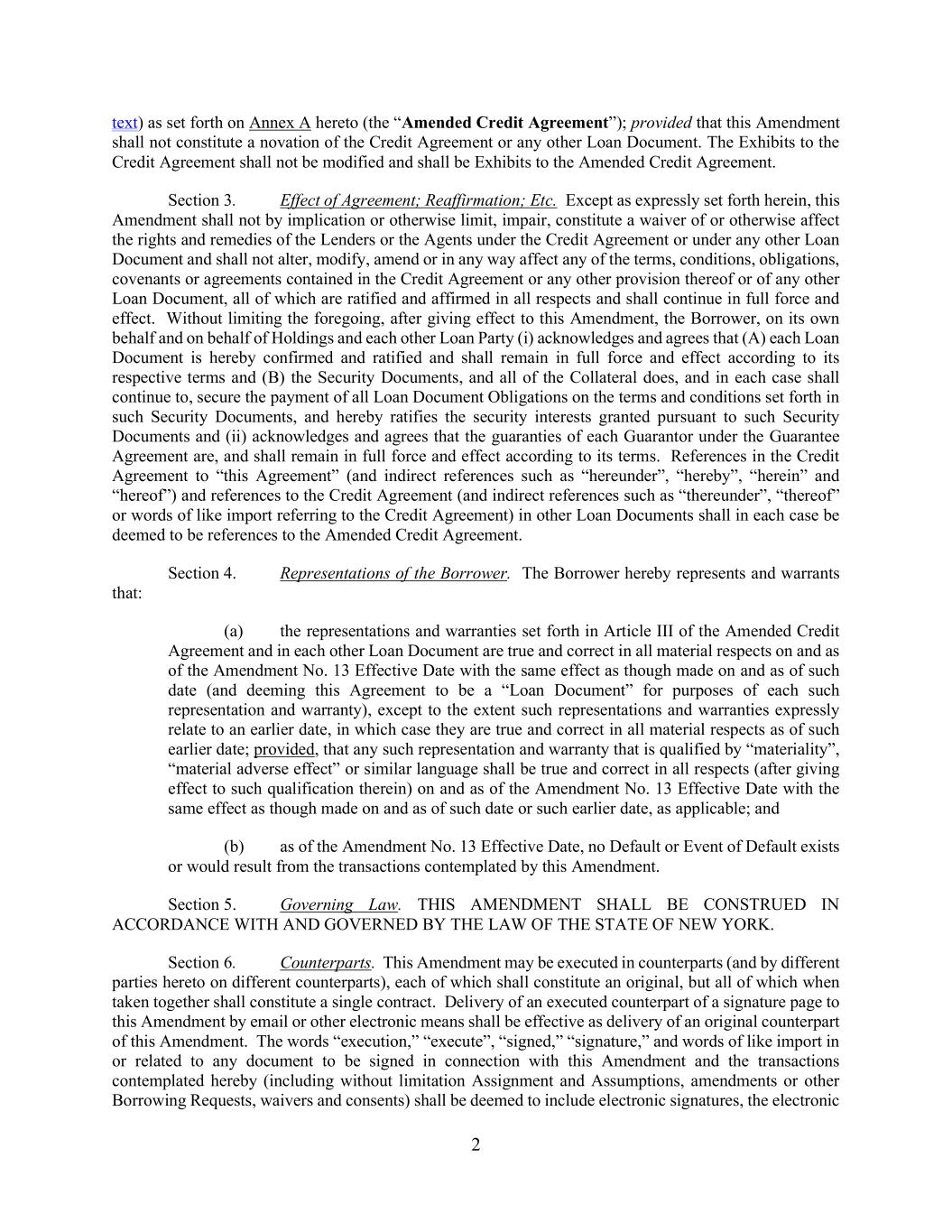 2 text) as set forth on Annex A hereto (the “Amended Credit Agreement”); provided that this Amendment shall not constitute a novation of the Credit Agreement or any other Loan Document. The Exhibits to the Credit Agreement shall not be modified and shall be Exhibits to the Amended Credit Agreement. Section 3. Effect of Agreement; Reaffirmation; Etc. Except as expressly set forth herein, this Amendment shall not by implication or otherwise limit, impair, constitute a waiver of or otherwise affect the rights and remedies of the Lenders or the Agents under the Credit Agreement or under any other Loan Document and shall not alter, modify, amend or in any way affect any of the terms, conditions, obligations, covenants or agreements contained in the Credit Agreement or any other provision thereof or of any other Loan Document, all of which are ratified and affirmed in all respects and shall continue in full force and effect. Without limiting the foregoing, after giving effect to this Amendment, the Borrower, on its own behalf and on behalf of Holdings and each other Loan Party (i) acknowledges and agrees that (A) each Loan Document is hereby confirmed and ratified and shall remain in full force and effect according to its respective terms and (B) the Security Documents, and all of the Collateral does, and in each case shall continue to, secure the payment of all Loan Document Obligations on the terms and conditions set forth in such Security Documents, and hereby ratifies the security interests granted pursuant to such Security Documents and (ii) acknowledges and agrees that the guaranties of each Guarantor under the Guarantee Agreement are, and shall remain in full force and effect according to its terms. References in the Credit Agreement to “this Agreement” (and indirect references such as “hereunder”, “hereby”, “herein” and “hereof”) and references to the Credit Agreement (and indirect references such as “thereunder”, “thereof” or words of like import referring to the Credit Agreement) in other Loan Documents shall in each case be deemed to be references to the Amended Credit Agreement. Section 4. Representations of the Borrower. The Borrower hereby represents and warrants that: (a) the representations and warranties set forth in Article III of the Amended Credit Agreement and in each other Loan Document are true and correct in all material respects on and as of the Amendment No. 13 Effective Date with the same effect as though made on and as of such date (and deeming this Agreement to be a “Loan Document” for purposes of each such representation and warranty), except to the extent such representations and warranties expressly relate to an earlier date, in which case they are true and correct in all material respects as of such earlier date; provided, that any such representation and warranty that is qualified by “materiality”, “material adverse effect” or similar language shall be true and correct in all respects (after giving effect to such qualification therein) on and as of the Amendment No. 13 Effective Date with the same effect as though made on and as of such date or such earlier date, as applicable; and (b) as of the Amendment No. 13 Effective Date, no Default or Event of Default exists or would result from the transactions contemplated by this Amendment. Section 5. Governing Law. THIS AMENDMENT SHALL BE CONSTRUED IN ACCORDANCE WITH AND GOVERNED BY THE LAW OF THE STATE OF NEW YORK. Section 6. Counterparts. This Amendment may be executed in counterparts (and by different parties hereto on different counterparts), each of which shall constitute an original, but all of which when taken together shall constitute a single contract. Delivery of an executed counterpart of a signature page to this Amendment by email or other electronic means shall be effective as delivery of an original counterpart of this Amendment. The words “execution,” “execute”, “signed,” “signature,” and words of like import in or related to any document to be signed in connection with this Amendment and the transactions contemplated hereby (including without limitation Assignment and Assumptions, amendments or other Borrowing Requests, waivers and consents) shall be deemed to include electronic signatures, the electronic