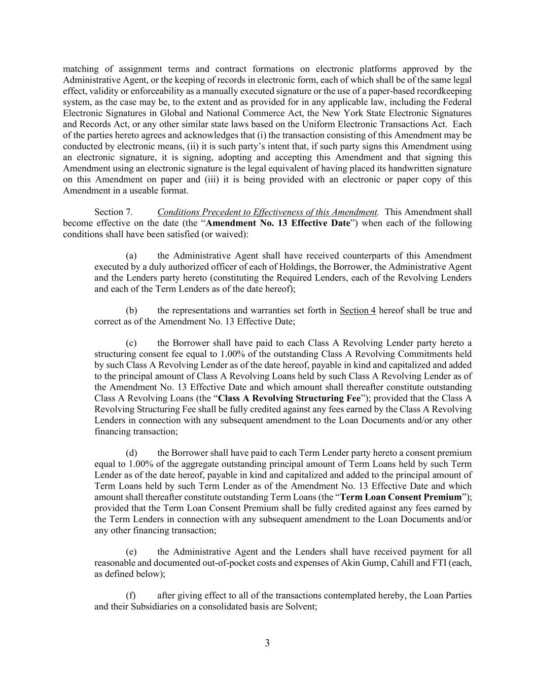 3 matching of assignment terms and contract formations on electronic platforms approved by the Administrative Agent, or the keeping of records in electronic form, each of which shall be of the same legal effect, validity or enforceability as a manually executed signature or the use of a paper-based recordkeeping system, as the case may be, to the extent and as provided for in any applicable law, including the Federal Electronic Signatures in Global and National Commerce Act, the New York State Electronic Signatures and Records Act, or any other similar state laws based on the Uniform Electronic Transactions Act. Each of the parties hereto agrees and acknowledges that (i) the transaction consisting of this Amendment may be conducted by electronic means, (ii) it is such party’s intent that, if such party signs this Amendment using an electronic signature, it is signing, adopting and accepting this Amendment and that signing this Amendment using an electronic signature is the legal equivalent of having placed its handwritten signature on this Amendment on paper and (iii) it is being provided with an electronic or paper copy of this Amendment in a useable format. Section 7. Conditions Precedent to Effectiveness of this Amendment. This Amendment shall become effective on the date (the “Amendment No. 13 Effective Date”) when each of the following conditions shall have been satisfied (or waived): (a) the Administrative Agent shall have received counterparts of this Amendment executed by a duly authorized officer of each of Holdings, the Borrower, the Administrative Agent and the Lenders party hereto (constituting the Required Lenders, each of the Revolving Lenders and each of the Term Lenders as of the date hereof); (b) the representations and warranties set forth in Section 4 hereof shall be true and correct as of the Amendment No. 13 Effective Date; (c) the Borrower shall have paid to each Class A Revolving Lender party hereto a structuring consent fee equal to 1.00% of the outstanding Class A Revolving Commitments held by such Class A Revolving Lender as of the date hereof, payable in kind and capitalized and added to the principal amount of Class A Revolving Loans held by such Class A Revolving Lender as of the Amendment No. 13 Effective Date and which amount shall thereafter constitute outstanding Class A Revolving Loans (the “Class A Revolving Structuring Fee”); provided that the Class A Revolving Structuring Fee shall be fully credited against any fees earned by the Class A Revolving Lenders in connection with any subsequent amendment to the Loan Documents and/or any other financing transaction; (d) the Borrower shall have paid to each Term Lender party hereto a consent premium equal to 1.00% of the aggregate outstanding principal amount of Term Loans held by such Term Lender as of the date hereof, payable in kind and capitalized and added to the principal amount of Term Loans held by such Term Lender as of the Amendment No. 13 Effective Date and which amount shall thereafter constitute outstanding Term Loans (the “Term Loan Consent Premium”); provided that the Term Loan Consent Premium shall be fully credited against any fees earned by the Term Lenders in connection with any subsequent amendment to the Loan Documents and/or any other financing transaction; (e) the Administrative Agent and the Lenders shall have received payment for all reasonable and documented out-of-pocket costs and expenses of Akin Gump, Cahill and FTI (each, as defined below); (f) after giving effect to all of the transactions contemplated hereby, the Loan Parties and their Subsidiaries on a consolidated basis are Solvent;