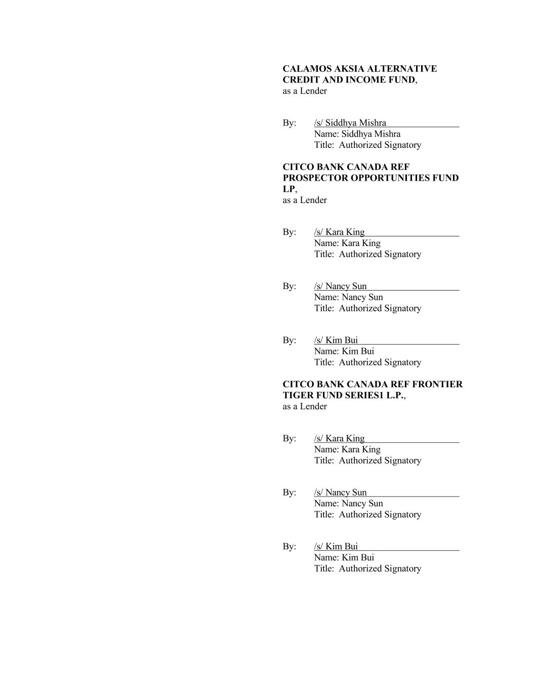 CALAMOS AKSIA ALTERNATIVE CREDIT AND INCOME FUND, as a Lender By: /s/ Siddhya Mishra Name: Siddhya Mishra Title: Authorized Signatory CITCO BANK CANADA REF PROSPECTOR OPPORTUNITIES FUND LP, as a Lender By: /s/ Kara King Name: Kara King Title: Authorized Signatory By: /s/ Nancy Sun Name: Nancy Sun Title: Authorized Signatory By: /s/ Kim Bui Name: Kim Bui Title: Authorized Signatory CITCO BANK CANADA REF FRONTIER TIGER FUND SERIES1 L.P., as a Lender By: /s/ Kara King Name: Kara King Title: Authorized Signatory By: /s/ Nancy Sun Name: Nancy Sun Title: Authorized Signatory By: /s/ Kim Bui Name: Kim Bui Title: Authorized Signatory