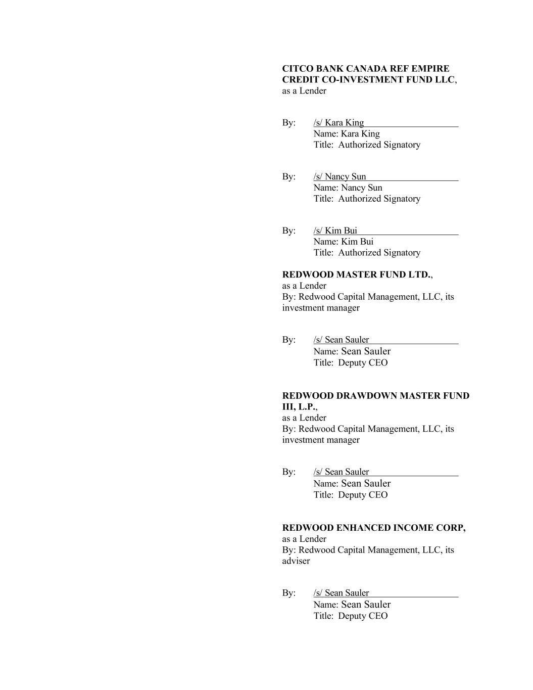 CITCO BANK CANADA REF EMPIRE CREDIT CO-INVESTMENT FUND LLC, as a Lender By: /s/ Kara King Name: Kara King Title: Authorized Signatory By: /s/ Nancy Sun Name: Nancy Sun Title: Authorized Signatory By: /s/ Kim Bui Name: Kim Bui Title: Authorized Signatory REDWOOD MASTER FUND LTD., as a Lender By: Redwood Capital Management, LLC, its investment manager By: /s/ Sean Sauler Name: Sean Sauler Title: Deputy CEO REDWOOD DRAWDOWN MASTER FUND III, L.P., as a Lender By: Redwood Capital Management, LLC, its investment manager By: /s/ Sean Sauler Name: Sean Sauler Title: Deputy CEO REDWOOD ENHANCED INCOME CORP, as a Lender By: Redwood Capital Management, LLC, its adviser By: /s/ Sean Sauler Name: Sean Sauler Title: Deputy CEO