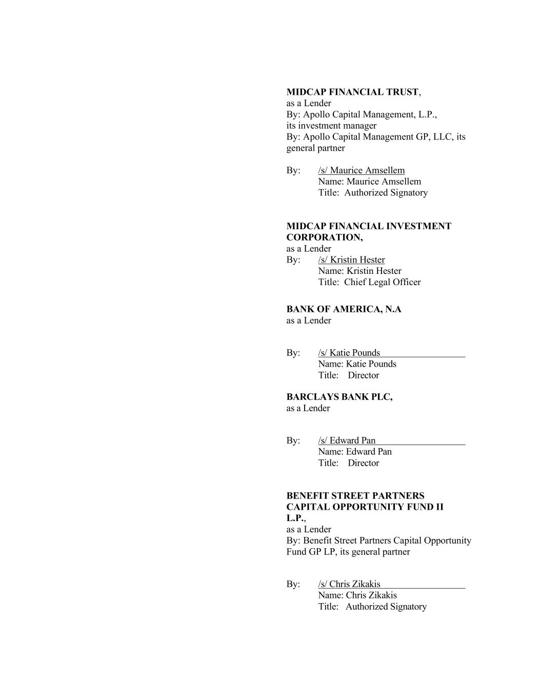 MIDCAP FINANCIAL TRUST, as a Lender By: Apollo Capital Management, L.P., its investment manager By: Apollo Capital Management GP, LLC, its general partner By: /s/ Maurice Amsellem Name: Maurice Amsellem Title: Authorized Signatory MIDCAP FINANCIAL INVESTMENT CORPORATION, as a Lender By: /s/ Kristin Hester Name: Kristin Hester Title: Chief Legal Officer BANK OF AMERICA, N.A as a Lender By: /s/ Katie Pounds Name: Katie Pounds Title: Director BARCLAYS BANK PLC, as a Lender By: /s/ Edward Pan Name: Edward Pan Title: Director BENEFIT STREET PARTNERS CAPITAL OPPORTUNITY FUND II L.P., as a Lender By: Benefit Street Partners Capital Opportunity Fund GP LP, its general partner By: /s/ Chris Zikakis Name: Chris Zikakis Title: Authorized Signatory
