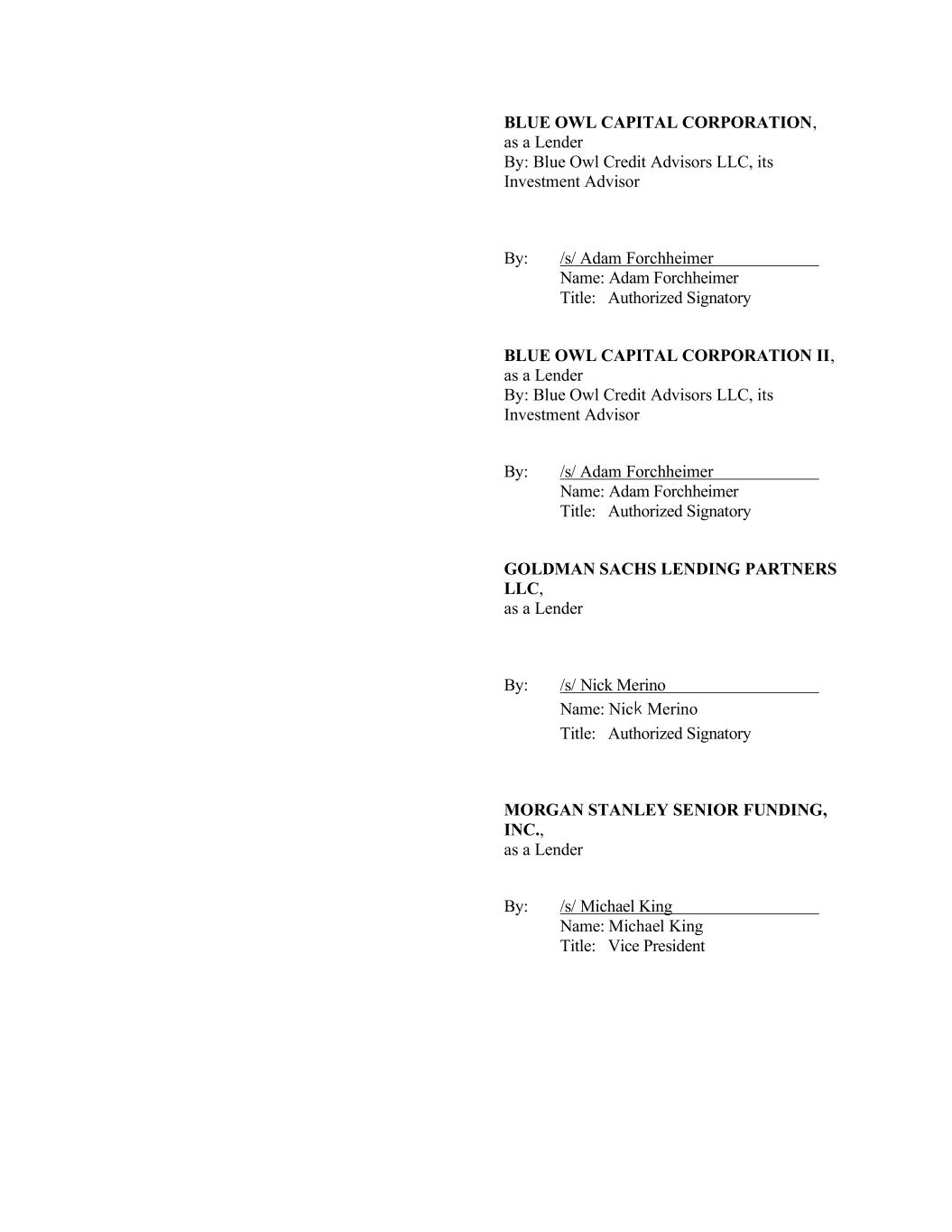 BLUE OWL CAPITAL CORPORATION, as a Lender By: Blue Owl Credit Advisors LLC, its Investment Advisor By: /s/ Adam Forchheimer Name: Adam Forchheimer Title: Authorized Signatory BLUE OWL CAPITAL CORPORATION II, as a Lender By: Blue Owl Credit Advisors LLC, its Investment Advisor By: /s/ Adam Forchheimer Name: Adam Forchheimer Title: Authorized Signatory GOLDMAN SACHS LENDING PARTNERS LLC, as a Lender By: /s/ Nick Merino Name: Nick Merino Title: Authorized Signatory MORGAN STANLEY SENIOR FUNDING, INC., as a Lender By: /s/ Michael King Name: Michael King Title: Vice President