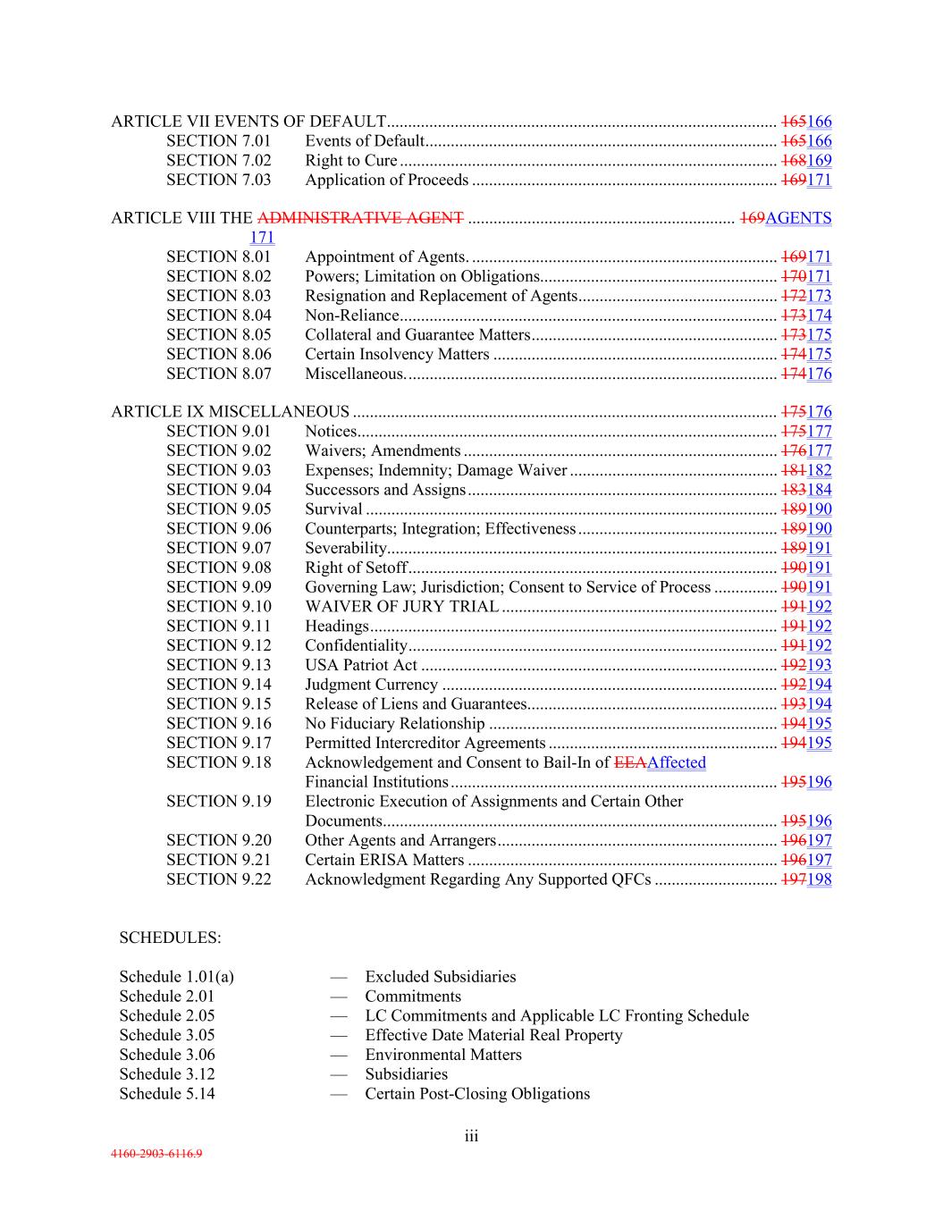 iii 4160-2903-6116.9 ARTICLE VII EVENTS OF DEFAULT ............................................................................................ 165166 SECTION 7.01 Events of Default ................................................................................... 165166 SECTION 7.02 Right to Cure ......................................................................................... 168169 SECTION 7.03 Application of Proceeds ........................................................................ 169171 ARTICLE VIII THE ADMINISTRATIVE AGENT ............................................................... 169AGENTS 171 SECTION 8.01 Appointment of Agents. ........................................................................ 169171 SECTION 8.02 Powers; Limitation on Obligations........................................................ 170171 SECTION 8.03 Resignation and Replacement of Agents ............................................... 172173 SECTION 8.04 Non-Reliance ......................................................................................... 173174 SECTION 8.05 Collateral and Guarantee Matters .......................................................... 173175 SECTION 8.06 Certain Insolvency Matters ................................................................... 174175 SECTION 8.07 Miscellaneous. ....................................................................................... 174176 ARTICLE IX MISCELLANEOUS .................................................................................................... 175176 SECTION 9.01 Notices ................................................................................................... 175177 SECTION 9.02 Waivers; Amendments .......................................................................... 176177 SECTION 9.03 Expenses; Indemnity; Damage Waiver ................................................. 181182 SECTION 9.04 Successors and Assigns ......................................................................... 183184 SECTION 9.05 Survival ................................................................................................. 189190 SECTION 9.06 Counterparts; Integration; Effectiveness ............................................... 189190 SECTION 9.07 Severability............................................................................................ 189191 SECTION 9.08 Right of Setoff ....................................................................................... 190191 SECTION 9.09 Governing Law; Jurisdiction; Consent to Service of Process ............... 190191 SECTION 9.10 WAIVER OF JURY TRIAL ................................................................. 191192 SECTION 9.11 Headings ................................................................................................ 191192 SECTION 9.12 Confidentiality ....................................................................................... 191192 SECTION 9.13 USA Patriot Act .................................................................................... 192193 SECTION 9.14 Judgment Currency ............................................................................... 192194 SECTION 9.15 Release of Liens and Guarantees ........................................................... 193194 SECTION 9.16 No Fiduciary Relationship .................................................................... 194195 SECTION 9.17 Permitted Intercreditor Agreements ...................................................... 194195 SECTION 9.18 Acknowledgement and Consent to Bail-In of EEAAffected Financial Institutions ............................................................................. 195196 SECTION 9.19 Electronic Execution of Assignments and Certain Other Documents ............................................................................................. 195196 SECTION 9.20 Other Agents and Arrangers .................................................................. 196197 SECTION 9.21 Certain ERISA Matters ......................................................................... 196197 SECTION 9.22 Acknowledgment Regarding Any Supported QFCs ............................. 197198 SCHEDULES: Schedule 1.01(a) — Excluded Subsidiaries Schedule 2.01 — Commitments Schedule 2.05 — LC Commitments and Applicable LC Fronting Schedule Schedule 3.05 — Effective Date Material Real Property Schedule 3.06 — Environmental Matters Schedule 3.12 — Subsidiaries Schedule 5.14 — Certain Post-Closing Obligations