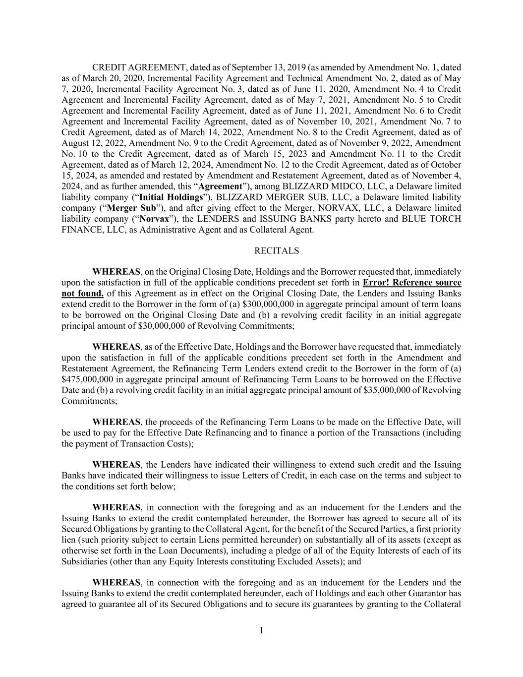 1 CREDIT AGREEMENT, dated as of September 13, 2019 (as amended by Amendment No. 1, dated as of March 20, 2020, Incremental Facility Agreement and Technical Amendment No. 2, dated as of May 7, 2020, Incremental Facility Agreement No. 3, dated as of June 11, 2020, Amendment No. 4 to Credit Agreement and Incremental Facility Agreement, dated as of May 7, 2021, Amendment No. 5 to Credit Agreement and Incremental Facility Agreement, dated as of June 11, 2021, Amendment No. 6 to Credit Agreement and Incremental Facility Agreement, dated as of November 10, 2021, Amendment No. 7 to Credit Agreement, dated as of March 14, 2022, Amendment No. 8 to the Credit Agreement, dated as of August 12, 2022, Amendment No. 9 to the Credit Agreement, dated as of November 9, 2022, Amendment No. 10 to the Credit Agreement, dated as of March 15, 2023 and Amendment No. 11 to the Credit Agreement, dated as of March 12, 2024, Amendment No. 12 to the Credit Agreement, dated as of October 15, 2024, as amended and restated by Amendment and Restatement Agreement, dated as of November 4, 2024, and as further amended, this “Agreement”), among BLIZZARD MIDCO, LLC, a Delaware limited liability company (“Initial Holdings”), BLIZZARD MERGER SUB, LLC, a Delaware limited liability company (“Merger Sub”), and after giving effect to the Merger, NORVAX, LLC, a Delaware limited liability company (“Norvax”), the LENDERS and ISSUING BANKS party hereto and BLUE TORCH FINANCE, LLC, as Administrative Agent and as Collateral Agent. RECITALS WHEREAS, on the Original Closing Date, Holdings and the Borrower requested that, immediately upon the satisfaction in full of the applicable conditions precedent set forth in Error! Reference source not found. of this Agreement as in effect on the Original Closing Date, the Lenders and Issuing Banks extend credit to the Borrower in the form of (a) $300,000,000 in aggregate principal amount of term loans to be borrowed on the Original Closing Date and (b) a revolving credit facility in an initial aggregate principal amount of $30,000,000 of Revolving Commitments; WHEREAS, as of the Effective Date, Holdings and the Borrower have requested that, immediately upon the satisfaction in full of the applicable conditions precedent set forth in the Amendment and Restatement Agreement, the Refinancing Term Lenders extend credit to the Borrower in the form of (a) $475,000,000 in aggregate principal amount of Refinancing Term Loans to be borrowed on the Effective Date and (b) a revolving credit facility in an initial aggregate principal amount of $35,000,000 of Revolving Commitments; WHEREAS, the proceeds of the Refinancing Term Loans to be made on the Effective Date, will be used to pay for the Effective Date Refinancing and to finance a portion of the Transactions (including the payment of Transaction Costs); WHEREAS, the Lenders have indicated their willingness to extend such credit and the Issuing Banks have indicated their willingness to issue Letters of Credit, in each case on the terms and subject to the conditions set forth below; WHEREAS, in connection with the foregoing and as an inducement for the Lenders and the Issuing Banks to extend the credit contemplated hereunder, the Borrower has agreed to secure all of its Secured Obligations by granting to the Collateral Agent, for the benefit of the Secured Parties, a first priority lien (such priority subject to certain Liens permitted hereunder) on substantially all of its assets (except as otherwise set forth in the Loan Documents), including a pledge of all of the Equity Interests of each of its Subsidiaries (other than any Equity Interests constituting Excluded Assets); and WHEREAS, in connection with the foregoing and as an inducement for the Lenders and the Issuing Banks to extend the credit contemplated hereunder, each of Holdings and each other Guarantor has agreed to guarantee all of its Secured Obligations and to secure its guarantees by granting to the Collateral