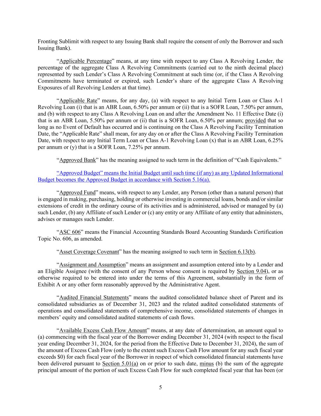 5 Fronting Sublimit with respect to any Issuing Bank shall require the consent of only the Borrower and such Issuing Bank). “Applicable Percentage” means, at any time with respect to any Class A Revolving Lender, the percentage of the aggregate Class A Revolving Commitments (carried out to the ninth decimal place) represented by such Lender’s Class A Revolving Commitment at such time (or, if the Class A Revolving Commitments have terminated or expired, such Lender’s share of the aggregate Class A Revolving Exposures of all Revolving Lenders at that time). “Applicable Rate” means, for any day, (a) with respect to any Initial Term Loan or Class A-1 Revolving Loan (i) that is an ABR Loan, 6.50% per annum or (ii) that is a SOFR Loan, 7.50% per annum, and (b) with respect to any Class A Revolving Loan on and after the Amendment No. 11 Effective Date (i) that is an ABR Loan, 5.50% per annum or (ii) that is a SOFR Loan, 6.50% per annum; provided that so long as no Event of Default has occurred and is continuing on the Class A Revolving Facility Termination Date, the “Applicable Rate” shall mean, for any day on or after the Class A Revolving Facility Termination Date, with respect to any Initial Term Loan or Class A-1 Revolving Loan (x) that is an ABR Loan, 6.25% per annum or (y) that is a SOFR Loan, 7.25% per annum. “Approved Bank” has the meaning assigned to such term in the definition of “Cash Equivalents.” “Approved Budget” means the Initial Budget until such time (if any) as any Updated Informational Budget becomes the Approved Budget in accordance with Section 5.16(a). “Approved Fund” means, with respect to any Lender, any Person (other than a natural person) that is engaged in making, purchasing, holding or otherwise investing in commercial loans, bonds and/or similar extensions of credit in the ordinary course of its activities and is administered, advised or managed by (a) such Lender, (b) any Affiliate of such Lender or (c) any entity or any Affiliate of any entity that administers, advises or manages such Lender. “ASC 606” means the Financial Accounting Standards Board Accounting Standards Certification Topic No. 606, as amended. “Asset Coverage Covenant” has the meaning assigned to such term in Section 6.13(b). “Assignment and Assumption” means an assignment and assumption entered into by a Lender and an Eligible Assignee (with the consent of any Person whose consent is required by Section 9.04), or as otherwise required to be entered into under the terms of this Agreement, substantially in the form of Exhibit A or any other form reasonably approved by the Administrative Agent. “Audited Financial Statements” means the audited consolidated balance sheet of Parent and its consolidated subsidiaries as of December 31, 2023 and the related audited consolidated statements of operations and consolidated statements of comprehensive income, consolidated statements of changes in members’ equity and consolidated audited statements of cash flows. “Available Excess Cash Flow Amount” means, at any date of determination, an amount equal to (a) commencing with the fiscal year of the Borrower ending December 31, 2024 (with respect to the fiscal year ending December 31, 2024, for the period from the Effective Date to December 31, 2024), the sum of the amount of Excess Cash Flow (only to the extent such Excess Cash Flow amount for any such fiscal year exceeds $0) for each fiscal year of the Borrower in respect of which consolidated financial statements have been delivered pursuant to Section 5.01(a) on or prior to such date, minus (b) the sum of the aggregate principal amount of the portion of such Excess Cash Flow for such completed fiscal year that has been (or