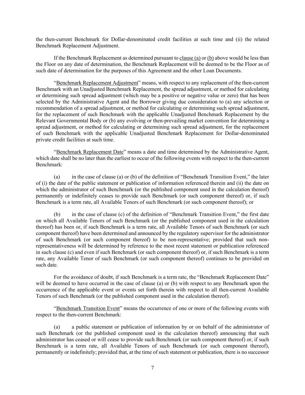 7 the then-current Benchmark for Dollar-denominated credit facilities at such time and (ii) the related Benchmark Replacement Adjustment. If the Benchmark Replacement as determined pursuant to clause (a) or (b) above would be less than the Floor on any date of determination, the Benchmark Replacement will be deemed to be the Floor as of such date of determination for the purposes of this Agreement and the other Loan Documents. “Benchmark Replacement Adjustment” means, with respect to any replacement of the then-current Benchmark with an Unadjusted Benchmark Replacement, the spread adjustment, or method for calculating or determining such spread adjustment (which may be a positive or negative value or zero) that has been selected by the Administrative Agent and the Borrower giving due consideration to (a) any selection or recommendation of a spread adjustment, or method for calculating or determining such spread adjustment, for the replacement of such Benchmark with the applicable Unadjusted Benchmark Replacement by the Relevant Governmental Body or (b) any evolving or then-prevailing market convention for determining a spread adjustment, or method for calculating or determining such spread adjustment, for the replacement of such Benchmark with the applicable Unadjusted Benchmark Replacement for Dollar-denominated private credit facilities at such time. “Benchmark Replacement Date” means a date and time determined by the Administrative Agent, which date shall be no later than the earliest to occur of the following events with respect to the then-current Benchmark: (a) in the case of clause (a) or (b) of the definition of “Benchmark Transition Event,” the later of (i) the date of the public statement or publication of information referenced therein and (ii) the date on which the administrator of such Benchmark (or the published component used in the calculation thereof) permanently or indefinitely ceases to provide such Benchmark (or such component thereof) or, if such Benchmark is a term rate, all Available Tenors of such Benchmark (or such component thereof); or (b) in the case of clause (c) of the definition of “Benchmark Transition Event,” the first date on which all Available Tenors of such Benchmark (or the published component used in the calculation thereof) has been or, if such Benchmark is a term rate, all Available Tenors of such Benchmark (or such component thereof) have been determined and announced by the regulatory supervisor for the administrator of such Benchmark (or such component thereof) to be non-representative; provided that such non- representativeness will be determined by reference to the most recent statement or publication referenced in such clause (c) and even if such Benchmark (or such component thereof) or, if such Benchmark is a term rate, any Available Tenor of such Benchmark (or such component thereof) continues to be provided on such date. For the avoidance of doubt, if such Benchmark is a term rate, the “Benchmark Replacement Date” will be deemed to have occurred in the case of clause (a) or (b) with respect to any Benchmark upon the occurrence of the applicable event or events set forth therein with respect to all then-current Available Tenors of such Benchmark (or the published component used in the calculation thereof). “Benchmark Transition Event” means the occurrence of one or more of the following events with respect to the then-current Benchmark: (a) a public statement or publication of information by or on behalf of the administrator of such Benchmark (or the published component used in the calculation thereof) announcing that such administrator has ceased or will cease to provide such Benchmark (or such component thereof) or, if such Benchmark is a term rate, all Available Tenors of such Benchmark (or such component thereof), permanently or indefinitely; provided that, at the time of such statement or publication, there is no successor
