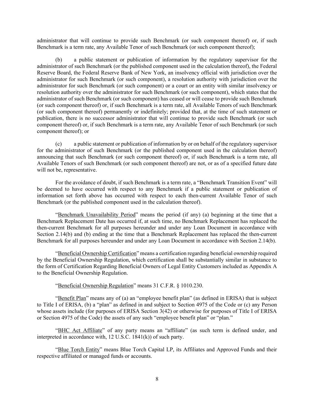 8 administrator that will continue to provide such Benchmark (or such component thereof) or, if such Benchmark is a term rate, any Available Tenor of such Benchmark (or such component thereof); (b) a public statement or publication of information by the regulatory supervisor for the administrator of such Benchmark (or the published component used in the calculation thereof), the Federal Reserve Board, the Federal Reserve Bank of New York, an insolvency official with jurisdiction over the administrator for such Benchmark (or such component), a resolution authority with jurisdiction over the administrator for such Benchmark (or such component) or a court or an entity with similar insolvency or resolution authority over the administrator for such Benchmark (or such component), which states that the administrator of such Benchmark (or such component) has ceased or will cease to provide such Benchmark (or such component thereof) or, if such Benchmark is a term rate, all Available Tenors of such Benchmark (or such component thereof) permanently or indefinitely; provided that, at the time of such statement or publication, there is no successor administrator that will continue to provide such Benchmark (or such component thereof) or, if such Benchmark is a term rate, any Available Tenor of such Benchmark (or such component thereof); or (c) a public statement or publication of information by or on behalf of the regulatory supervisor for the administrator of such Benchmark (or the published component used in the calculation thereof) announcing that such Benchmark (or such component thereof) or, if such Benchmark is a term rate, all Available Tenors of such Benchmark (or such component thereof) are not, or as of a specified future date will not be, representative. For the avoidance of doubt, if such Benchmark is a term rate, a “Benchmark Transition Event” will be deemed to have occurred with respect to any Benchmark if a public statement or publication of information set forth above has occurred with respect to each then-current Available Tenor of such Benchmark (or the published component used in the calculation thereof). “Benchmark Unavailability Period” means the period (if any) (a) beginning at the time that a Benchmark Replacement Date has occurred if, at such time, no Benchmark Replacement has replaced the then-current Benchmark for all purposes hereunder and under any Loan Document in accordance with Section 2.14(b) and (b) ending at the time that a Benchmark Replacement has replaced the then-current Benchmark for all purposes hereunder and under any Loan Document in accordance with Section 2.14(b). “Beneficial Ownership Certification” means a certification regarding beneficial ownership required by the Beneficial Ownership Regulation, which certification shall be substantially similar in substance to the form of Certification Regarding Beneficial Owners of Legal Entity Customers included as Appendix A to the Beneficial Ownership Regulation. “Beneficial Ownership Regulation” means 31 C.F.R. § 1010.230. “Benefit Plan” means any of (a) an “employee benefit plan” (as defined in ERISA) that is subject to Title I of ERISA, (b) a “plan” as defined in and subject to Section 4975 of the Code or (c) any Person whose assets include (for purposes of ERISA Section 3(42) or otherwise for purposes of Title I of ERISA or Section 4975 of the Code) the assets of any such “employee benefit plan” or “plan.” “BHC Act Affiliate” of any party means an “affiliate” (as such term is defined under, and interpreted in accordance with, 12 U.S.C. 1841(k)) of such party. “Blue Torch Entity” means Blue Torch Capital LP, its Affiliates and Approved Funds and their respective affiliated or managed funds or accounts.